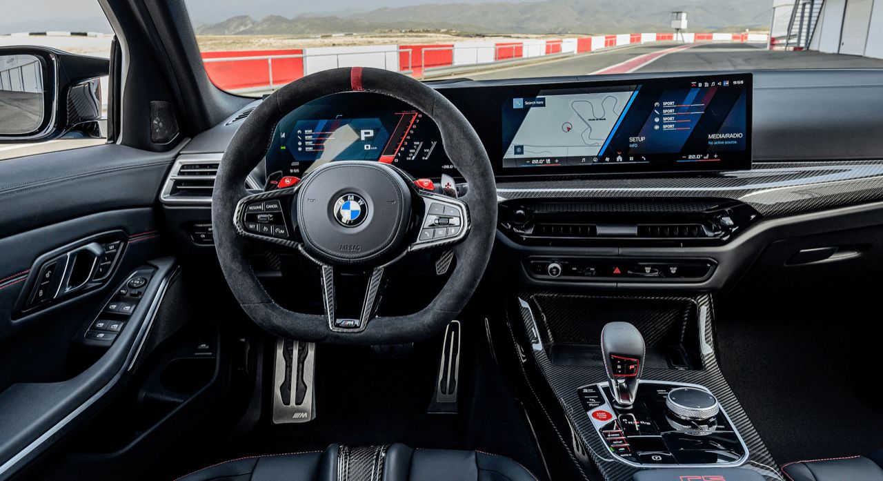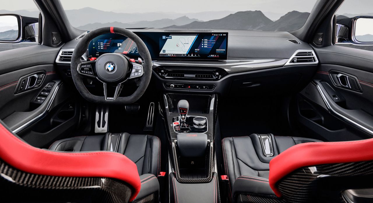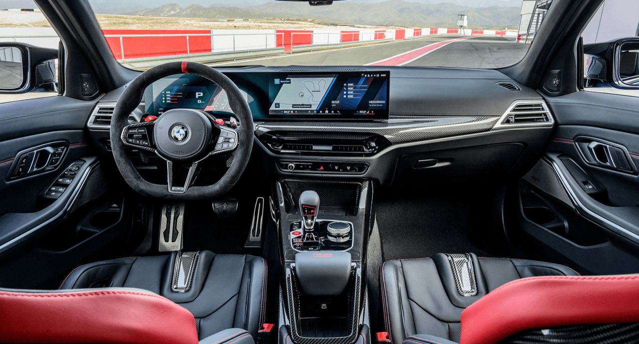 ภายใน M3 CS Touring ยังคงเอกลักษณ์ของ CS ไว้อย่างชัดเจน งานตกแต่งภายในราคาแพงด้วยหนัง Merino สีดำ/แดง พวงมาลัย M Alcantara เครื่องหมายตรงกลางวงพวงมาลัยสีแดงที่ตำแหน่ง 12 นาฬิกา เป็นการยกย่อง DNA ของรถแข่ง ตราสัญลักษณ์ CS ถูกติดไว้อย่างภาคภูมิทั่วทั้งคัน ตอกย้ำสถานะรถ M Car รุ่นที่ผลิตในจำนวนจำกัดแค่นิดเดียวและแพงแสบไส้ราวกับ Porsche 911 ในด้านเทคโนโลยีการควบคุมองคาพยบ iDrive 8.5 มาพร้อมฟีเจอร์อินโฟเทนเมนต์ การเชื่อมต่อใหม่ล่าสุดของ BMW การปรับตั้งค่าต่างๆ ระบบสั่งงานด้วยเสียงที่ไม่ควรจะมี รวมถึงโหมดที่ทำให้เชื่องมือและไม่ดังเมื่อขับในเมือง