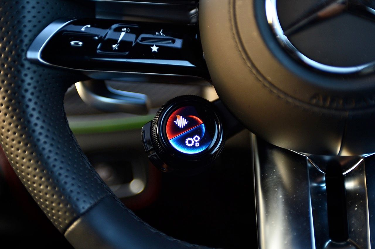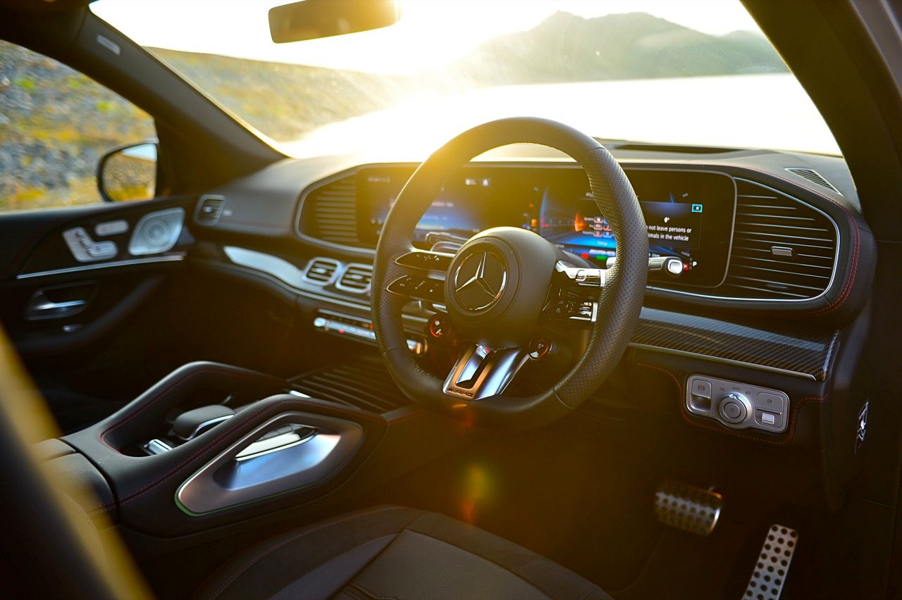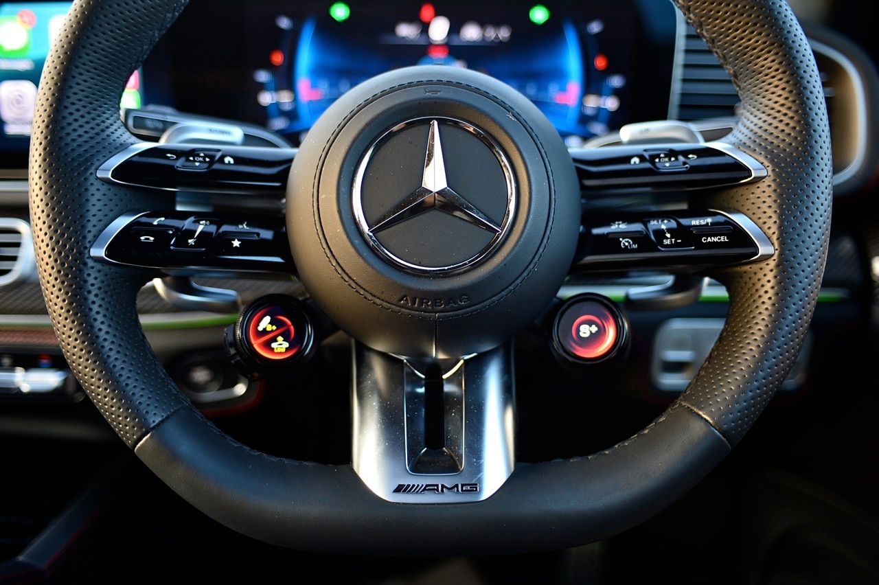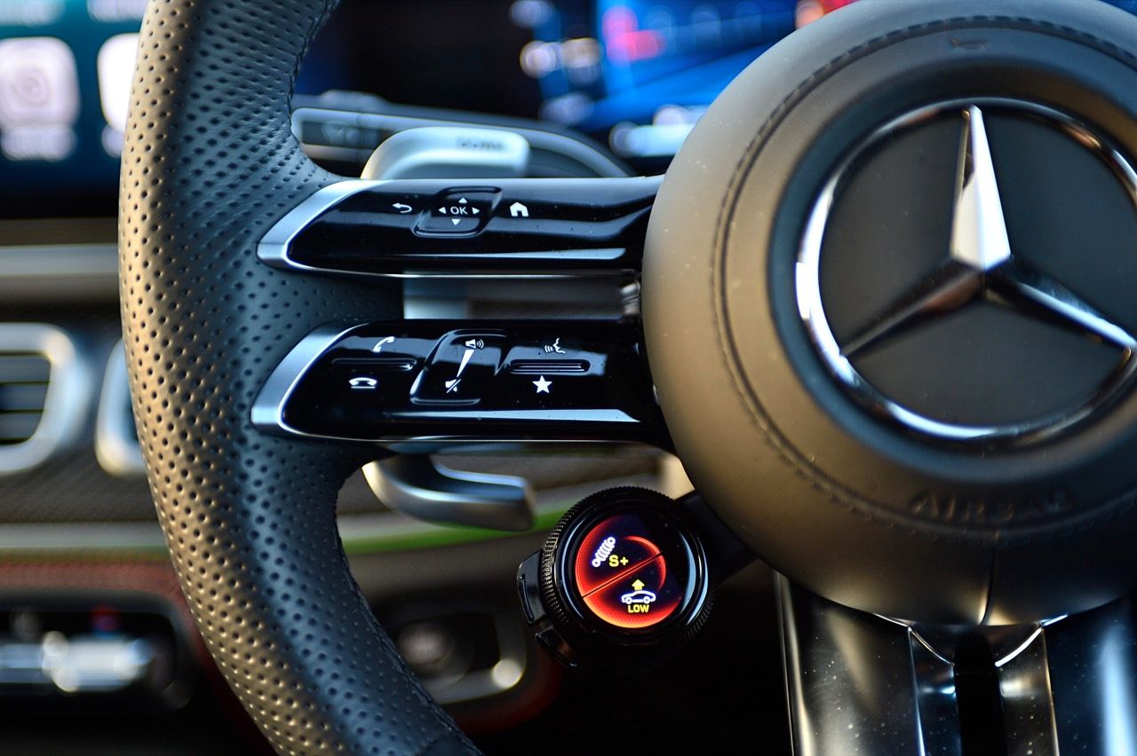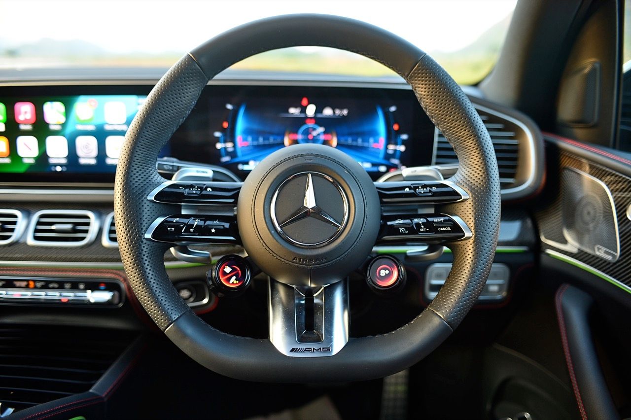 พวงมาลัยสามก้านฐานตัดทรงสปอร์ตของ AMG GLE53 เอสยูวีที่มีกำลัง 544 แรงม้า แรงบิด 750 นิวตันเมตร พวงมาลัย AMG ของ GLE มีขนาดรอบวงเท่ากันกับพวงมาลัยใน New AMG CLE53-Coupe ปรับไฟฟ้าได้สี่ทิศทางทั้งสูง-ต่ำ และไกล-ใกล้ พวงมาลัยหุ้มด้วยหนังแท้เย็บด้วยด้ายสีดำ หลังวงมีแป้นเปลี่ยนตำแหน่งเกียร์ Paddle Shift ขนาดเล็กทำจากพลาสติกสีดำติดตั้งมาให้ใช้งานสำหรับคนขับที่ชอบชิฟเกียร์เอง ก้านของพวงมาลัยมีสวิตช์ควบคุมชุดเครื่องเสียง สวิตช์รับหรือวางโทรศัพท์แบบไร้สาย รวมถึงสวิตช์เพื่อปรับเปลี่ยนการแสดงผลของมาตรวัด TFT ปุ่มควบคุมระบบปรับตั้งความเร็วอัตโนมัติ ขนาดของพวงมาลัยมีรอบวงพอดีกับการหมุนและมีร่องกริ้บที่จับได้กระชับมือ ปุ่มปรับโหมดการขับเคลื่อนแบบใหม่ AMG steering wheel buttons ที่เพิ่มเข้ามาให้ บริเวณด้านซ้ายคือปุ่มปรับการตอบสนองของช่วงล่างแอร์สปริง ปุ่มปิดแทรคชั่นคอนโทรล แยกย่อยเป็นปุ่มปรับการทำงานของเกียร์ AMG SPEEDSHIFT TCT 9G-Tronic ปรับได้ทั้งแบบอัตโนมัติหรือแมนนวลเต็มระบบ ส่วนปุ่มด้านขวา ใช้ปรับโหมดขับเคลื่อนต่างๆ เช่น