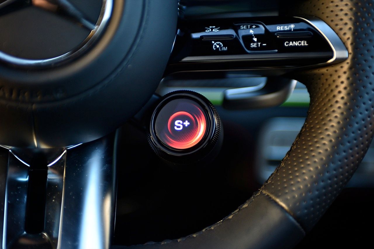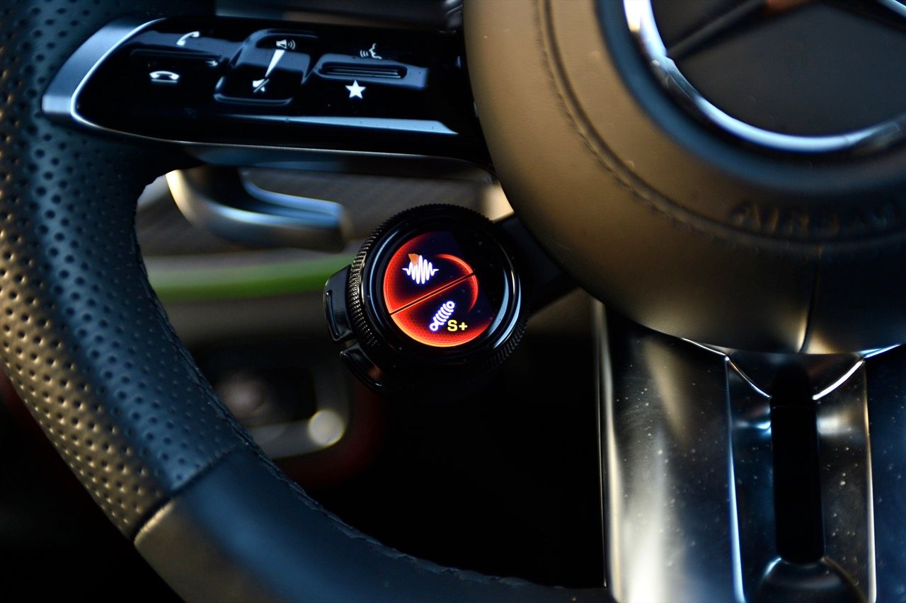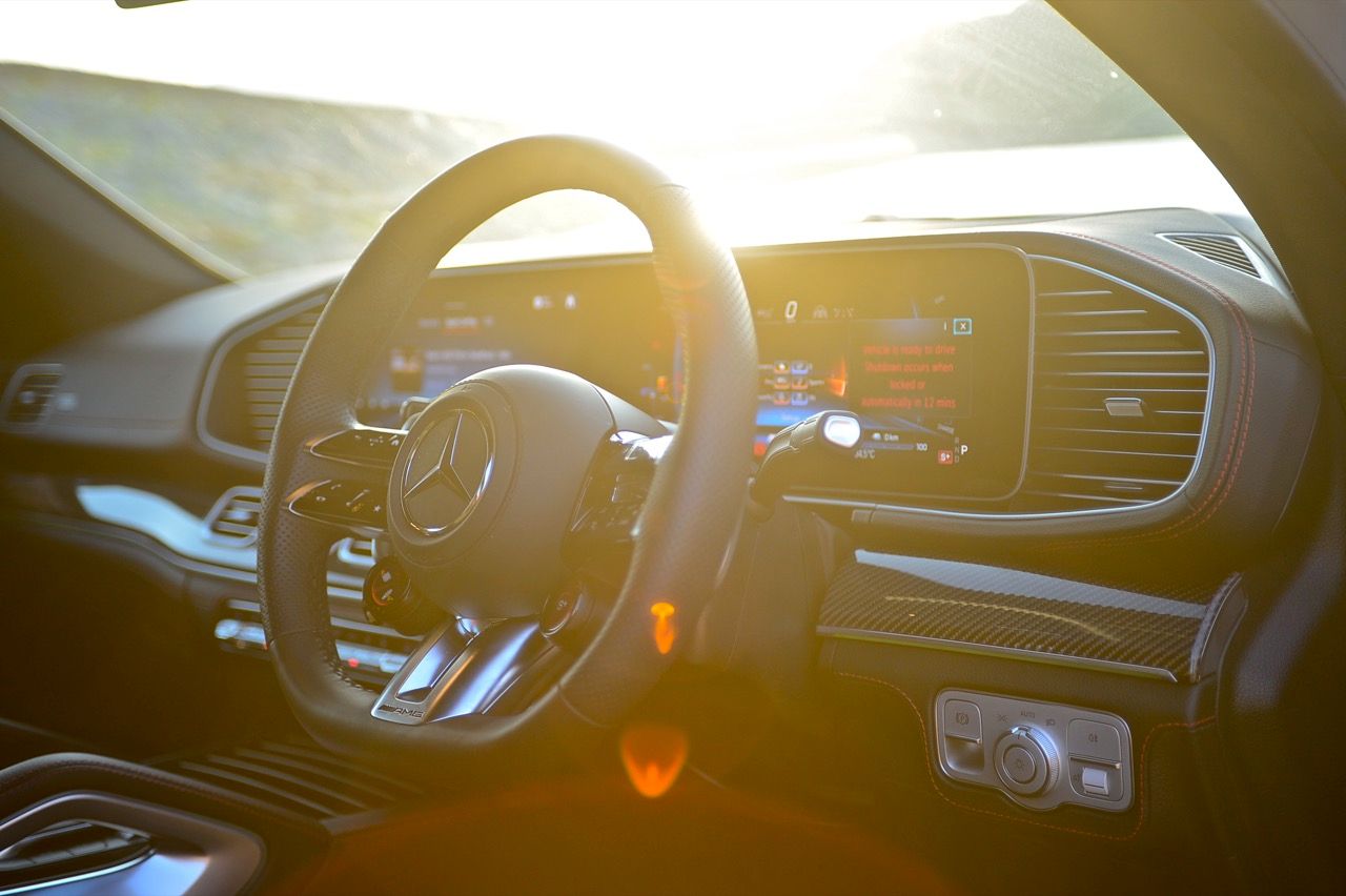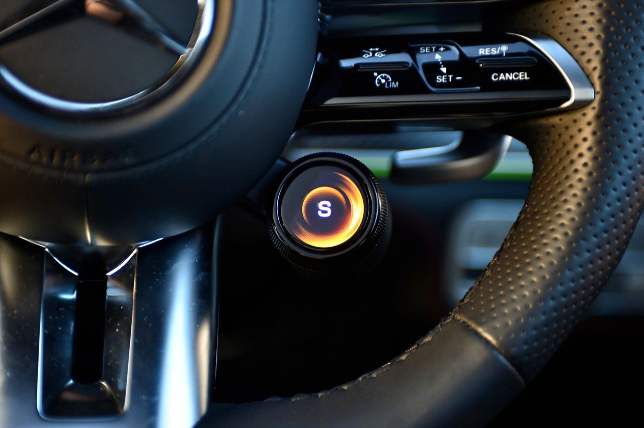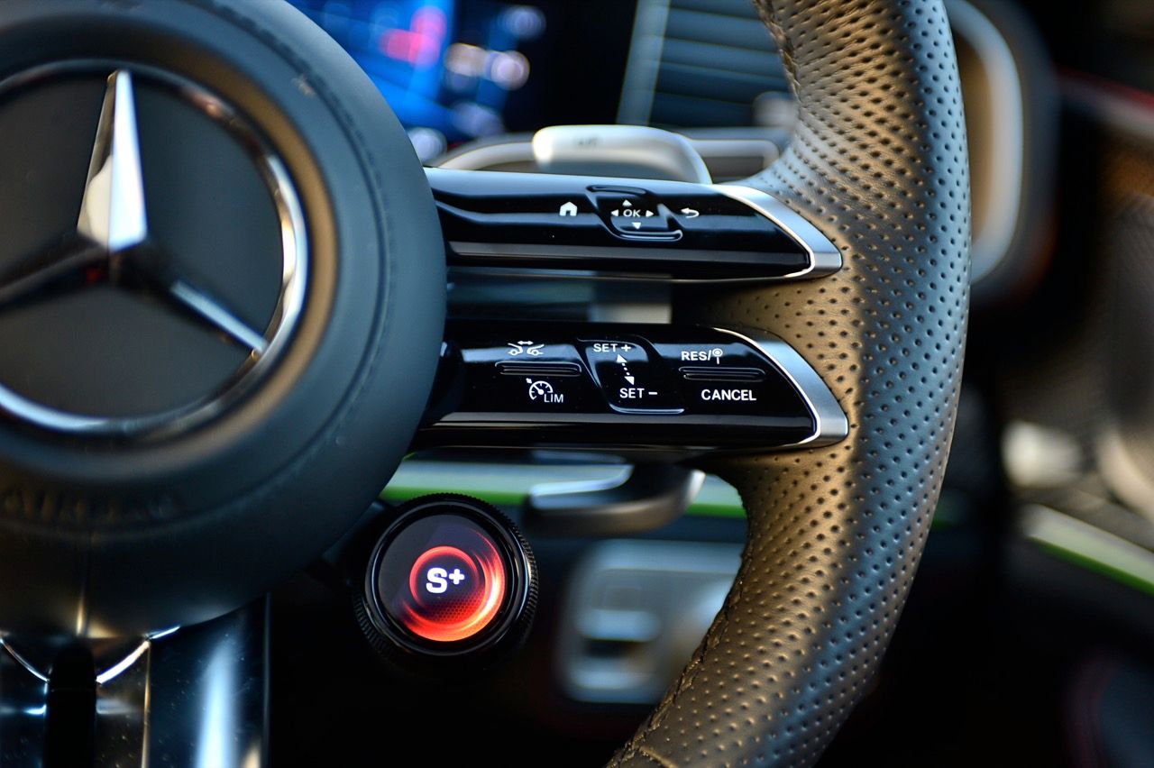พวงมาลัยสามก้านฐานตัดทรงสปอร์ตของ AMG GLE53 เอสยูวีที่มีกำลัง 544 แรงม้า แรงบิด 750 นิวตันเมตร พวงมาลัย AMG ของ GLE มีขนาดรอบวงเท่ากันกับพวงมาลัยใน New AMG CLE53-Coupe ปรับไฟฟ้าได้สี่ทิศทางทั้งสูง-ต่ำ และไกล-ใกล้ พวงมาลัยหุ้มด้วยหนังแท้เย็บด้วยด้ายสีดำ หลังวงมีแป้นเปลี่ยนตำแหน่งเกียร์ Paddle Shift ขนาดเล็กทำจากพลาสติกสีดำติดตั้งมาให้ใช้งานสำหรับคนขับที่ชอบชิฟเกียร์เอง ก้านของพวงมาลัยมีสวิตช์ควบคุมชุดเครื่องเสียง สวิตช์รับหรือวางโทรศัพท์แบบไร้สาย รวมถึงสวิตช์เพื่อปรับเปลี่ยนการแสดงผลของมาตรวัด TFT ปุ่มควบคุมระบบปรับตั้งความเร็วอัตโนมัติ ขนาดของพวงมาลัยมีรอบวงพอดีกับการหมุนและมีร่องกริ้บที่จับได้กระชับมือ ปุ่มปรับโหมดการขับเคลื่อนแบบใหม่ AMG steering wheel buttons ที่เพิ่มเข้ามาให้ บริเวณด้านซ้ายคือปุ่มปรับการตอบสนองของช่วงล่างแอร์สปริง ปุ่มปิดแทรคชั่นคอนโทรล แยกย่อยเป็นปุ่มปรับการทำงานของเกียร์ AMG SPEEDSHIFT TCT 9G-Tronic ปรับได้ทั้งแบบอัตโนมัติหรือแมนนวลเต็มระบบ ส่วนปุ่มด้านขวา ใช้ปรับโหมดขับเคลื่อนต่างๆ เช่น