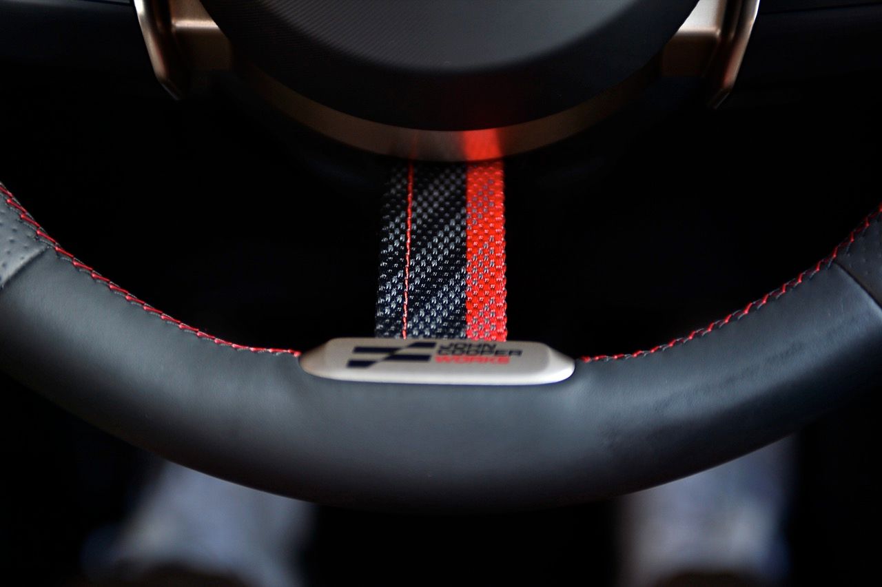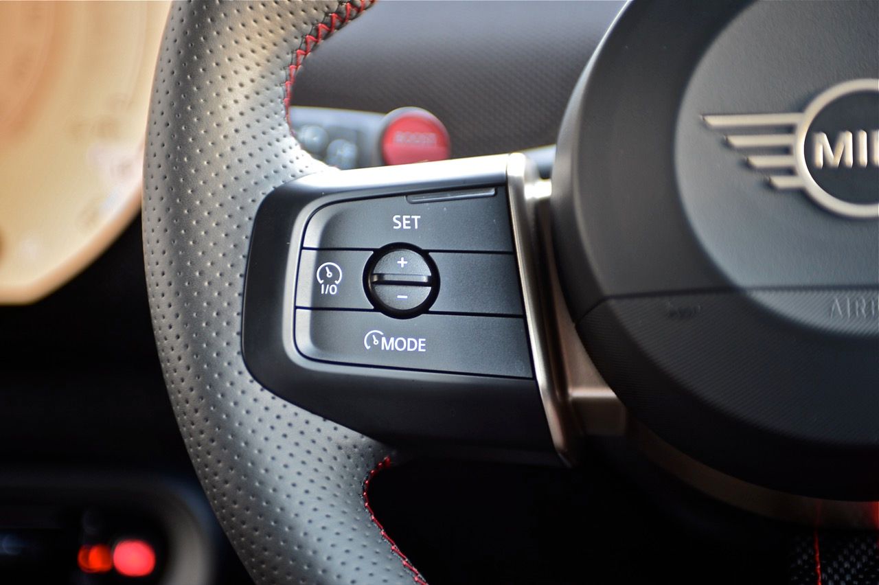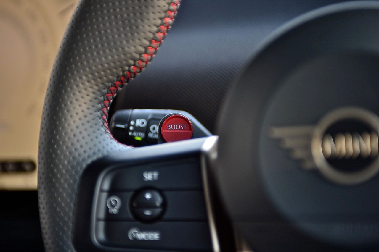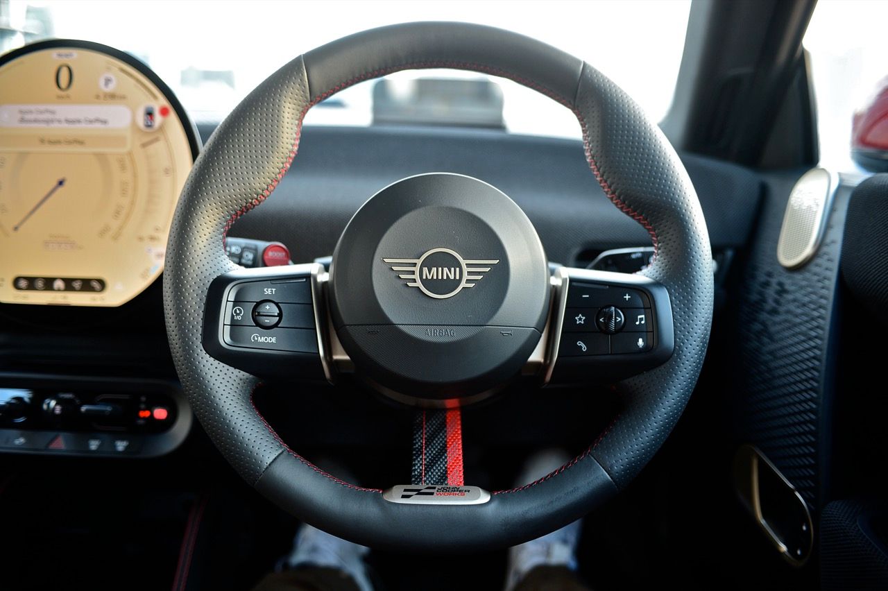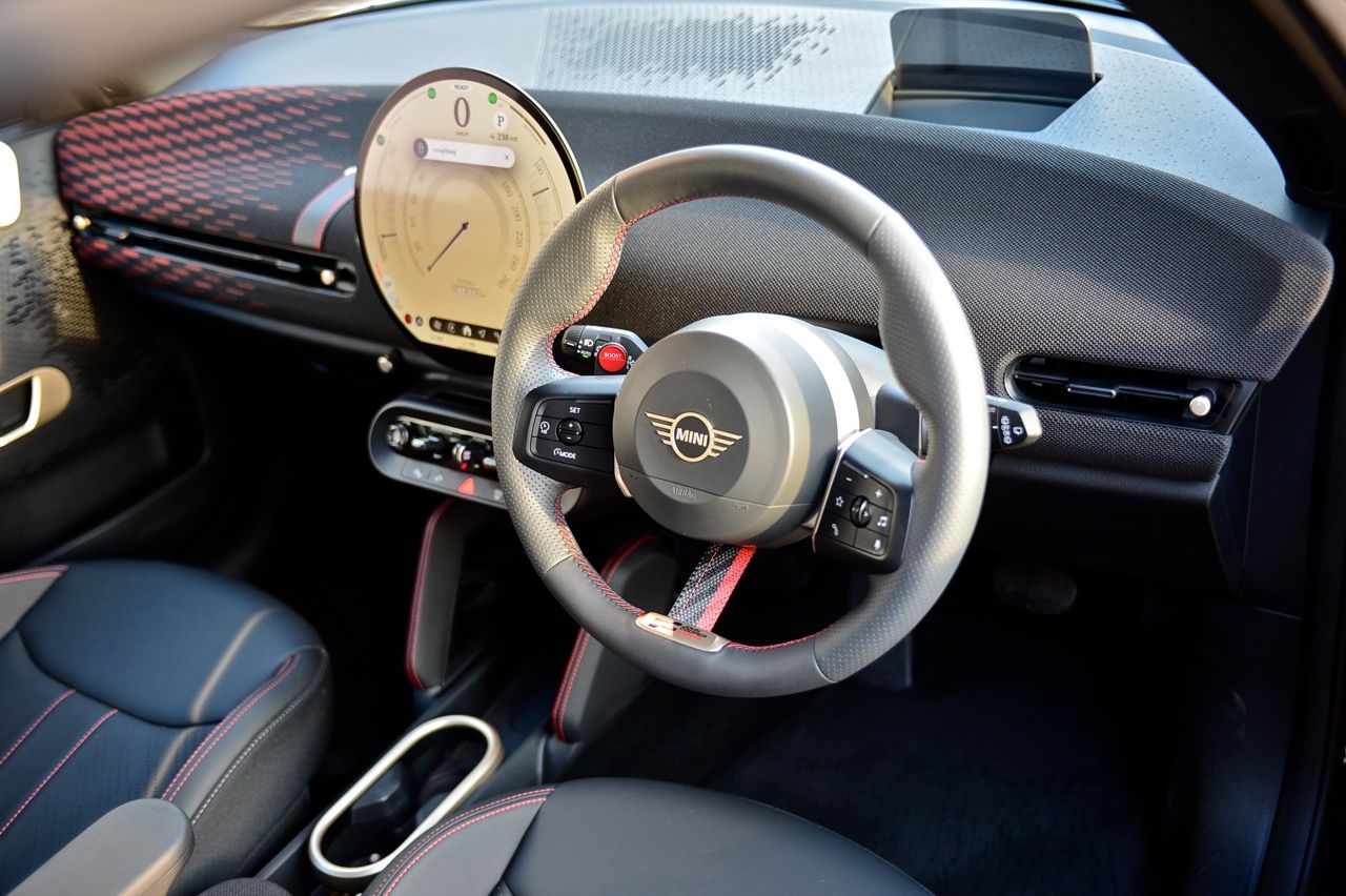 วงพวงมาลัยสปอร์ตแบบ 3 ก้านใหม่ล่าสุดของ MINI JCW Electric (John Cooper Work EV) หุ้มหนังแท้เย็บเดินตะเข็บด้วยด้ายสีแดง ก้านวงตรงกลาง ใช้วัสดุสังเคราะห์ ถักทอจนมีลวดลายคล้ายผ้าใบ ประทับตราสัญลักษณ์ MINI แบบใหม่ ปุ่มควบคุม สวิตช์สั่งงานระบบโทรศัพท์บูลทูธ สวิตช์ระบบควบคุมความเร็วอัตโนมัติ โหมดการขับเคลื่อน ฯ และปุ่มควบคุมเครื่องเสียง ปุ่ม Boost ขนาดกะทัดรัดสีแดง ติดตั้งที่ด้านหลัง อยู่ในตำแหน่งที่เหมาะเจาะในการใช้นิ้วกดเพื่อสร้างพลังงาน ขนาดที่พอดิบพอดีของวงพวงมาลัยพร้อมร่องกริ้บที่บริเวณนิ้วออกแบบมาเพื่อความกระชับรัดกุมทำให้ยึดจับได้อย่างมั่นคง ด้ายที่เย็บเดินตะเข็บรอบๆ วงพวงมาลัยด้านในใช้สีแดงที่ให้ความรู้สึกแตกต่างไปจาก Cooper SE รุ่นมาตรฐาน