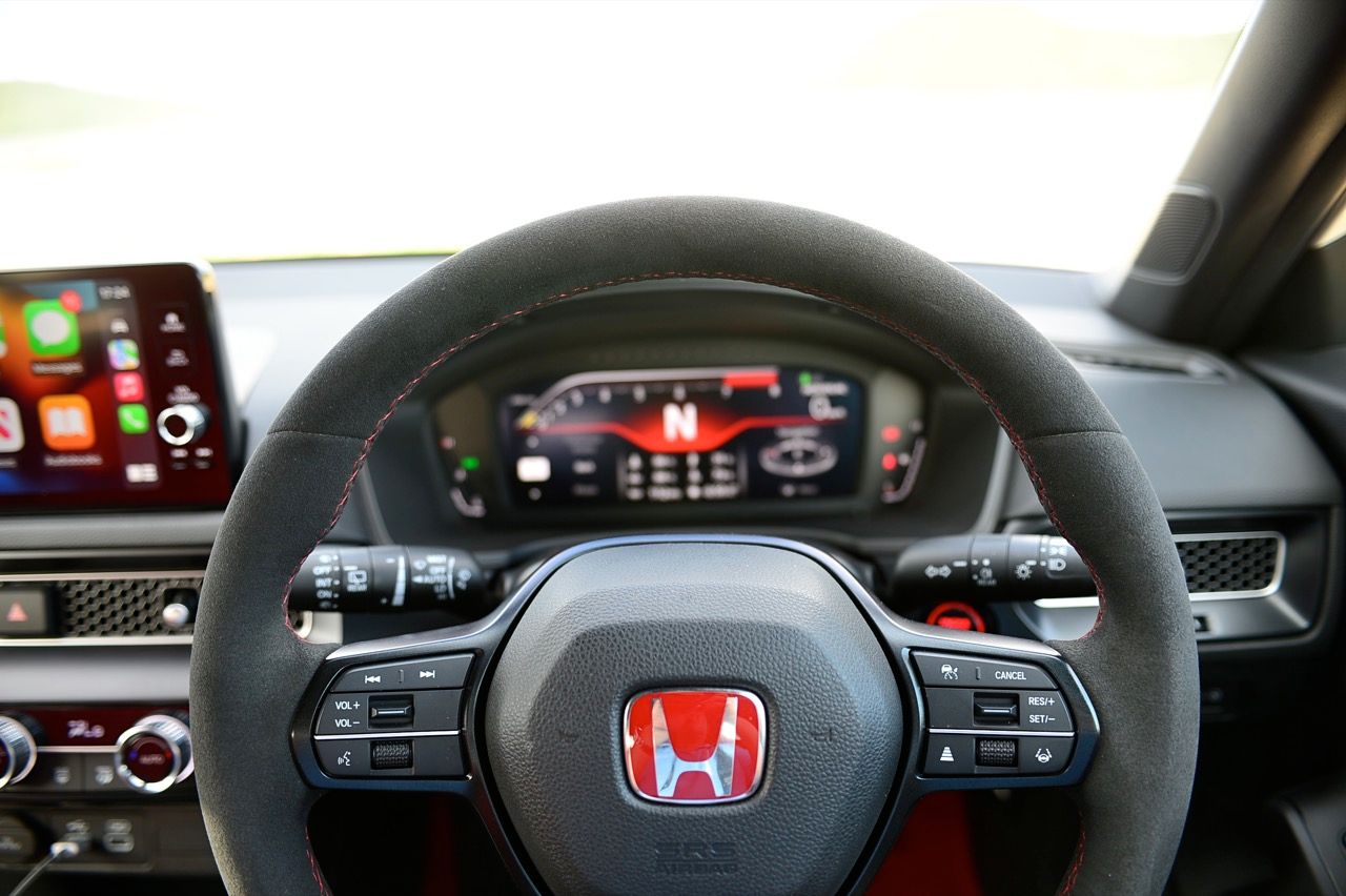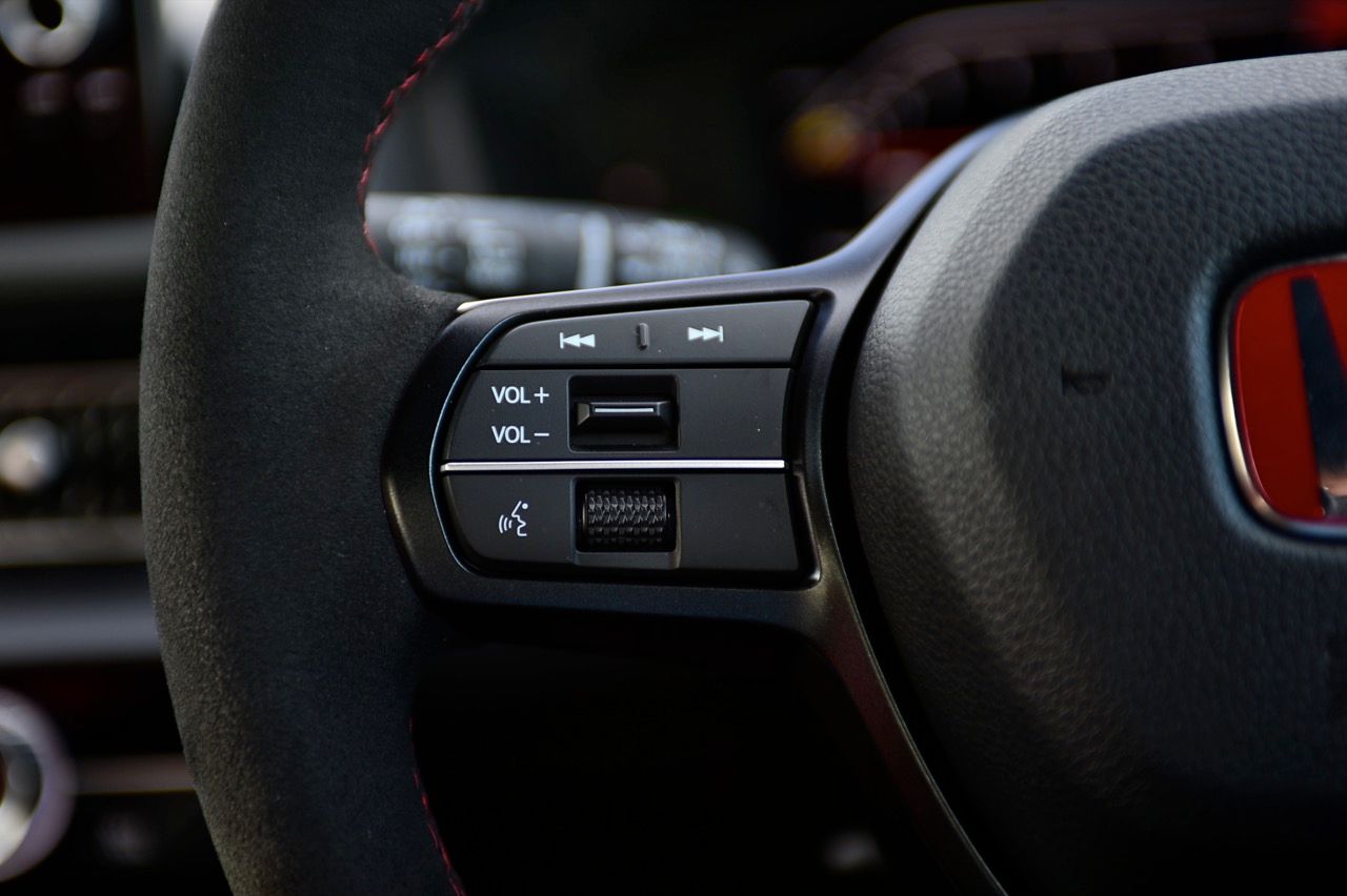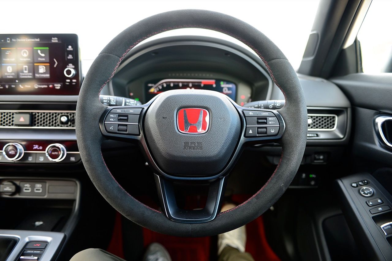พวงมาลัยหนังแท้แบบสปอร์ตทรงสามก้านของ Civic รุ่นแรงสุดหรือ Type R ติดตั้งสวิตช์สั่งงานระบบเครื่องเสียง ปุ่มรับหรือวางสายโทรศัพท์ในระบบบลูทูธ ปุ่มควบคุมระบบปรับตั้งความเร็วอัตโนมัติ ปุ่มควบคุมระบบสั่งงานด้วยเสียงแต่ไม่มีแป้นเปลี่ยนเกียร์หลังพวงมาลัยหรือ Paddle Shift เนื่องจากใช้เกียร์ธรรมดาแทนที่เกียร์ CVT จอมย้วย เป็นพวงมาลัยที่เชื่อมต่อกับสวิตช์ที่ใช้ควบคุมอุปกรณ์ต่างๆ พวงมาลัยไฟฟ้าของ Civic Type R ปรับได้สี่ทิศทางทั้งไกล-ใกล้-สูง-ต่ำ ครอบคลุมสรีระเรือนร่างของผู้ขับ ไม่ว่าจะสูงยาวอวบอ้วนหรือตัวเตี้ยม่อต้อก็สามารถนั่ง และปรับเบาะกับตำแหน่งของพวงมาลัยให้เข้ากับเรือนร่างเพื่อการควบคุมที่ดี