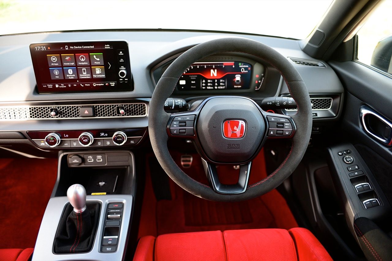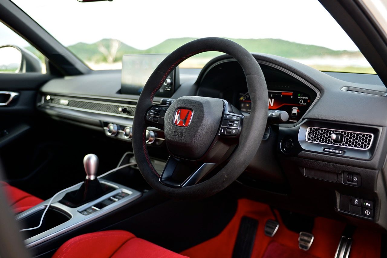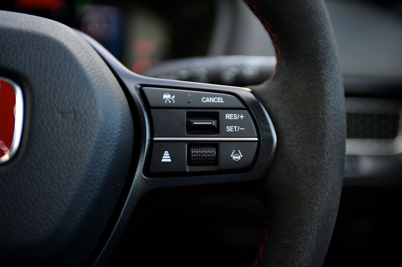 พวงมาลัยหนังแท้แบบสปอร์ตทรงสามก้านของ Civic รุ่นแรงสุดหรือ Type R ติดตั้งสวิตช์สั่งงานระบบเครื่องเสียง ปุ่มรับหรือวางสายโทรศัพท์ในระบบบลูทูธ ปุ่มควบคุมระบบปรับตั้งความเร็วอัตโนมัติ ปุ่มควบคุมระบบสั่งงานด้วยเสียงแต่ไม่มีแป้นเปลี่ยนเกียร์หลังพวงมาลัยหรือ Paddle Shift เนื่องจากใช้เกียร์ธรรมดาแทนที่เกียร์ CVT จอมย้วย เป็นพวงมาลัยที่เชื่อมต่อกับสวิตช์ที่ใช้ควบคุมอุปกรณ์ต่างๆ พวงมาลัยไฟฟ้าของ Civic Type R ปรับได้สี่ทิศทางทั้งไกล-ใกล้-สูง-ต่ำ ครอบคลุมสรีระเรือนร่างของผู้ขับ ไม่ว่าจะสูงยาวอวบอ้วนหรือตัวเตี้ยม่อต้อก็สามารถนั่ง และปรับเบาะกับตำแหน่งของพวงมาลัยให้เข้ากับเรือนร่างเพื่อการควบคุมที่ดี