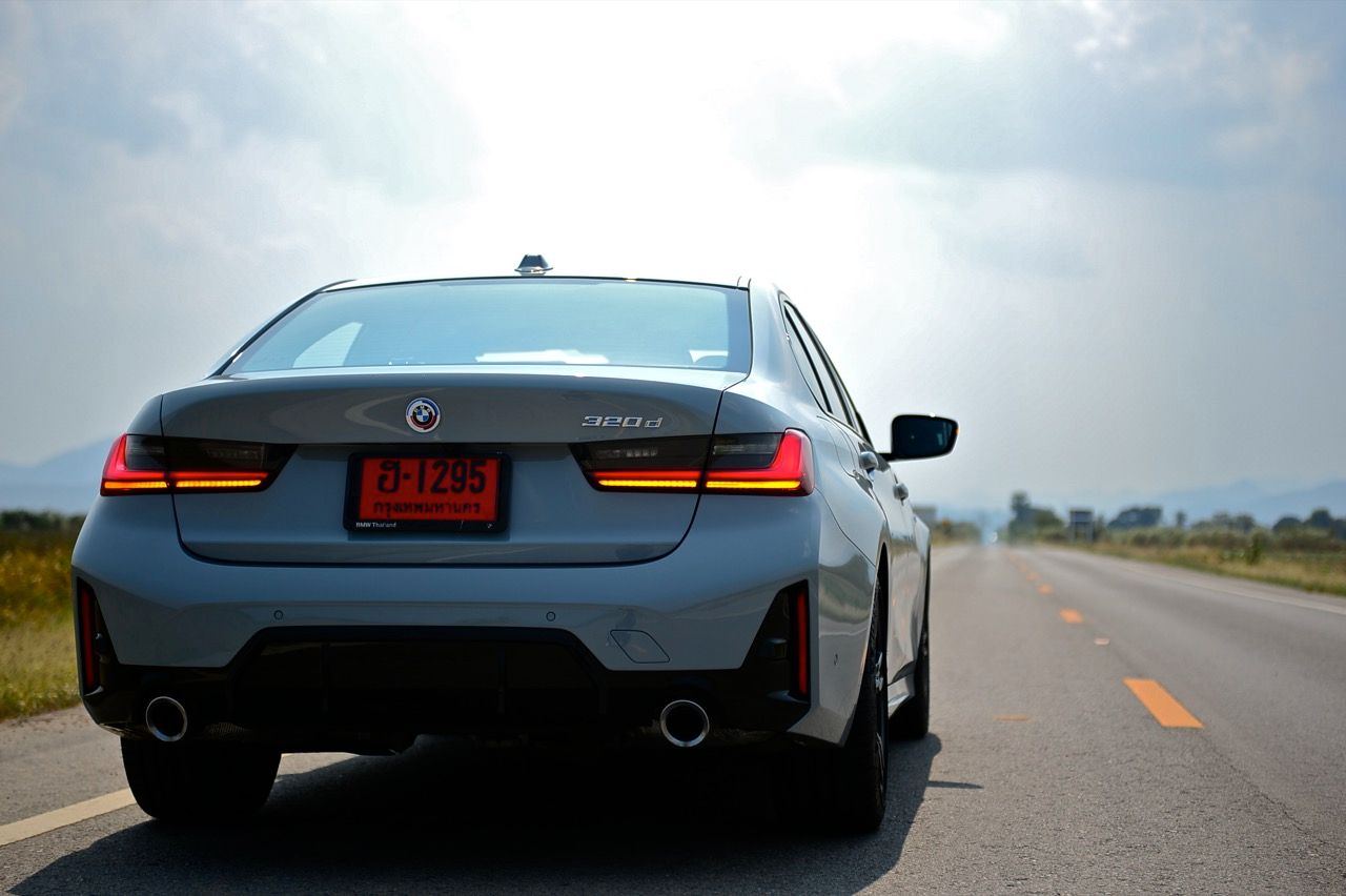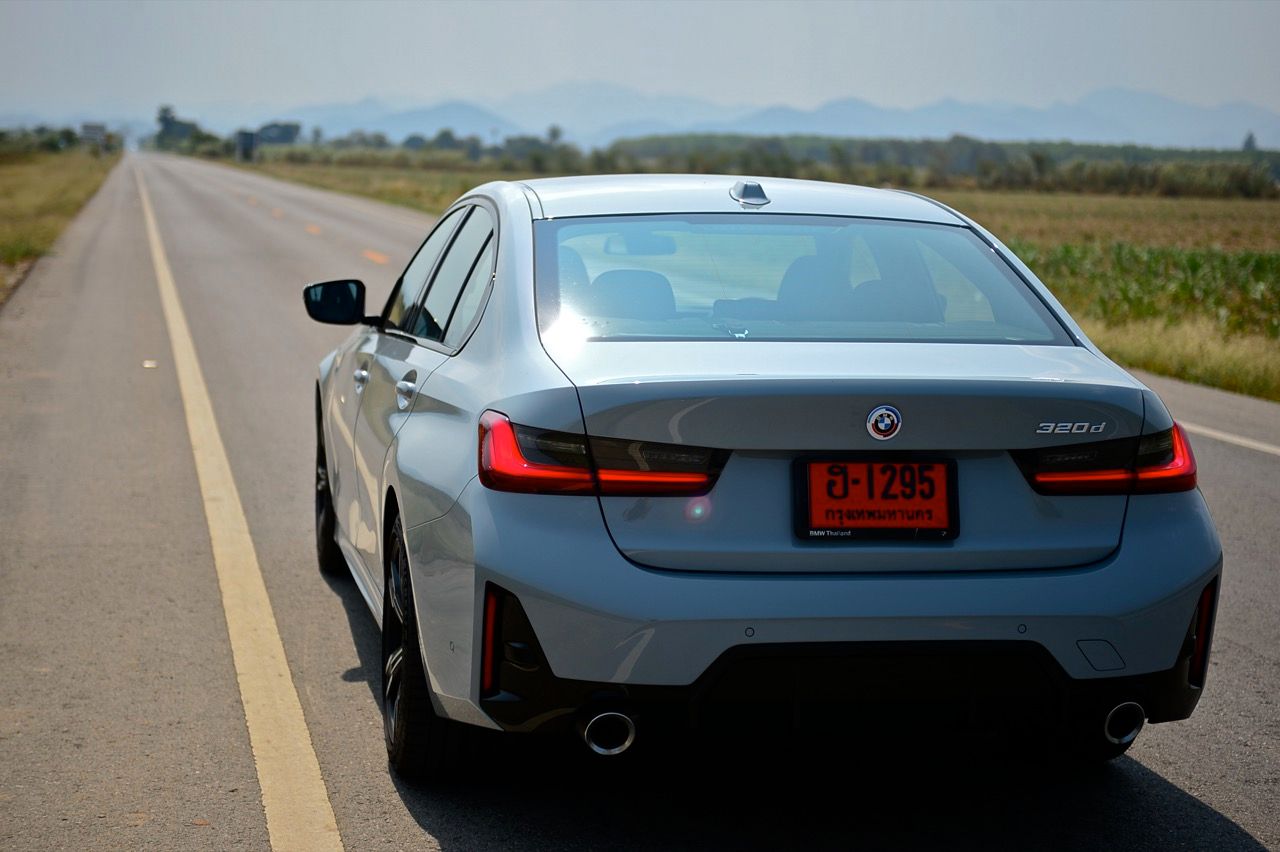 เครื่องยนต์ดีเซล 2 ลิตร เทอร์โบ ทำงานลื่นไหลและมีเสียงรบกวนไม่มาก ผมพยายามรักษาระดับความเร็วให้คงที่ในย่าน 110-120 กิโลเมตรต่อชั่วโมง รอบเครื่องยนต์ป้วนเปี้ยนอยู่แถวๆ 1,600-1,800 รอบต่อนาที จากการทำงานของระบบส่งกำลังในโหมด ECO ที่ดันอัตราทดขึ้นสู่เกียร์สูงเพื่อลดรอบ เครื่องยนต์ B47D20 2.0 L I4 turbo ทำอัตราสิ้นเปลืองเชื้อเพลิงได้ดีเมื่อขับทางไกล ความจุ 1,995 ซีซี กับเทคโนโลยีระบบอัดอากาศ BMW TwinPower Turbo ให้กำลังสูงสุด 140 กิโลวัตต์ หรือ 190 แรงม้า ที่ 4,000 รอบต่อนาที แรงบิด 400 นิวตัน-เมตร มากเกินพอสำหรับการใช้งานปกติ มาในย่าน 1,750-2,500 รอบต่อนาที เกียร์อัตโนมัติ ZF 8 สปีด ไหลขึ้นลงด้วยความเรียบเนียนไม่มีอาการกระตุกกระชาก ตัวเลขสมรรถนะของ BMW 320d M Sport LCI เร่งจาก 0-100 กิโลเมตรต่อชั่วโมง ใน 6.8 วินาที ความเร็วสูงสุด 240 กิโลเมตรต่อชั่วโมง ในย่านความเร็วเดินทาง Series-3 มีการทรงตัวที่ดี ขับเร็วขึ้นก็ยังนิ่ง พวงมาลัยมีน้ำหนักมากขึ้นเมื่อโหมดขับเคลื่อนถูกปรับไปเป็นสปอร์ตโหมดพร้อมการกระแทกคันเร่งอย่างต่อเนื่องเพื่อจับการตอบสนองของรถเมื่อขับเร็ว