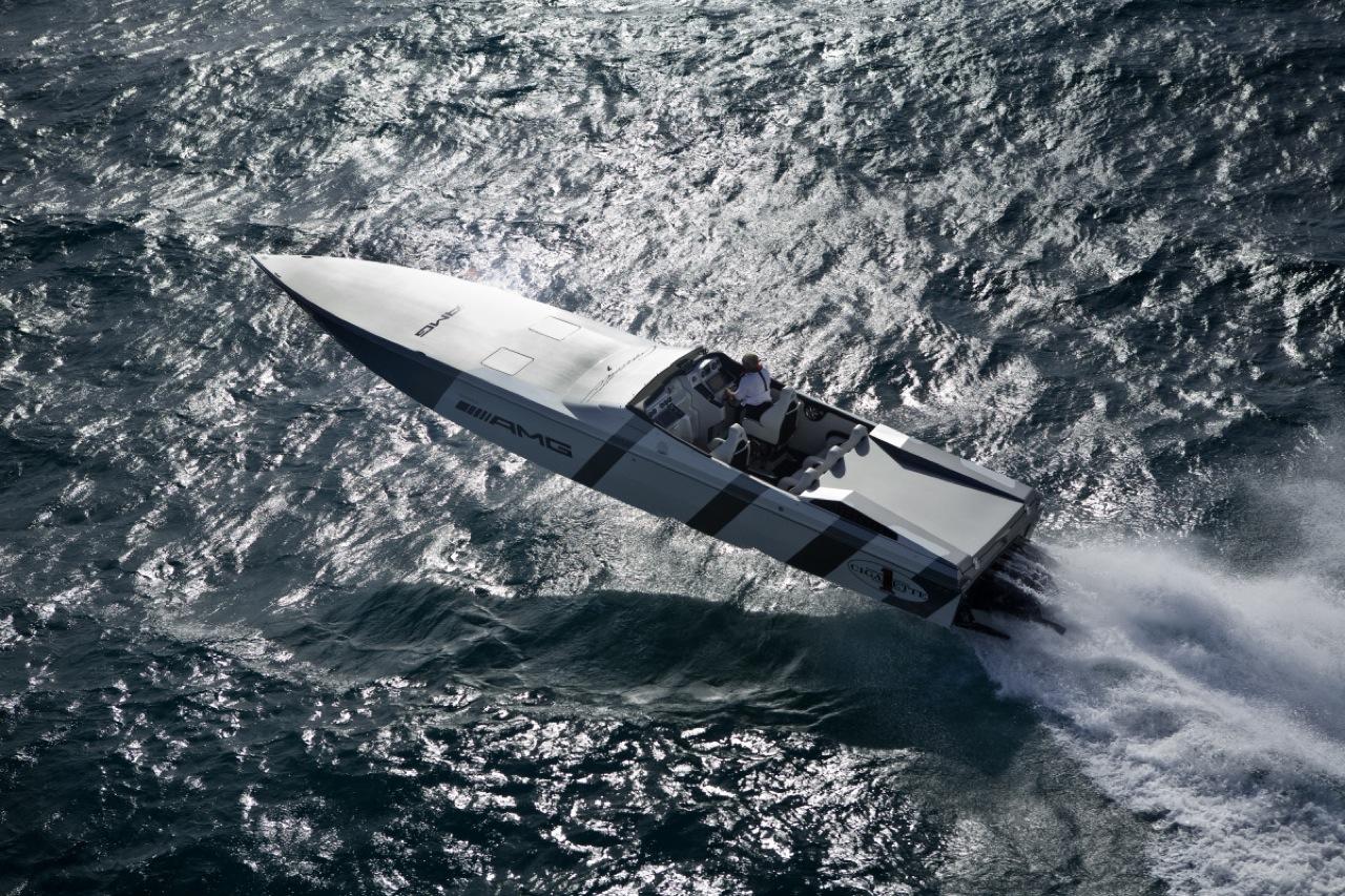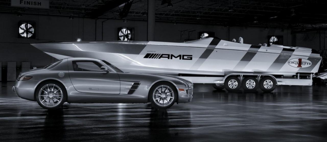 ตัวแทนความเร็วบนผิวน้ำลำล่าสุดจากบริษัท Mercedes Benz นี่คือเรือแข่งของสำนักแต่งรถ AMG ที่ถูกสร้างขึ้นเพื่อเป็นสัญลักษณ์แห่งความสำเร็จของสปอร์ตคาร์ประตูปีกนก Mercedes Benz SLS AMG Gullwing ธนูสีเงินที่สืบสานตำนานรถสปอร์ตจากรุ่น 300 SL Gullwing 1956 แรงบันดาลใจที่เกิดจากการผลิตจักรกลเจ้าแห่งความเร็วและความสง่างามถูกถ่ายทอดสายพันธ์ุลงสู่ท้องน้ำด้วยรูปลักษณ์ของเรือแข่งสีขาวคาดเงินที่ทำความเร็วได้กว่า 100 นอตต่อชั่วโมง เรือ Cgarette's 46 AMG Power Boat ถูกนำไปจัดแสดงภายในงาน Boat Show - 2010 Miami International โดยต้องการแสดงให้เห็นถึงเทคโนโลยีของรถสปอร์ตซุปเปอร์คาร์ที่ประสานไปกับรูปทรงปราดเปรียวของเรือแข่งจากสำนัก AMG ได้อย่างกลมกลืน ความยาว 46 ฟุต กับรูปทรงที่คล้ายซิการ์ ส่งผลให้เรือเร็วของสำนัก AMG ลำนี้ มีความเหมาะสมในการทำความเร็วไม่แตกต่างไปจากซุปเปอร์คาร์รุ่น SLS AMG เรือ Cigarette's 46 AMG Power Boat วางต้นกำลังเป็นเครื่องยนต์ V8 ทวินเทอร์โบ 2 เครื่องยนต์ไว้กลางลำตัว เมื่อมันทำงานจะให้แรงม้าถึง 1350 ตัว(ต่อเครื่อง) และมีความเร็วปลายระดับ 130 ไมล์ต่อชั่วโมงเหนือผิวน้ำจากการอัดอากาศเข้าสู่ท่อร่วมไอดีของเทอร์โบขนาดเขื่องทั้ง 4 ลูก ชุดเทอร์ไบน์ติดตั้งอินเตอร์คูลเลอร์เพื่อลดอุณหภูมิของไอดีก่อนประจุเข้าไปยังห้องเผาไหม้ เครื่องยนต์ของเรือเร็วลำนี้คือเครื่อง Mercury Twin Turbocharged Quad Cam 552 CI ปริมาตรความจุ 9 ลิตรหรือ 9,998 ซีซี ปรับแต่งกลไกภายในใหม่หมดโดยสำนัก AMG เพื่อให้มีความเหมาะสมกับการใช้งานทางทะเลด้วยการเปลี่ยนชิ้นส่วนอุปกรณ์บางชิ้นที่สามารถทนทานต่อการกัดกร่อนของน้ำทะเล เครื่องยนต์เทอร์โบแฝดแต่ละเครื่องรับหน้าที่ขับเคลื่อนใบจักรหนึ่งชุด และเมื่อรวมแรงม้าของทั้งสองเครื่องเข้าด้วยกัน เจ้าของเรือ Cigarette's 46 AMG Power Boat จะมีม้าท่วมๆ ถึง 2700 ตัว Cockpit โดยสารแบบ 5 ที่นั่ง มีรูปแบบคล้ายกับภายในห้องโดยสารของ SLS AMG จากวัสดุและอุปกรณ์ต่างๆ ที่คล้ายคลึงกัน ความสามารถในการเรียนรู้แลการวิจัยเกี่ยวกับการใช้เทคโนโลยีชั้นสูง ก่อกำเนิดเทคนิคการเชื่อมตัวเรือแบบใหม่ล่าสุดรวมถึงกระบวนการทางวิศวกรรมและการใช้วัสดุน้ำหนักเบาพวกคาร์บอนคอมโพสิตกับอลูมินัมอัลลอยหรือไทเทเนียม ทั้งหมดทั้งปวงจากความรู้เหล่านี้ถูกวิศวกรของสำนักแต่งรถ AMG ถ่ายทอดลงไปในเรือ Cgarette's 46 AMG Power Boat เพื่อแสดงให้เห็นถึงความพยายามในการเป็นเจ้าความเร็วของวงการมอเตอร์สปอร์ตทั้งบนบกและบนผิวน้ำจากค่ายตราดาว การออกแบบรูปทรงเรือเร็วที่ปราดเปรียวเพรียวบางคือการดึงเอาบางส่วนของแรงบันดาลใจจาก Supercar SLS AMG รวมถึงสีที่ใช้พ่น นั่นก็คือสีขาว-เงิน AMG Alubeam ซึ่งเป็นหนึ่งในตัวเลื
