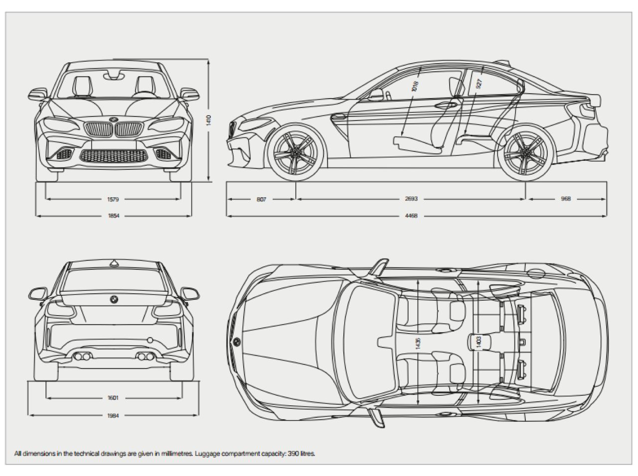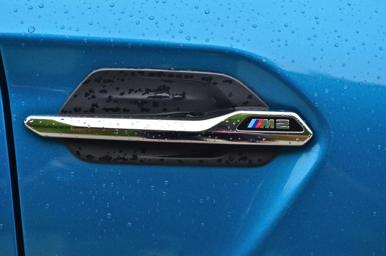 สปอยเลอร์หน้ามีช่องรับอากาศใหญ่ยักษ์ ทั้งตะแกรงหน้าใต้ไตคู่ ช่องรับอากาศเข้าไประบายความร้อนให้กับชุดเบรกที่ทำให้ระบบหน้าของ M2 ดุร้ายกว่า M4 ไฟหน้า LED เฉียบคมและมีขนาดที่เล็กกว่าไฟของ M4 กระจังหน้าไตคู่ที่คุ้นเคยของ BMW มิติตัวถังของ BMW M2 มีขนาดความกว้าง 1,854 มิลลิเมตร ยาว 4,475 มิลลิเมตร และสูง 1,410 มิลลิเมตร ระยะห่างจากพื้นถึงใต้ท้องรถแค่ 122 มิลลิเมตร ทำให้คนขับต้องคอยระวังกันพอสมควร แต่ก็ไม่ได้เตี้ยมากจนขับยาก ฐานล้อวัดจากดุมล้อหน้าไปหลังยาว 2,692 มิลลิเมตร ความกว้างล้อหน้า 1,580 มิลลิเมตร หลัง 1,600 มิลลิเมตร น้ำหนัก 1,565 กิโลกรัม