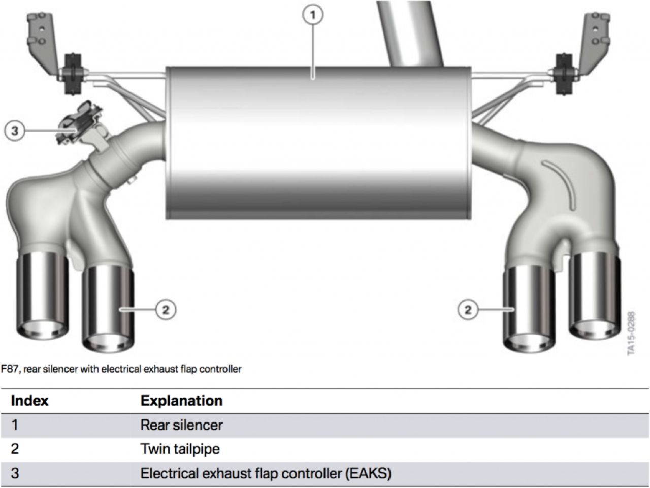 ด้วยการออกแบบให้แรงดันต้านกลับในท่อไอเสียที่ต่ำลง ระบบควบคุมเสียง M ซึ่งติดตั้งปลายท่อคู่สองชุดจึงเพิ่มสมรรถนะของเครื่องยนต์ M ทั้งยังมีระบบควบคุมการเปิด-ปิดวาล์วท่อไอเสียด้วยไฟฟ้า ให้เสียงตามแบบรถสปอร์ตอย่างแท้จริง