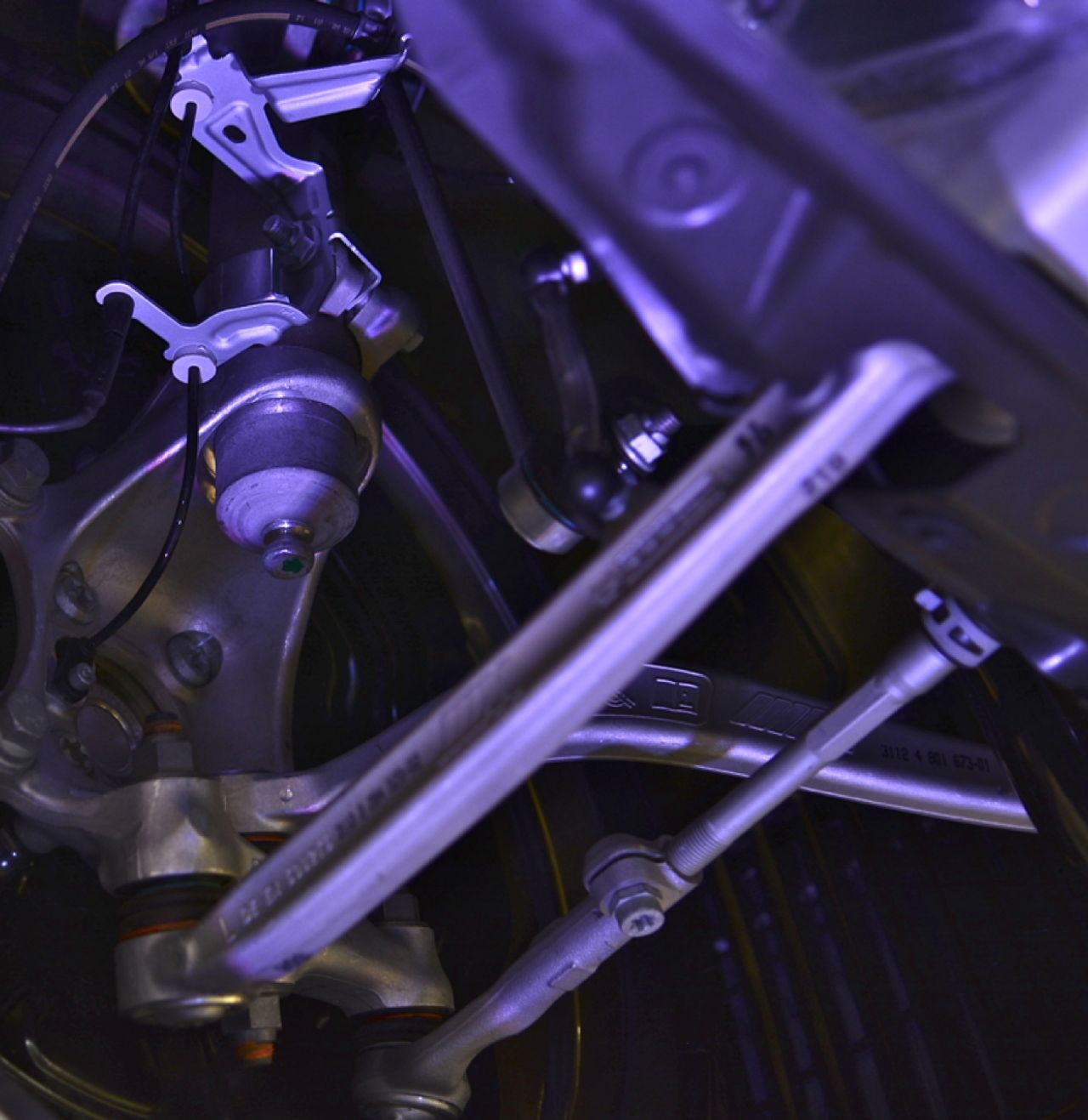 เพลาหน้าน้ำหนักเบาได้รับการออกแบบใหม่เนื่องจากความต้องการประสิทธิภาพของระบบขับเคลื่อนในระดับสูงสุด ยานยนต์ตระกูล M ทุกคันมีการลดน้ำหนักใต้สปริงเพื่อเพิ่มสมรรถนะในการขับขี่และประสิทธิภาพของระบบกันสะเทือน พร้อมลดการลื่นไถลหรือเสียสมดุลที่ดี นอกจากนี้ยังกระจายน้ำหนักลงเพลาได้ดี ให้การขับมีความเสถียร เสริมการควบคุมในสภาวะการขับขี่ที่ไม่เอื้ออำนวย และเพิ่มความแม่นยำในการบังคับเลี้ยวตามแนวคิดของรถสปอร์ตเพื่อสมรรถนะในการขับขี่และความแข็งแกร่งของตัวถัง ยางแบบพิเศษสำหรับรถยนต์ตระกูล M ที่มีค่าแรงยึดเกาะสูง เพลาขับของ M2 จึงเพิ่มประสิทธิภาพในการยึดเกาะถนนและการตอบสนองที่แม่นยำของพวงมาลัย แขนยึด แคริเออร์ล้อ แพ และส่วนรับแรงเฉือนของเพลาหน้าสปริงสตรัทแบบสองข้อต่ออ่อนทำจากอะลูมิเนียมน้ำหนักเบา นอกจากนี้ยังใช้สปริงสตรัทและโรลบาร์อะลูมิเนียมที่มีน้ำหนักเบาขึ้น ส่วนรับแรงเฉือนและข้อต่อเกลียวเสริมที่สเกิร์ตข้างเพิ่มความแข็งแรงด้านหน้า ช่วยทำให้เกิดความแม่นยำในการบังคับเลี้ยวอย่างเห็นได้ชัด