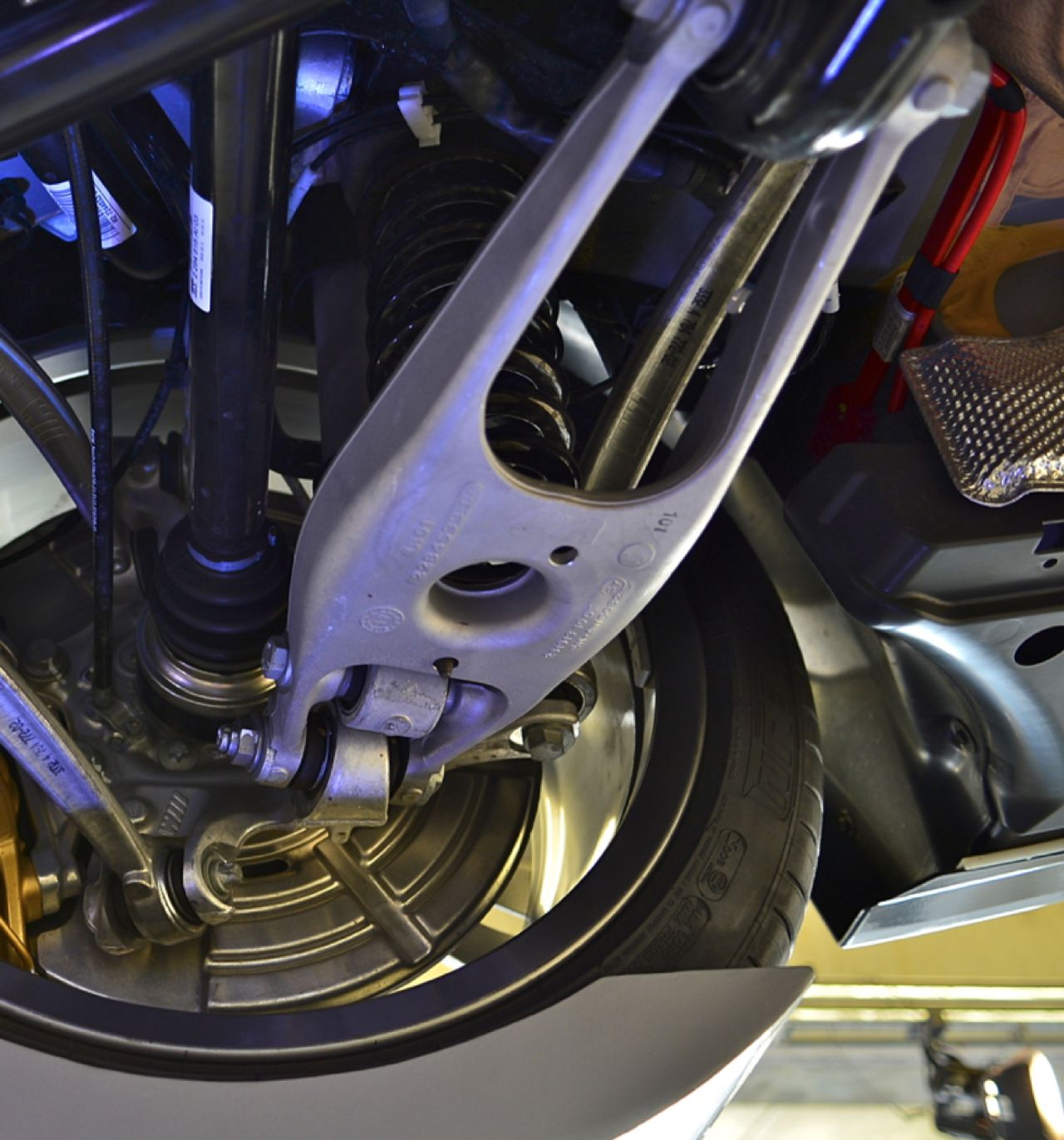 ช่วงล่างเกาะเป็นตุ๊กแกแต่แข็งโป็กนั่งไม่สบายก้นเมื่อเจอกับผิวถนนที่ไม่เรียบ แต่ต่อให้คุณอัดมันหนักหนาสาหัสขนาดไหน หากยางยังสดใหม่ก็ควบคุมได้ง่ายดายไม่ออกอาการที่จะทำให้รู้สึกแย่ เมื่อเจอเข้ากับทางโล่งข้างหน้าผมขับผ่านโค้งเร็วขึ้น ด้วยเสถียรภาพและความมั่นใจอย่างเต็มเหนี่ยวโดยไม่มีลูกบ้าเข้ามาเจือปน ในโค้งมุมแคบต้องงัดข้อกับพวงมาลัยด้วยการขืนข้อมือกันเอาเรื่องจากน้ำหนักที่ขึงตรึง ช่วงล่างมาตรฐานแบบปรับไม่ได้รองรับการเปลี่ยนทิศทางอย่างตรงไปตรงมา ใส่ไปเท่าไหร่ก็ให้มาเท่านั้นไม่มีขาดหรือเกินซึ่งจะทำให้คุมรถยาก ช่วงล่างแตกต่างจาก M4 ออกมาในแบบแข็งกระด้างไม่โอนอ่อนให้กับอะไรทั้งนั้นไม่ว่าจะเป็นร่องหลุมเนินลอนไม่เรียบของผิวถนนลาดยางมะตอย ไม่มีความยืดหยุ่นเหมือนช่วงล่างของ M3 ซึ่งมีทั้งคนที่ชอบและไม่ชอบ การปรับให้ช่วงล่างของหมอนี่แข็งราวกับกระดานสร้างความพึงพอใจเมื่อขับเร็วๆ แต่ก็แลกด้วยอาการกระเด้งกระดอนเมื่อเจอกับถนนที่กำลังซ่อมบำรุง