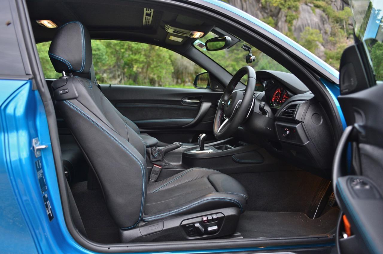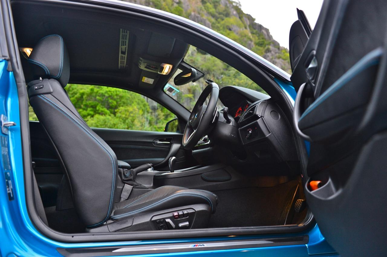 ห้องโดยสารมีโทนสีเดียวเพื่อความง่ายในการประกอบบนสายการผลิตที่รีบเร่งแทบจะไม่ทันส่งรถให้กับลูกค้าที่เฝ้ารอ ภายในของ BMW M2 เรียบง่ายมีปุ่มและสวิตช์เท่าที่จำเป็น แดชบอร์ดคอนโซลทำจากโฟมขึ้นรูปหุ้มด้วยหนังสังเคราะห์ เบาะคู่หน้าไฟฟ้าพร้อมกลไกการเลื่อนเบาะเพื่อเข้า-ออกจากเบาะหลัง และหน่วยความจำ 2 ระดับ เบาะหุ้มหนังแท้เย็บเดินตะเข็บด้วยด้ายสีฟ้า บริเวณใต้พนักพิงศีรษะของเบาะคู่หน้าแปะตราสัญลักษณ์ M รวมถึงถุงหนังแท้ที่ใช้หุ้มคันเบรกมือที่ใช้หนัง Alcantara