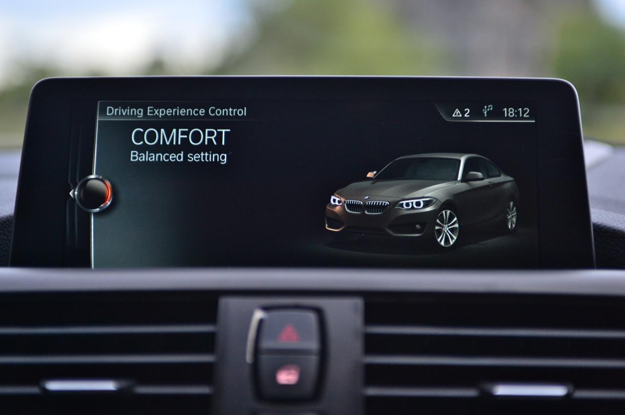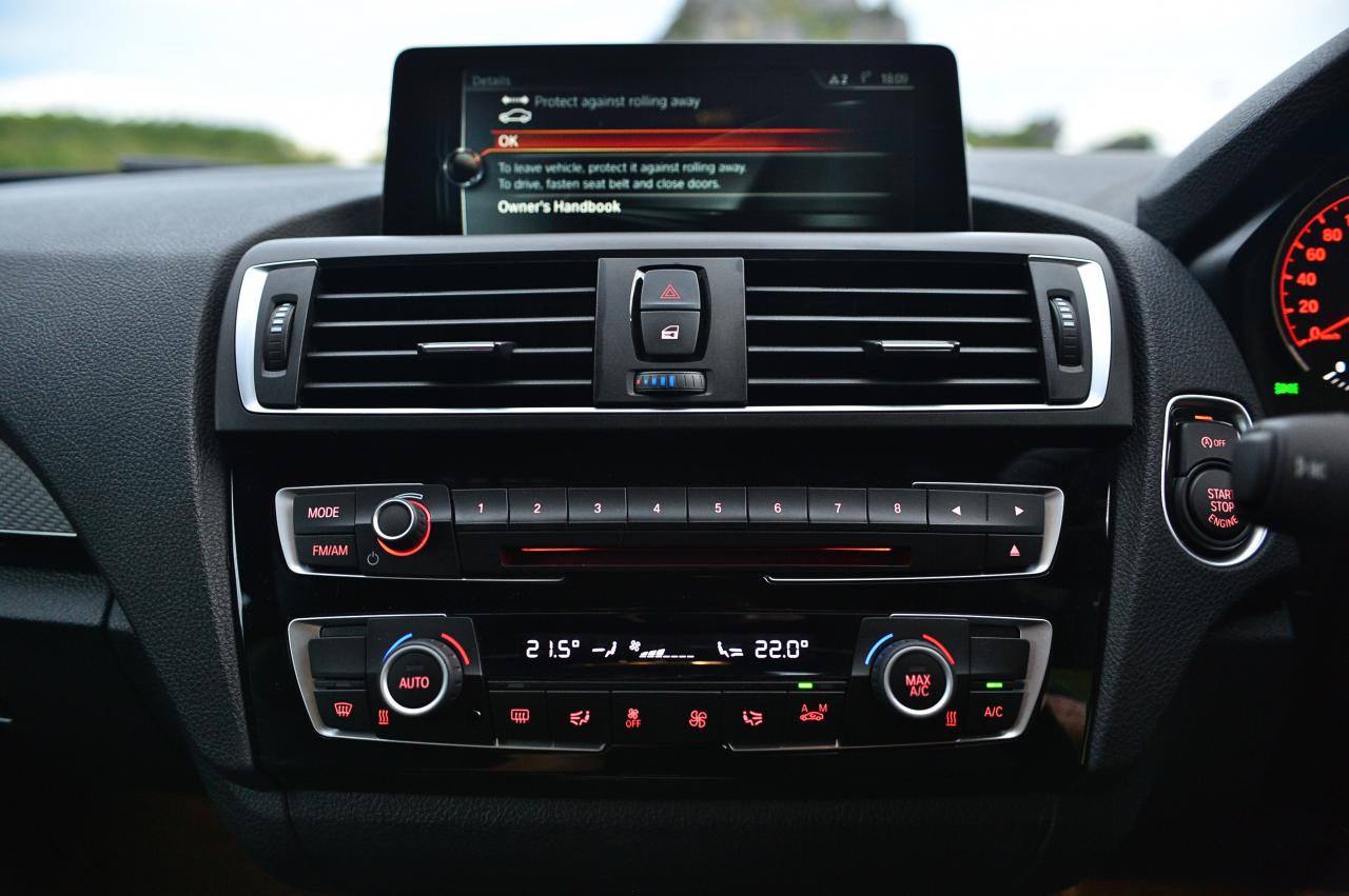 กลางแดชบอร์ดใต้จอภาพเป็นช่องแอร์หน้าตาบ้านๆ สไตล์ BMW ต่ำลงมาเป็นที่อยู่ของชุดเครื่องเสียงที่เรียบง่ายพร้อมช่องยัดแผ่น CD DVD ที่หาได้ยากในปัจจุบัน ถัดจากแผงควบคุมเครื่องเสียงเป็นชุดควบคุมอุณหภูมิดิจิตอลแบบแยกโซน ปุ่มสตาร์ตเครื่องยนต์ด้านขวามือมีปุ่มเล็กๆ อยู่ด้านบนเพื่อกดยกเลิกหรือใช้งานระบบ Auto Start/Stop ซุ้มเกียร์ M-DCT 7 สปีดแบบเรียบๆ ข้างคันเกียร์มีสวิตท์ปรับโหมดการขับเคลื่อนที่ปรับได้สามแบบ (Comfort / Sport / Sport +) ปุ่มควบคุมแบบสวิตช์ 5 ทิศทางในระบบ iDRIVE เวอร์ชั่นล่าสุดที่มีการปรับแต่งฟังก์ชั่นเพิ่มเติม