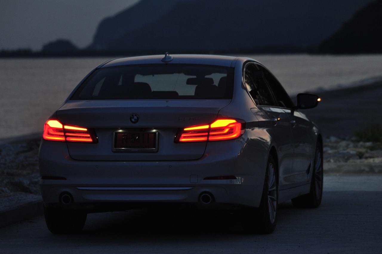 จากการใช้วัสดุที่มีน้ำหนักเบายิ่งขึ้น อลูมิเนียมอัลลอยรุ่นพิเศษ ทำให้รถ BMW 520d ซึ่งเป็น Series-5 เจเนอเรชั่นที่ 7 นี้มีน้ำหนักน้อยกว่ารุ่นก่อนหน้าถึง 100 กิโลกรัม โครงสร้างน้ำหนักเบาอัจฉริยะนี้ทำให้มั่นใจได้ในการกระจายน้ำหนักรถได้อย่างสมดุลระหว่างเพลาหน้าและเพลาหลังรวมถึงมีจุดศูนย์ถ่วงของรถที่ต่ำลง ผลลัพธ์ที่ได้คือสมรรถนะการขับขี่ที่แม่นยำ พวงมาลัยไฟฟ้ามีน้ำหนักที่เบาขึ้นแต่ยังแม่นยำเหมือนเดิม ผมลองลากรอบขึ้นไปที่ย่านความเร็วสูงพร้อมกับทำการเปลี่ยนทิศทางของตัวรถไปด้วยในเวลาเดียวกัน ล้อขนาด 18 นิ้ว กับยาง 245/45/R18 100Y มีประสิทธิภาพดีและไม่ก่อให้เกิดปัญหาในการควบคุมแต่อย่างใดเมื่อลองขับเร็วๆ แรงม้าทั้ง 190 ตัวถ่ายทอดลงสู่ระบบขับเคลื่อนล้อหลังผ่านเฟืองท้าย การปรับเปลี่ยนอัตราทดของเกียร์ Step-Tronic 8 สปีด เนียนจนไม่สามารถจับความรู้สึกยามตัวรถเปลี่ยนอัตราทดได้เลย มันเนียนจนเหมือนกับเกียร์ CVT ที่ไร้ตะเข็บรอยต่อใดๆ ที่จะทำให้รับรู้ถึงการเปลี่ยนเกียร์ขึ้น-ลง ในโหมด ECO PRO หากความเร็วสูงพอ เกียร์จะดันตัวเองไต่ไปสู่เกียร์สูงอย่างรวดเร็วเพื่อช่วยลดรอบเครื่องยนต์ ส่งผลให้เกิดความประหยัดเชื้อเพลิงอย่างสูงสุด ชนิดที่รถเล็กเครื่องดีเซลบางคันยังทำได้แย่กว่านี้ด้วยซ้ำ