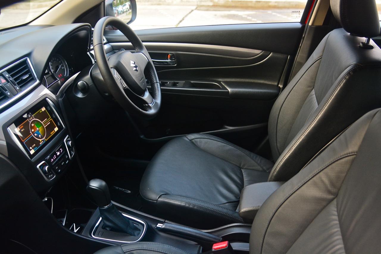 เบาะทุกตำแหน่งในรุ่น RS หุ้มหนัง พวงมาลัยสามก้านแบบสปอร์ตสไตล์ Suzuki หุ้มหนังแท้พร้อมสวิตช์ควบคุมและปรับตั้งระบบเครื่องเสียง สวิตช์รับหรือวางสายในระบบโทรศัพท์เคลื่อนที่ Bluetooth มาตรวัดที่ออกแบบให้อ่านค่าได้ง่าย ทั้งมาตรวัดความเร็วและมาตรวัดรอบของเครื่องยนต์ ใช้โทนสีขาวที่ให้แสงสว่างไม่รบกวนสายตาขณะขับขี่ในตอนกลางคืน ปุ่มสตาร์ทและดับเครื่องยนต์