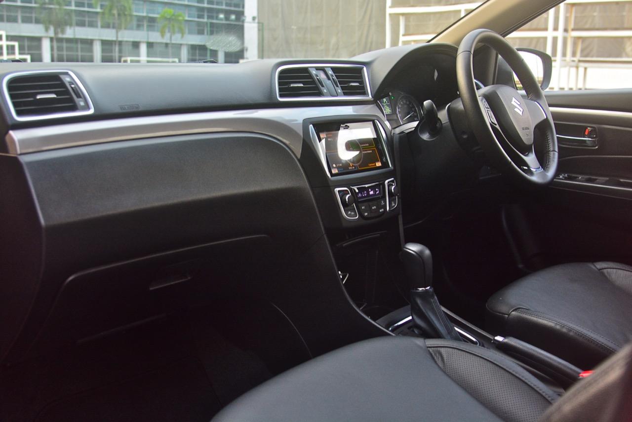 คอนโซลกลางของ Suzuki Ciaz RS เนื่องจากเสาหน้ามีองศาของความลาดเอียงมากเป็นพิเศษ คอนโซล หรือแดชต์บอร์ดจึงใหญ่โตเพื่อให้สอดรับกับความลาดของเสาหน้า คอนโซลขึ้นรูปด้วยพลาสติกเกรดเดียวกับ Swift มีการตกแต่งเดินเส้นตรงกึ่งกลางคอนโซลเพื่อความสวยงามด้วยชิ้นงานพลาสติกสีเงิน ไล่เรียงไปจนถึงแผงประตู เบาะคนขับ และเบาะคนนั่งปรับตั้งด้วยมือ ส่วนกระจกมองหลังพร้อมเลนส์ไฟเลี้ยวใช้การปรับตั้ง และพับเก็บได้ด้วยระบบไฟฟ้า ซุ้มเกียร์ออโต CVT เรียบง่ายด้วยงานพลาสติกและหนัง