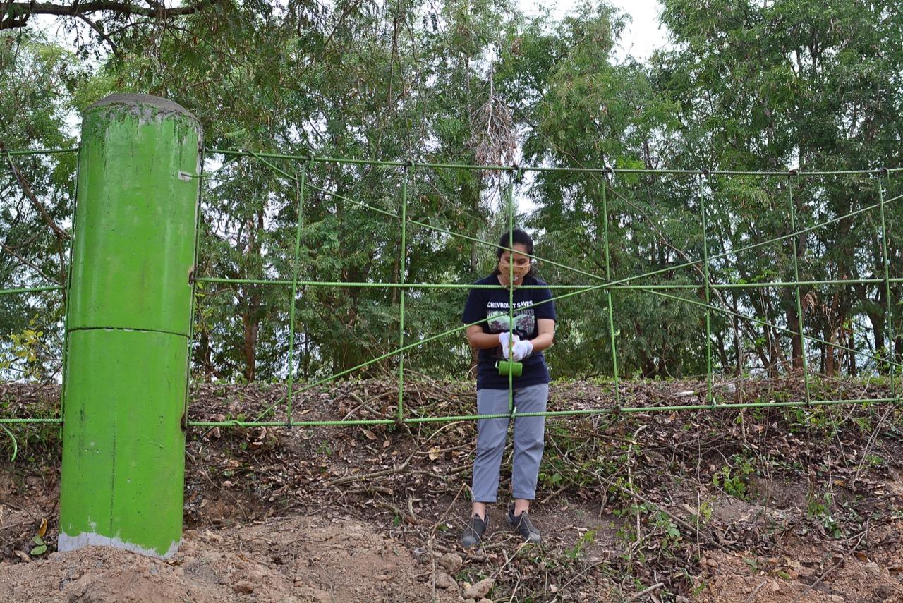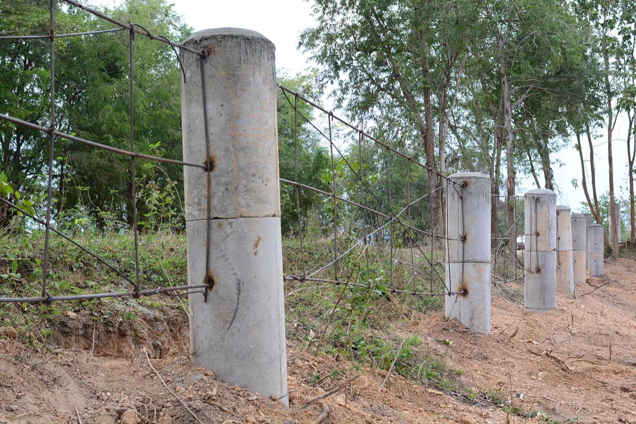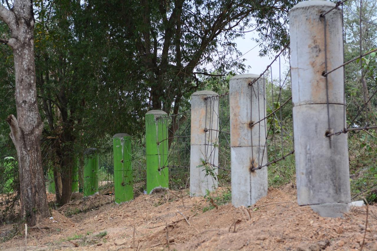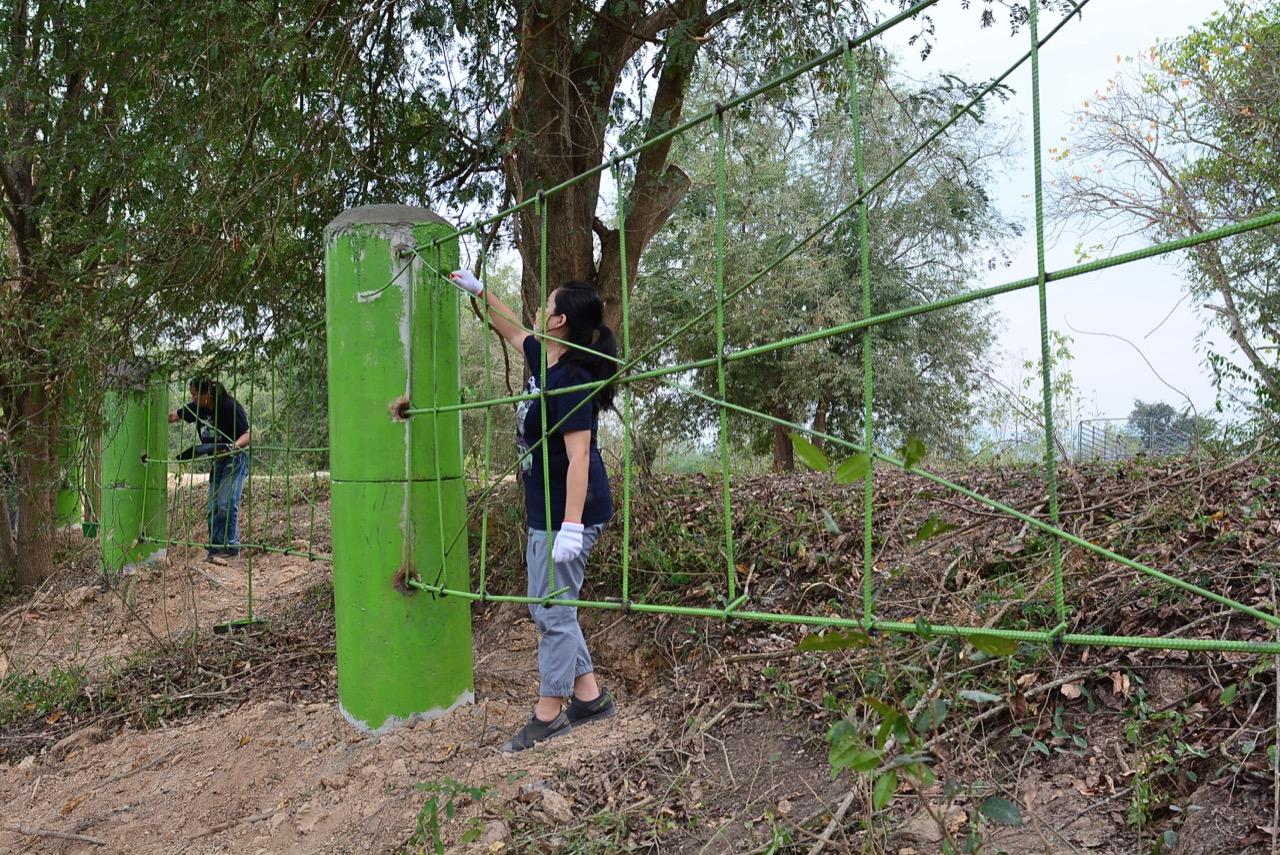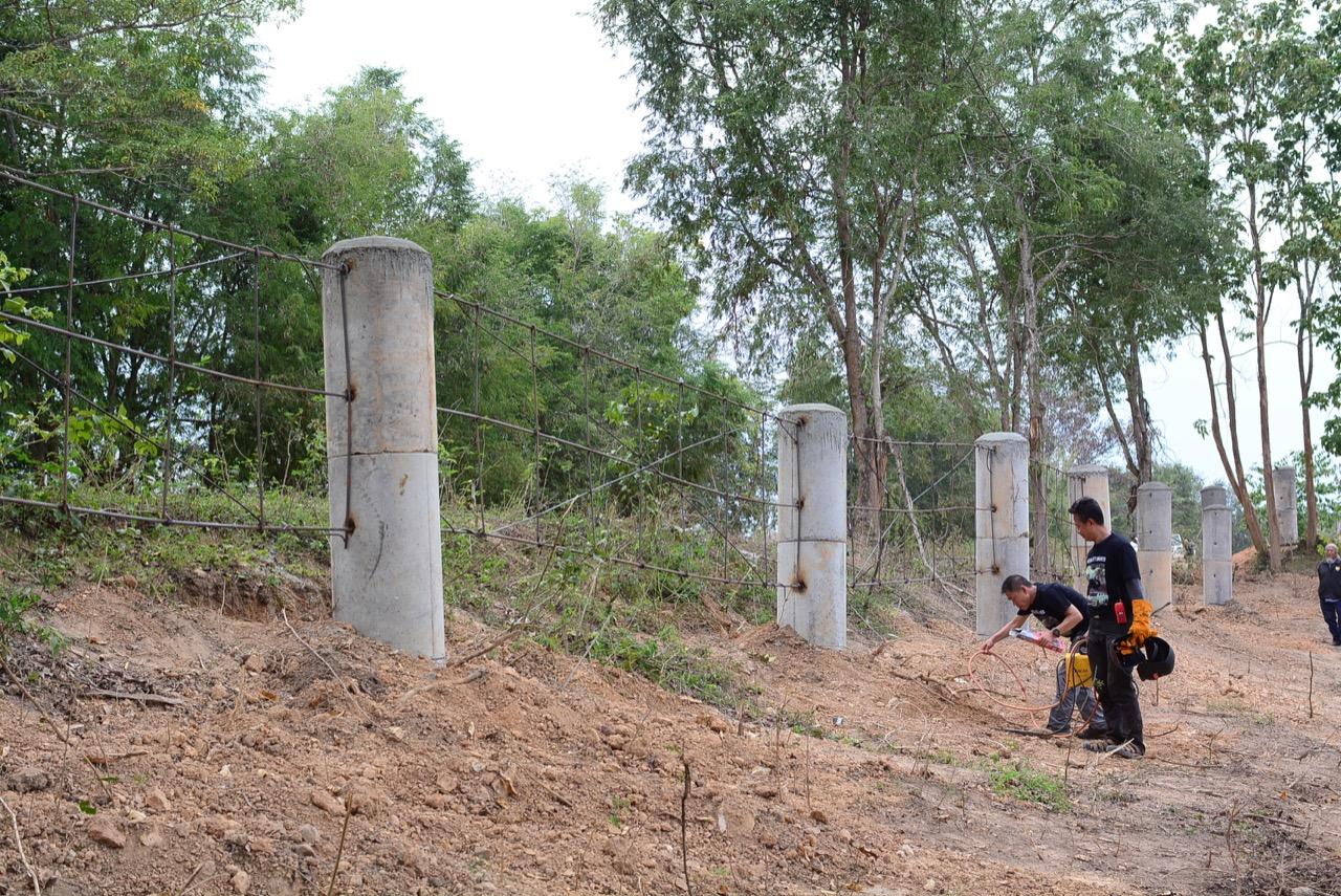 ส่วนแนวรั้วกั้นช้างป่าที่มีการสร้างเพิ่มเติมจากของเดิมยังคงต้องใช้เวลาและเงินทุนอีกมากในการสร้างต่อให้เสร็จ แนวรั้วดังกล่าวเป็นรั้วเสาปูนขนาดใหญ่ขึงกั้นด้วยเหล็กข้ออ้อยที่ใช้ในการก่อสร้าง โดยนำเหล็กเส้นมาเชื่อมต่อกันระหว่างแนวเสาแล้วทาสีเขียวให้กลมกลืนกับสภาพป่า อากาศที่ไม่ร้อนมากนักทำให้งานทาสีรั้วเสร็จลงอย่างรวดเร็วท่ามกลางสีเขียวของธรรมชาติในแถบผืนป่าตะวันตก