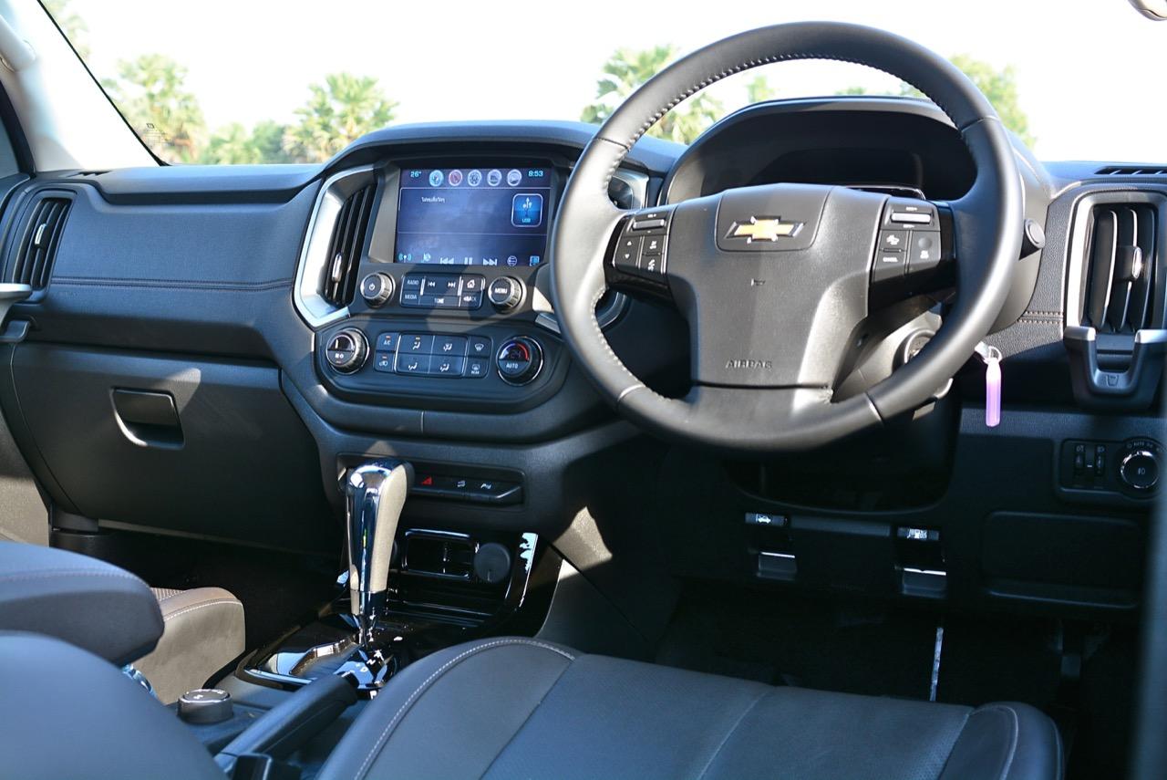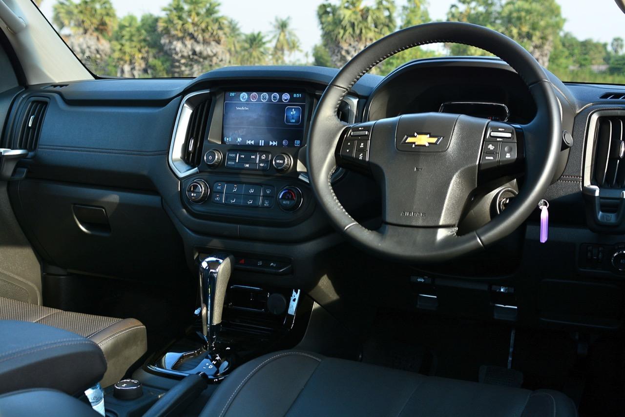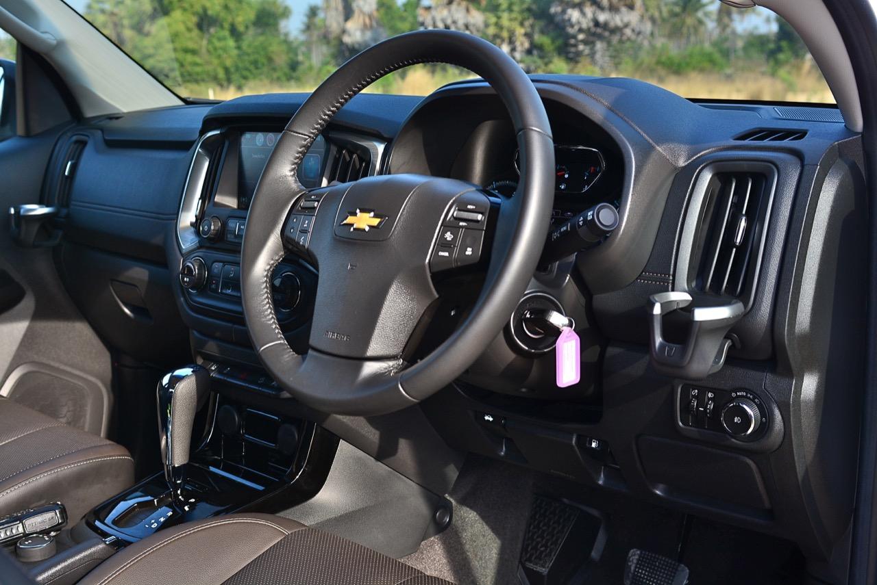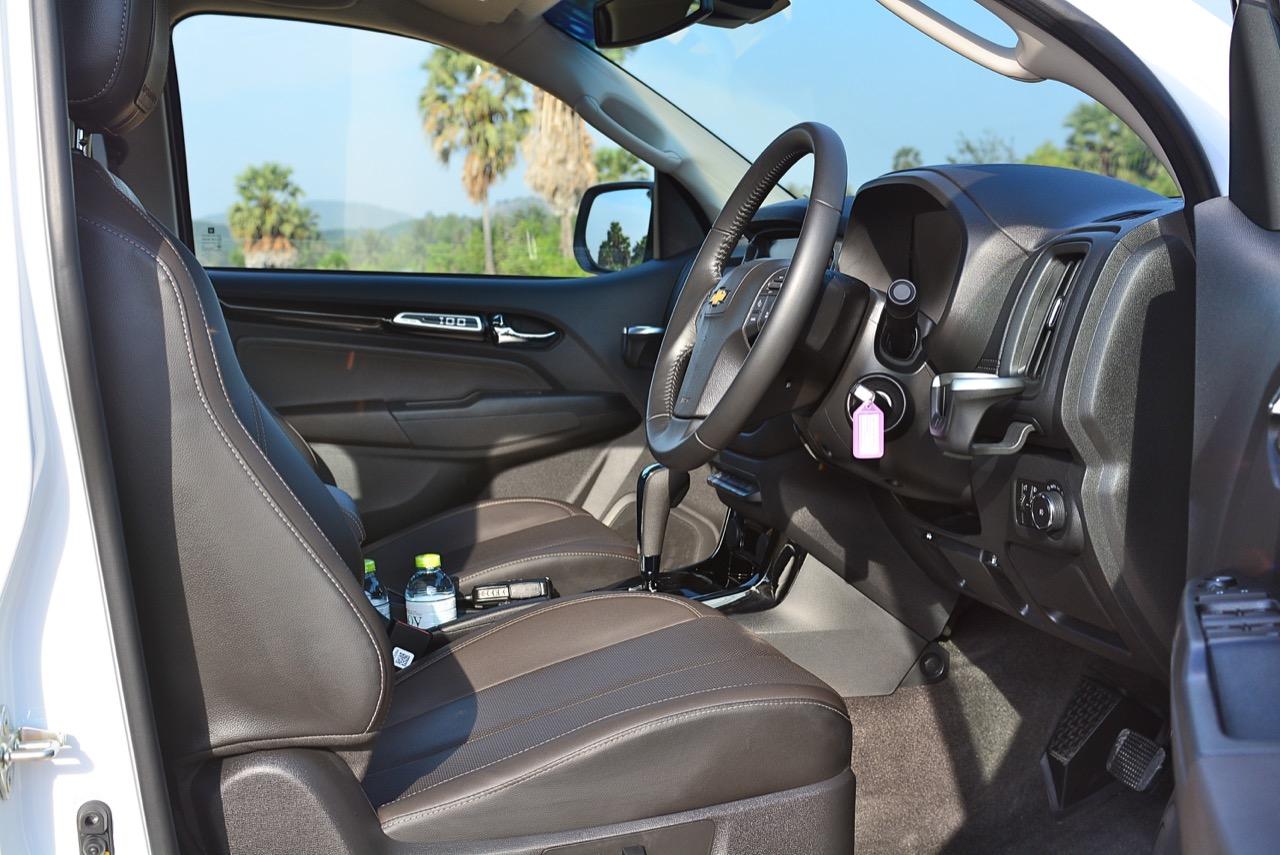 ก้าวขึ้นไปนั่งยังตำแหน่งคนขับของ New Colorado High Country Centennial Edition ความสูงบวกความกว้างขวางของกระบะสายลุยให้ความรู้สึกเหมือนกับนั่งลอยอยู่บนอากาศ ทัศนวิสัยที่เกิดจากระดับความสูงของตัวรถช่วยทำให้มองเห็นได้อย่างกว้างไกล แต่เมื่อหันไปมองด้านข้างอาจมีมุมมองของเสากลางและเสาท้ายบดบังสายตาอยู่บ้าง เบาะแบบสปอร์ตหุ้มหนังสีน้ำตาลเนื้อนิ่มนั่งสบาย ตำแหน่งของการนั่งยังเชื่อมโยงกับการใช้ปุ่มและสวิตช์ต่างๆ บริเวณคอนโซลกลาง ที่ผมชอบมากคือตำแหน่งของการวางหัวเกียร์ออโต้ที่สัมพันธ์กับท่านั่ง รวมถึงวงพวงมาลัยทรงสามก้านขนาดพอดีมือ หัวเกียร์ขนาดใหญ่ใช้วัสดุพวกโลหะชุบโครเมียมกับหนัง จับได้กระชับมือดี เมื่อโยกไปด้านซ้ายมือจะเป็นตำแหน่งทริปทรอนิกส์ที่ผู้ขับสามารถเปลี่ยนอัตราทดขึ้น-ลงได้ด้วยตัวเอง