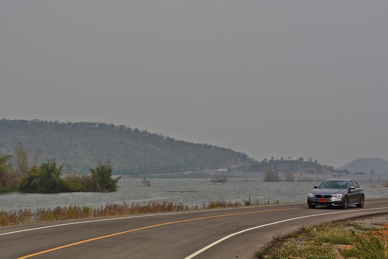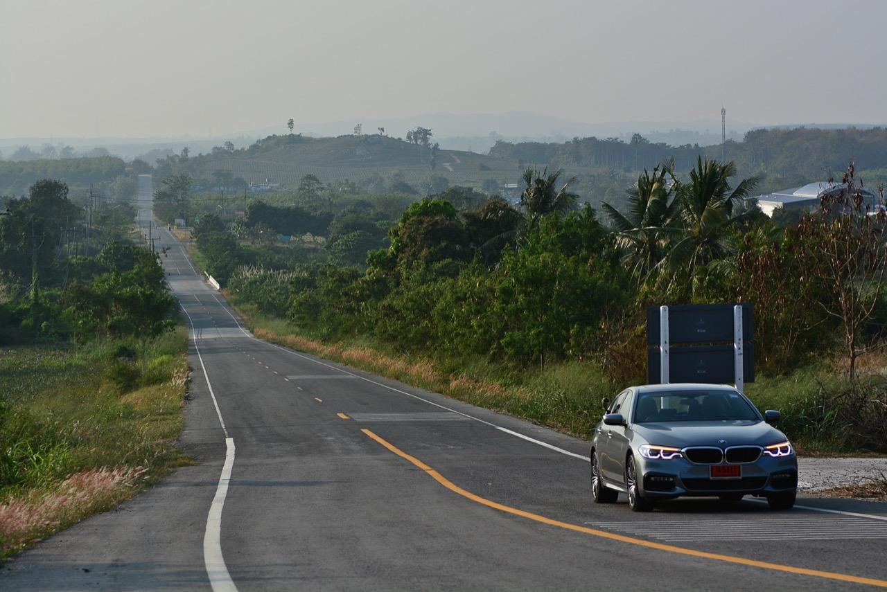 บนเส้นทางที่คดเคี้ยวรอบๆ อ่างเก็บน้ำห้วยกระพร้อยในจังหวัดกาญจนบุรี BMW 530e iPerformance ขับได้คล่องแคล่วเอามากๆราวกับ Series-3 f30 จุดเด่นดังกล่าวเกิดจากน้ำหนักตัวแค่ 1.7 ตันกับชุดบังคับเลี้ยวไฟฟ้าที่มาดมั่นสุดติ่ง รถให้ความรู้สึกเล็กเกินความเป็นจริงจากการเซตค่าแปรผันของพวงมาลัยที่ BMW มีความเชี่ยวชาญ พวงมาลัยไฟฟ้าที่ใช้มอเตอร์และวาล์วควบคุมแรงดันน้ำมันคอยปรับน้ำหนักของพวงมาลัยไปตามความเร็วและสภาพเส้นทาง ขับช้าพวงมาลัยจะเบาสบายมือแต่ยังคงความแม่นยำในระดับสูงสุด ขับเร็วขึ้นในโหมด Sport พวงมาลัยแสนรู้ของ 530e จะปรับน้ำหนักให้สอดคล้องกับความเร็วทำให้ควบคุมได้ง่ายขึ้นมาก การขับทางตรงบนไฮเวย์ด้วยความเร็วสูงไม่ต้องคอยมานั่งประคองพวงมาลัยให้เสียอารมณ์ ความมั่นคงของพวงมาลัยที่เริ่มกระชับรัดกุมขึ้นเรื่อยๆ จนรู้สึกได้เมื่อตัวเลขความเร็วเพิ่มขึ้นช่วยทำให้เกิดความมั่นใจ เจ้าของ Series-5 ทุกคนชอบขับรถเร็วอยู่แล้ว พอมาเจอเข้ากับการทรงตัวในย่านความเร็วสูงที่ยอดเยี่ยมรวมถึงพวงมาลัยแม่นๆ ก็ลืมความประหยัดและจัดกันแบบเต็มสูบ จ่ายเงินเกือบๆ 4 ล้านบาทจะให้มาขับหยอดๆ ย่องๆ คงไม่ใช่เรื่องที่ถูกต้องนัก