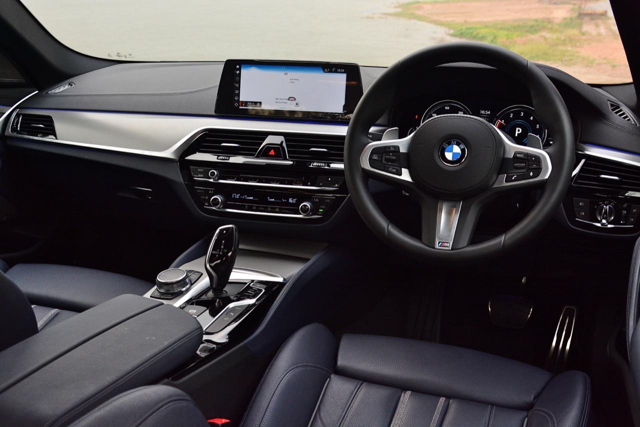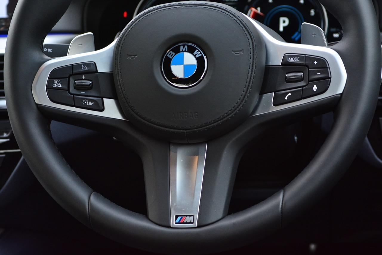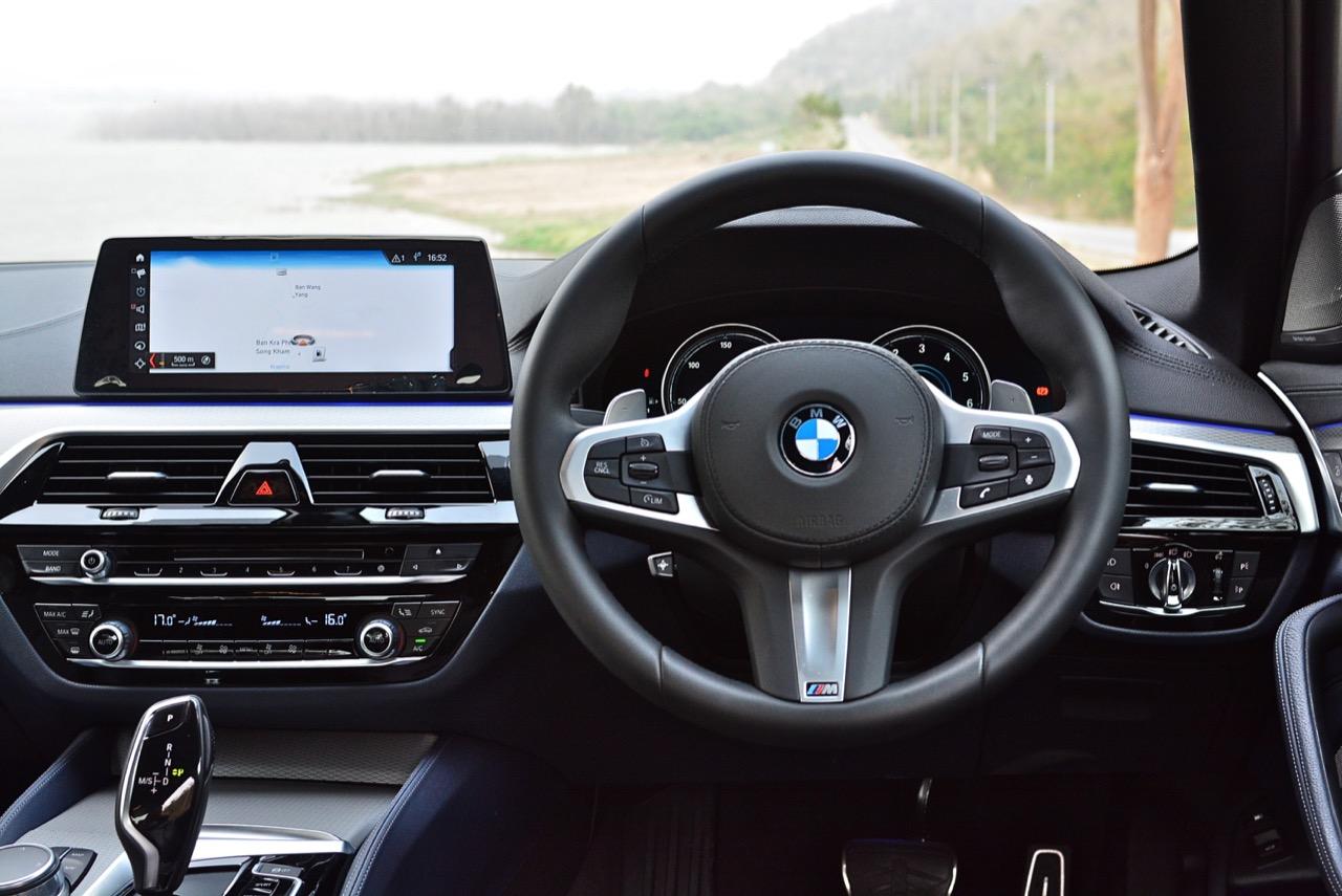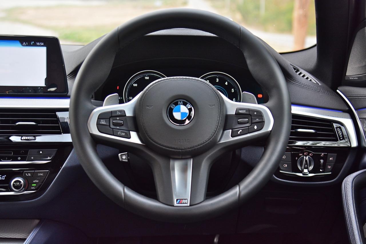 พวงมาลัย M-Sport แบบสามก้าน ทำจากวัสดุเกรดสูง ไม่ว่าจะเป็นหนังแท้ที่ใช้หุ้มรอบวงที่ค่อนข้างอวบอ้วนทำให้จับได้อย่างถนัดมือ ก้านวงติดตั้งสวิตช์สั่งงานต่างๆ ของระบบเครื่องเสียง การเลือกดูข้อมูลในจอภาพ MID รับหรือวางสายโทรศัพท์แบบบลูทูธ ปุ่มควบคุมปรับตั้งความเร็วอัตโนมัติ Cruise Control และที่ขาดไม่ได้สำหรับ Series-5 เวอร์ชั่น M-Sport ก็คือแป้นเปลี่ยนตำแหน่งเกียร์หลังพวงมาลัยหรือ Paddle Shift ใน 530e นั้นขนาดของแป้นเปลี่ยนเกียร์รวมถึงวัสดุที่ใช้ทำตัวแป้นนั้นจัดออกมาได้สวยงามน่าใช้งาน แทบจะคล้ายกับ Paddle ของ BMW M5 กันเลยทีเดียว พวงมาลัยปรับไฟฟ้าได้ 4 ทิศทางครอบคลุมท่านั่งและสรีระของคนขับทั้งหมดไม่ว่าจะอ้วนเตี้ยสูงโย่งหรือมีหุ่นแบบนายแบบนางแบบก็ปรับและขับได้อย่างถนัดรัดกุม
