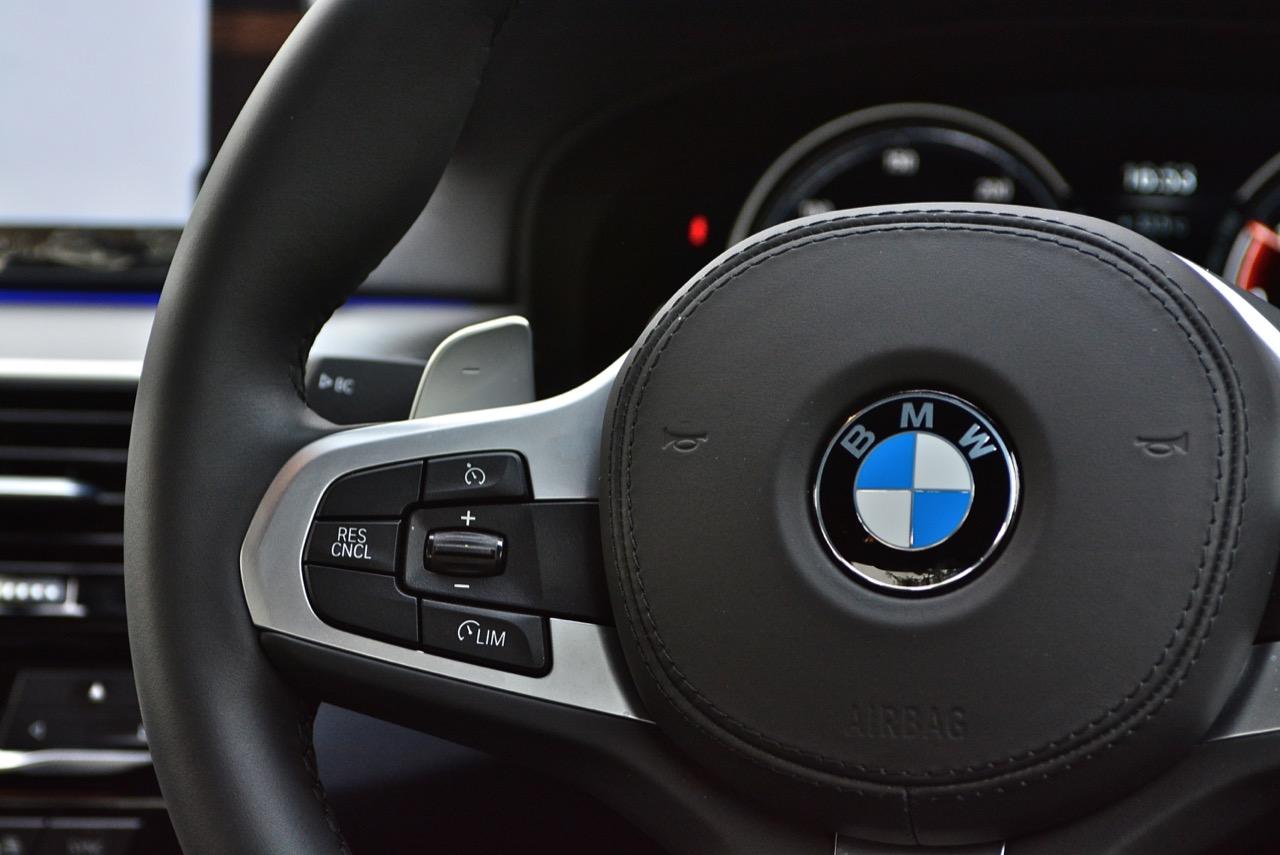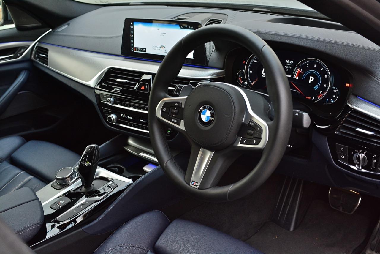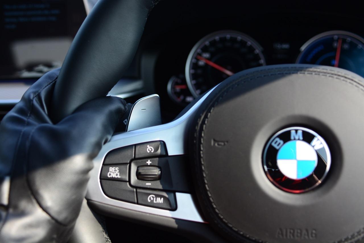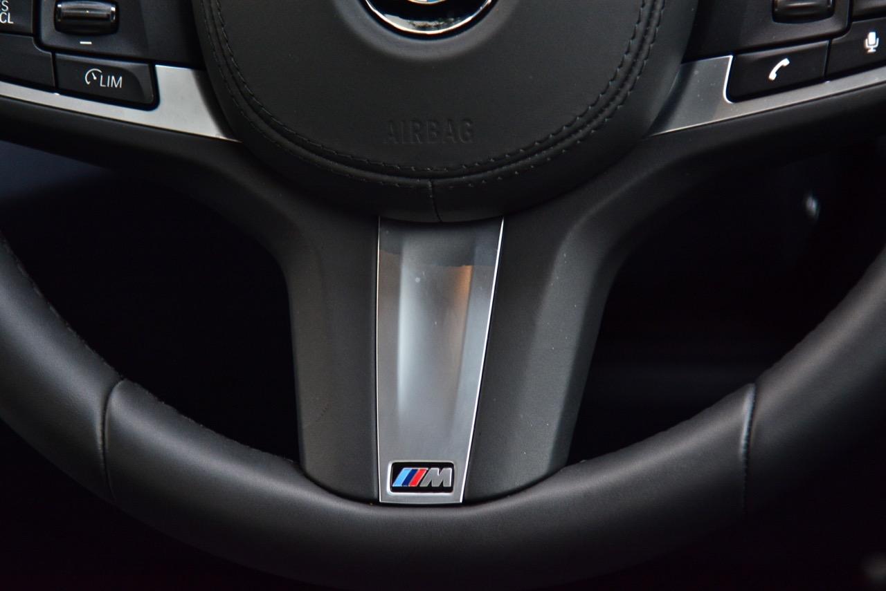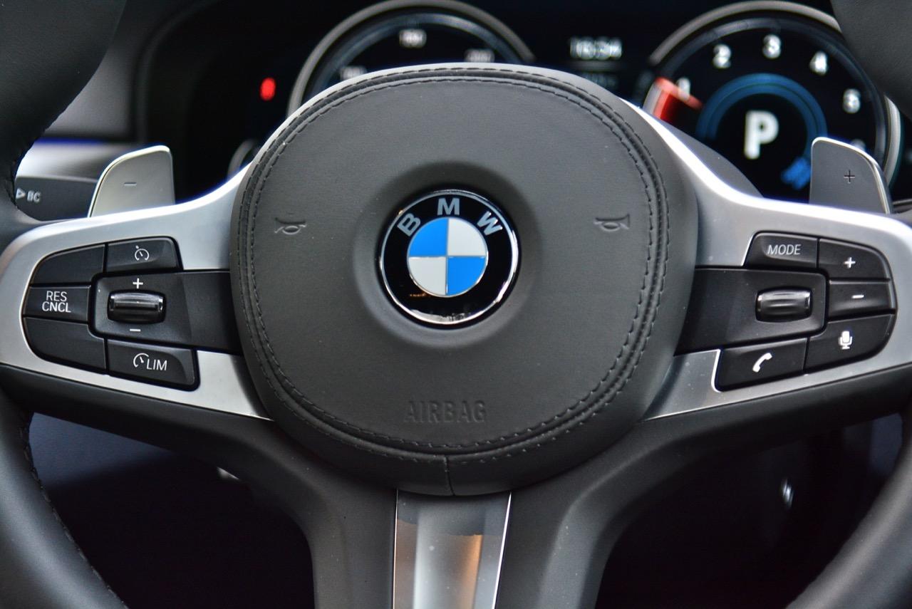พวงมาลัย M-Sport แบบสามก้าน ทำจากวัสดุเกรดสูง ไม่ว่าจะเป็นหนังแท้ที่ใช้หุ้มรอบวงที่ค่อนข้างอวบอ้วนทำให้จับได้อย่างถนัดมือ ก้านวงติดตั้งสวิตช์สั่งงานต่างๆ ของระบบเครื่องเสียง การเลือกดูข้อมูลในจอภาพ MID รับหรือวางสายโทรศัพท์แบบบลูทูธ ปุ่มควบคุมปรับตั้งความเร็วอัตโนมัติ Cruise Control และที่ขาดไม่ได้สำหรับ Series-5 เวอร์ชั่น M-Sport ก็คือแป้นเปลี่ยนตำแหน่งเกียร์หลังพวงมาลัยหรือ Paddle Shift ใน 530e นั้นขนาดของแป้นเปลี่ยนเกียร์รวมถึงวัสดุที่ใช้ทำตัวแป้นนั้นจัดออกมาได้สวยงามน่าใช้งาน แทบจะคล้ายกับ Paddle ของ BMW M5 กันเลยทีเดียว พวงมาลัยปรับไฟฟ้าได้ 4 ทิศทางครอบคลุมท่านั่งและสรีระของคนขับทั้งหมดไม่ว่าจะอ้วนเตี้ยสูงโย่งหรือมีหุ่นแบบนายแบบนางแบบก็ปรับและขับได้อย่างถนัดรัดกุม