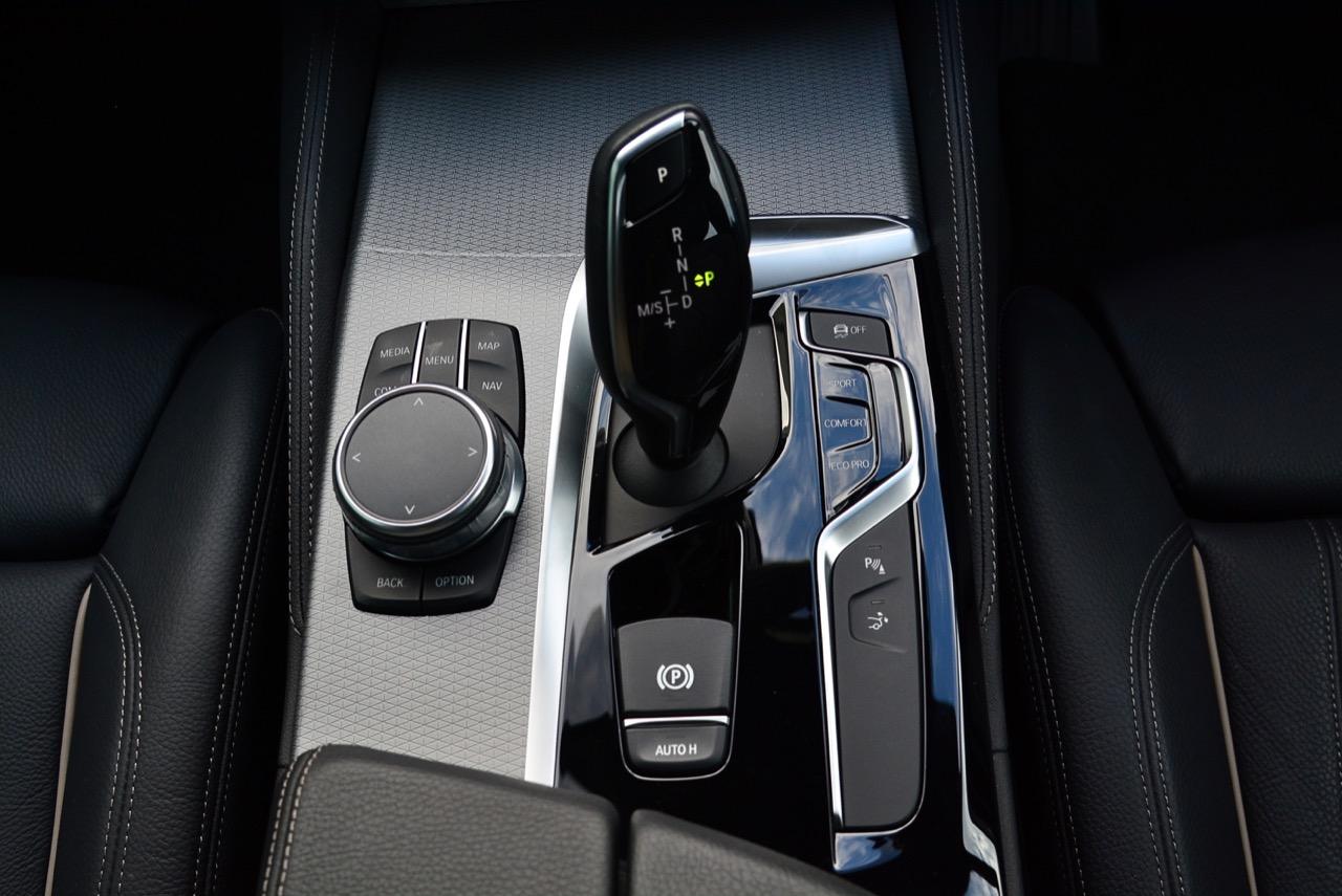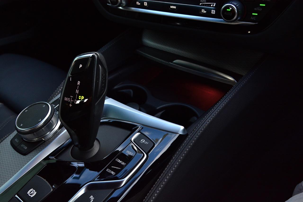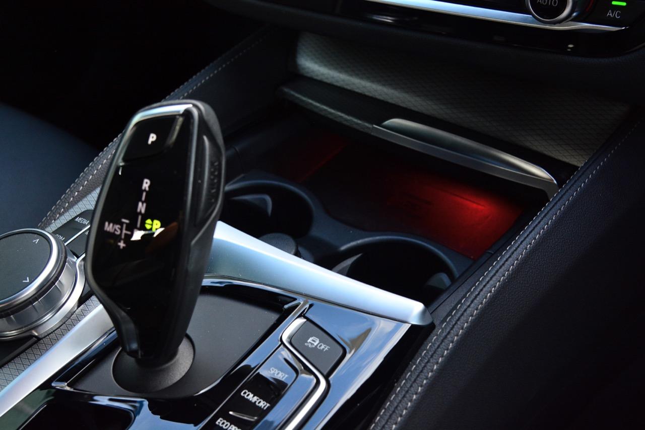 ซุ้มคันเกียร์ ZF8HP ล้อมกรอบด้วยงานอัลลอยสีเงินยวง หนังและพลาสติกสีดำเปียโนแบล็ก คันเกียร์ยกมาจาก New Series-5 G30 บริเวณด้านข้างของคันเกียร์ติดตั้งสวิตช์ปรับโหมดการขับขี่ สวิตช์เปิด-ปิดระบบควบคุมการทรงตัว สวิตช์เปิด-ปิดวิงหลังแบบไฟฟ้า ปุ่มเบรกมือไฟฟ้าพร้อมระบบ auto brake hold ข้างคันเกียร์ด้านซ้ายเป็นปุ่มควบคุมของระบบ iDRIVE เวอร์ชั่นใหม่ที่มีการทำงานรวดเร็วและง่ายต่อการปรับตั้ง