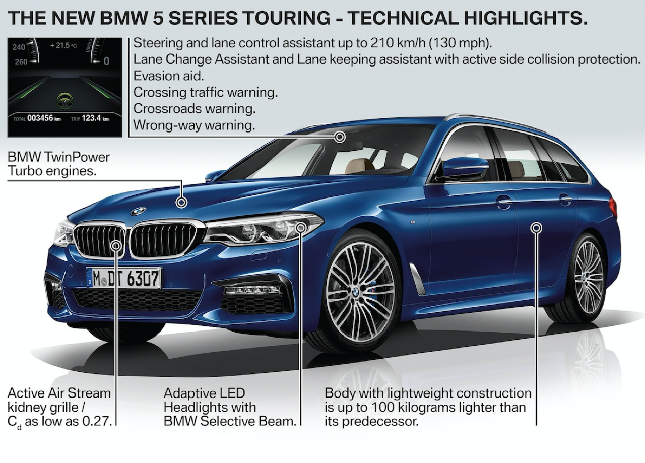 โครงสร้างพื้นฐานของ Series-5 Touring รหัส G31 เป็นแบบ Cluster Architecture หรือ CLAR ที่มีจุดเด่นเรื่องน้ำหนักซึ่งถูกปรับให้เบากว่าเดิม 100 กิโลกรัม เป็นผลมาจากการผสมผสานวัสดุหลายอย่างในโครงสร้างและเปลือกตัวถัง เช่น โลหะเหล็กกล้า ไทเทเนียม แมกนีเซียม และ อะลูมิเนียม ตัวเลขค่าสัมประสิทธิ์แรงเสียดทานของ 5-Series G30 รุ่นซีดาน 4 ประตู อยู่ที่ 0.22 (cd 0.22) เมื่อเปลี่ยนรูปลักษณ์มาเป็นรถสเตชั่นแวกอน เจ้า G31 5-Series Touring มีค่าสัมประสิทธิแรงเสียดทานอากาศแย่ลงเล็กน้อยที่ 0.27 (cd 0.27)