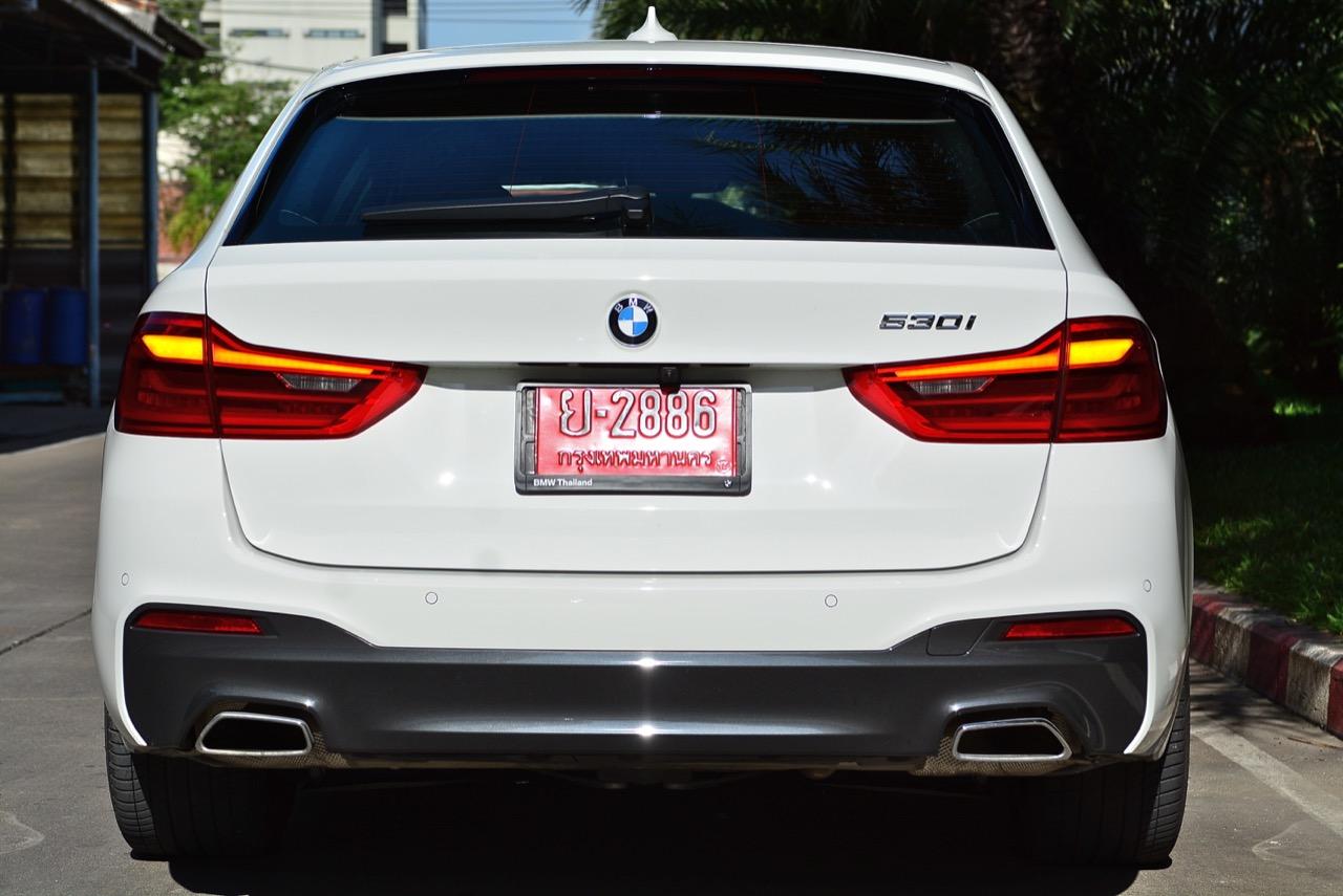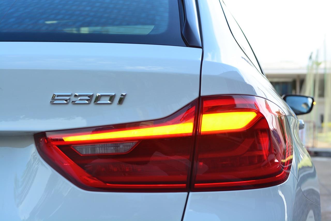 หลอดไฟท้ายและไฟเบรกดวงที่สามใช้หลอด LED ทั้งหมด รุ่น Touring M-SPORT มีกล้องถอยติดตั้งมาให้พร้อมระบบจอดอัตโนมัติ เซนเซอร์ถอยหลังพร้อมจอแสดงผลแบบกราฟิกช่วยให้ถอยได้อย่างปลอดภัย ฝาท้ายบริเวณกระจกยังมีใบปัดน้ำฝนติดมาให้เพื่อความสะดวกและช่วยให้มุมมองด้านหลังยามต้องวิ่งฝ่าสายฝนให้ทัศนวิสัยของกระจกบังลมบานหลังกระจ่างตาขึ้น เสาโทรศัพท์ทรงครีบกระโดงปลาฉลามยังคงมีมาให้เหมือนเดิม สำหรับรุ่น Touring M-SPORT จะมีสปอยเลอร์หลังที่แตกต่างจากรุ่นปกติพร้อมท่อระบายไอเสียทรงเหลี่ยมแบบท่อเดี่ยวที่ด้านซ้ายและขวา บั้นท้ายที่งดงามทำให้ 530i Touring M-SPORT กลายเป็นรถตรวจการของผู้มีอันจะเหลือกินไปโดยปริยาย ฝาท้ายที่เปิดออกได้แบบอัตโนมัติด้วยไฟฟ้าของ 5 Serries Touring สร้างพื้นที่ของการเก็บสัมภาระได้มากกว่า Series-5 รุ่น 4 ประตู เป็นอีกหนึ่งจุดเด่นของรถยนต์สเตชั่นแวกอนจากค่าย BMW สวิตช์กดเพื่อเปิดหรือปิดหลังคาทั้งการใช้รีโมตกุญแจหรือกดสั่งปิดที่สวิตช์ใกล้ๆ ขอบของฝาท้าย ช่วยอำนวยความสะดวกสบายในการใช้งาน