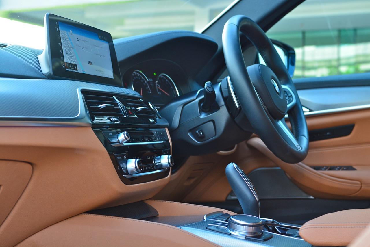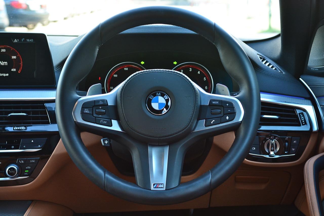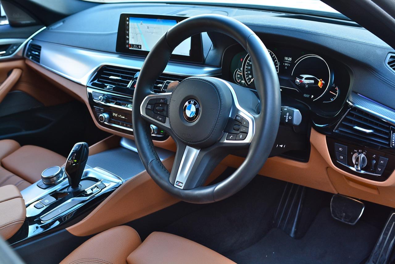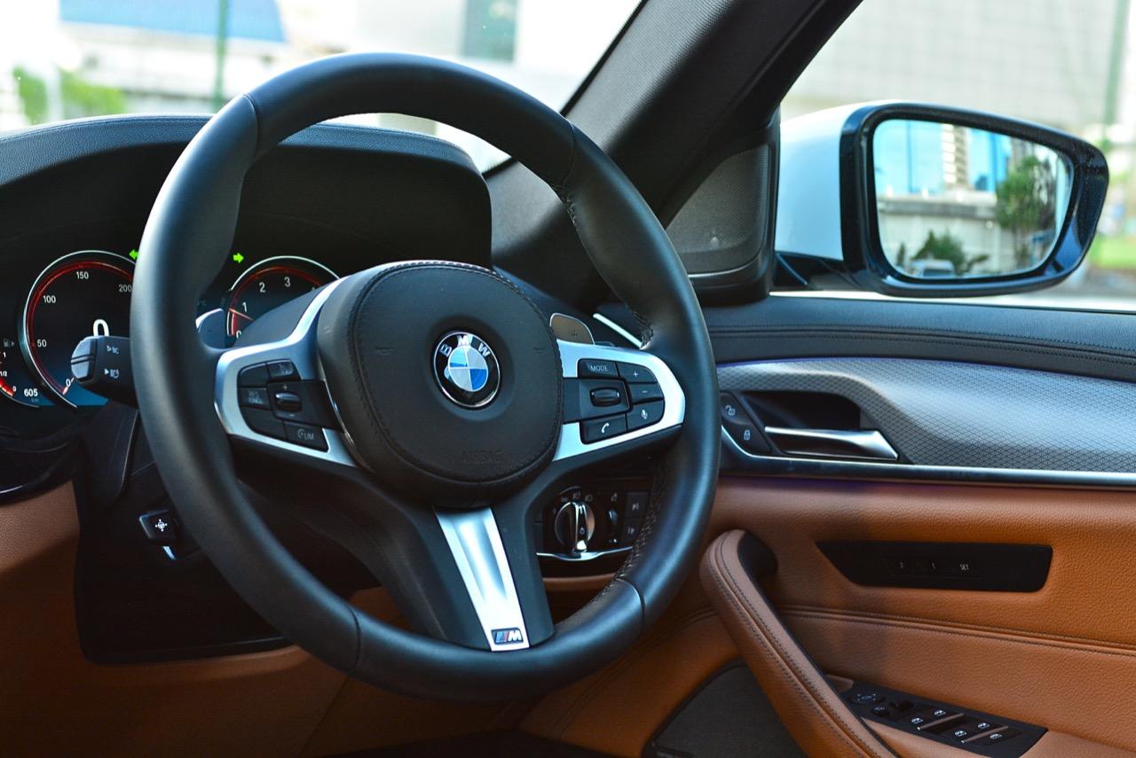 5-Series รุ่น Touring G31 ที่ตกแต่งด้วยชุดแต่งของ M-SPORT มีพวงมาลัย M แบบใหม่ทรงสามก้านสวยงามจับได้กระชับมือ เป็นพวงมาลัยวงเดียวกันกับของ 5-Series ซีดานรุ่น 530i M-SPORT ที่ห่อหุ้มรอบวงด้วยฟองน้ำหนาๆ แล้วหุ้มหนังแท้เย็บเดินตะเข็บอย่างแน่นหนาเพื่อความคงทน พวงมาลัย M มีสวิตช์สั่งงานในการปรับตั้ง Adaptive Cruise Control ปุ่มควบคุมเครื่องเสียง สวิตช์เลือกโหมดต่างๆ และปุ่มรับหรือวางสายโทรศัพท์บลูทูธ แป้น Paddle Shift ทำออกมาให้มีขนาดที่ใหญ่กว่าพวงมาลัยแบบมาตรฐานซึ่งลงตัวและอยู่ในตำแหน่งที่สามารถใช้นิ้วแตะได้อย่างรวดเร็ว หลังคากระจกพาโนรามิกเปิดออกได้เกือบทั้งผืน สร้างบรรยากาศของความหลงไหลสำหรับคนที่ชอบขับรถท่ามกลางแสงจันทร์