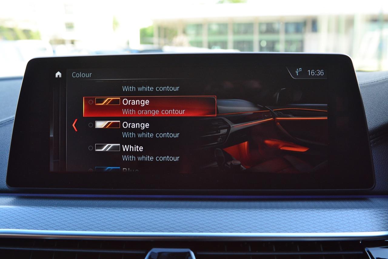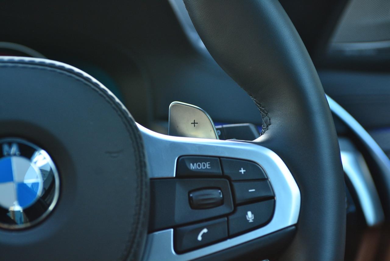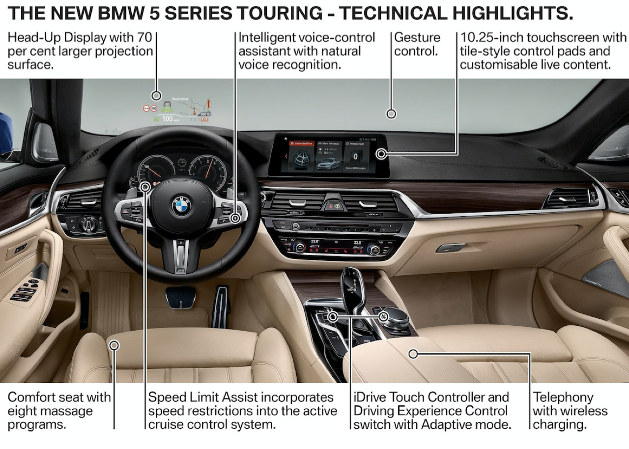 5-Series รุ่น Touring G31 ที่ตกแต่งด้วยชุดแต่งของ M-SPORT มีพวงมาลัย M แบบใหม่ทรงสามก้านสวยงามจับได้กระชับมือ เป็นพวงมาลัยวงเดียวกันกับของ 5-Series ซีดานรุ่น 530i M-SPORT ที่ห่อหุ้มรอบวงด้วยฟองน้ำหนาๆ แล้วหุ้มหนังแท้เย็บเดินตะเข็บอย่างแน่นหนาเพื่อความคงทน พวงมาลัย M มีสวิตช์สั่งงานในการปรับตั้ง Adaptive Cruise Control ปุ่มควบคุมเครื่องเสียง สวิตช์เลือกโหมดต่างๆ และปุ่มรับหรือวางสายโทรศัพท์บลูทูธ แป้น Paddle Shift ทำออกมาให้มีขนาดที่ใหญ่กว่าพวงมาลัยแบบมาตรฐานซึ่งลงตัวและอยู่ในตำแหน่งที่สามารถใช้นิ้วแตะได้อย่างรวดเร็ว หลังคากระจกพาโนรามิกเปิดออกได้เกือบทั้งผืน สร้างบรรยากาศของความหลงไหลสำหรับคนที่ชอบขับรถท่ามกลางแสงจันทร์