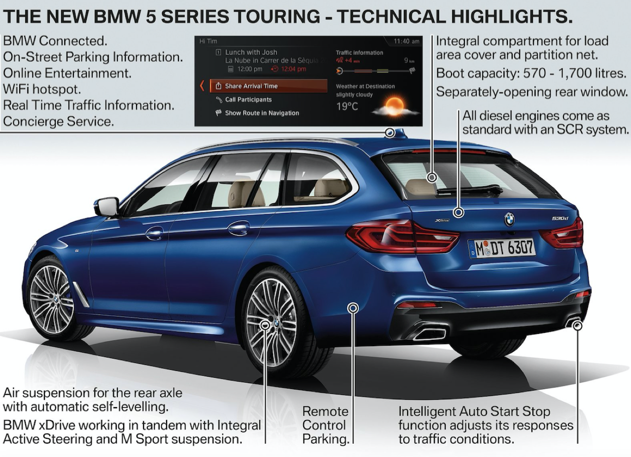 พื้นที่เก็บสัมภาระของ Series-5 G31 อยู่ที่ 570 ลิตร และเมื่อพับเบาะหลังจะสามารถขยายพื้นที่ออกไปจนถึง 1,700 ลิตร เบาะนั่งด้านหลังสามารถแยกพับได้อิสระ 40 : 20 : 40 พร้อมสวิตช์ไฟฟ้าสำหรับกลไกพับเบาะ การออกแบบที่ชาญฉลาดทำให้ BMW 530i Touring รุ่นใหม่มีพื้นที่เก็บของเพิ่มมากขึ้น 10 ลิตร เมื่อยังไม่ได้พับเบาะหลัง และจะเพิ่มเป็น 30 ลิตร เมื่อพับเบาะ