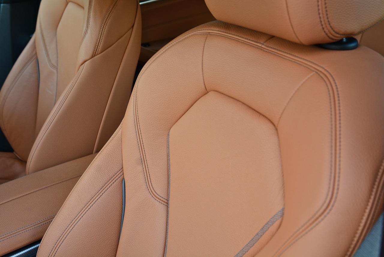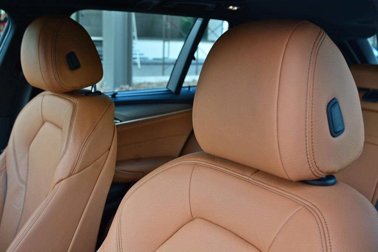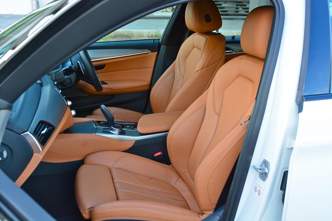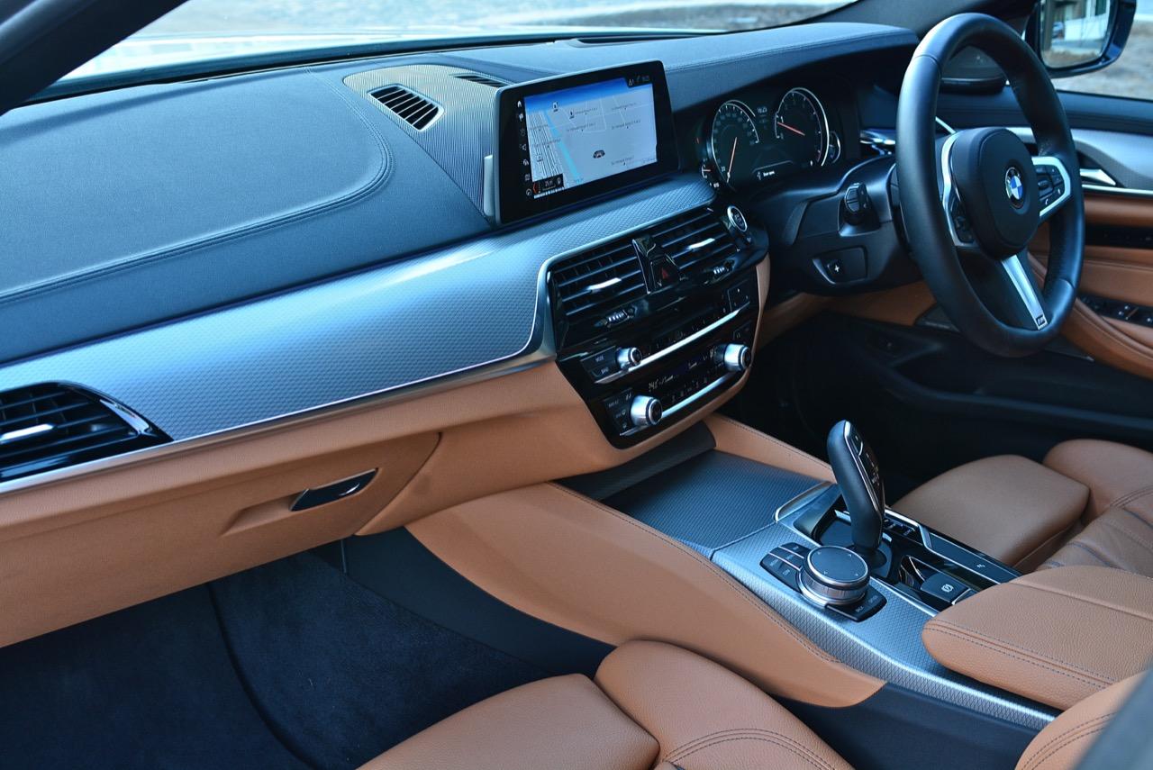 ภายในของ BMW530i Touring M-SPORT ใช้เบาะสีน้ำตาลตัดกับสีดำของแดชบอร์ดคอนโซลมีชิ้นงานอะลูมินั่มอัลลอยคาดกลางแดชบอร์ดเพื่อความหรูหรา เบาะสีน้ำตาลแบบสปอร์ตปรับไฟฟ้าทั้งเบาะคนขับและคนนั่ง วิศวกรของ BMW จัดวางตำแหน่งท่านั่งขับหรือนั่งโดยสารได้อย่างลงตัว คอนโซลที่ทำจากโฟมขึ้นรูปแล้วห่อหุ้มด้วยวัสดุพวกหนังสังเคราะห์ช่วยซับเสียงแปลกปลอมจากภายนอกได้ดี ภายในที่เหมือนกับ 5-Series ซีดานให้อารมณ์สปอร์ตจากรูปแบบการจัดวางอุปกรณ์