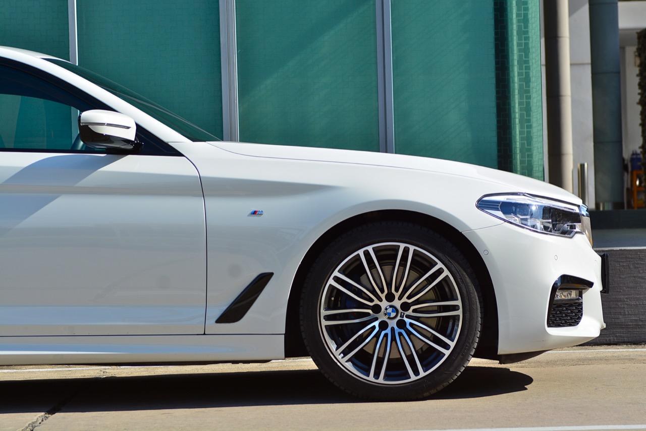 ด้านข้างตัวถังของ G31 530i Touring M-SPORT มีแนวเส้นไล่จากแก้มข้างไปจนสุดที่มุมของไฟท้าย แวกอนรุ่นล่าสุดคันนี้ยังมีเรือนร่างที่คล้ายกับ Series-5 F11 เพียงแต่มีขนาดที่ย่อมลงมาเล็กน้อย โดยเฉพาะเสาท้ายและทรงของไฟท้ายที่ลงตัว กระจกบังลมด้านข้างที่มีลักษณะเฉพาะตัว รวมถึงเสาที่มีมากถึงสี่ต้น (เสาหน้า / เสากลาง และอีกสองที่ด้านท้ายเมื่อทรงของมันกลายเป็นรุ่นสเตชั่นแวนกอน) พื้นฐานของแชสซีส์ยังคงใช้ร่วมกับ Series-5 G30 รุ่นซีดาน รวมถึงเครื่องยนต์ เกียร์และอะไหล่พวกช่วงล่างกับอุปกรณ์ภายในที่เหมือนกับ Series-5 530i M-SPORT กระจกมองข้างมีไฟเลี้ยวแบบแอลอีดี ล้ออัลลอยขอบ 19 นิ้ว เป็นล้อ M รุ่นใหม่ล่าสุดที่ล้างค่อนข้างยาก ห่อรัดด้วยยาง Michelin รุ่น Primacy 3 เป็นยางต่างขนาดหน้าเล็กหลังใหญ่ ล้อหน้า 245/40/R19 ส่วนล้อหลัง 275/35/R19