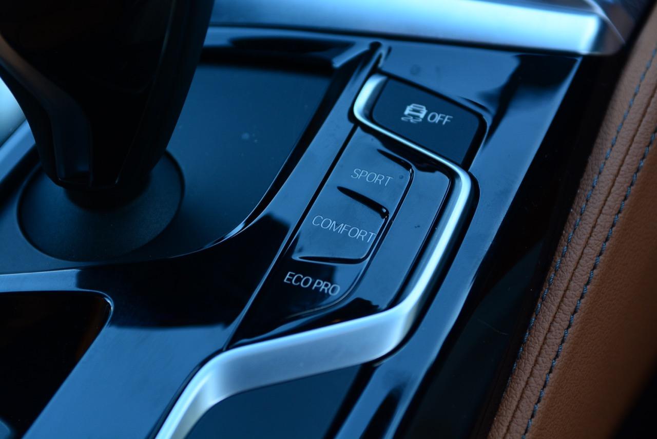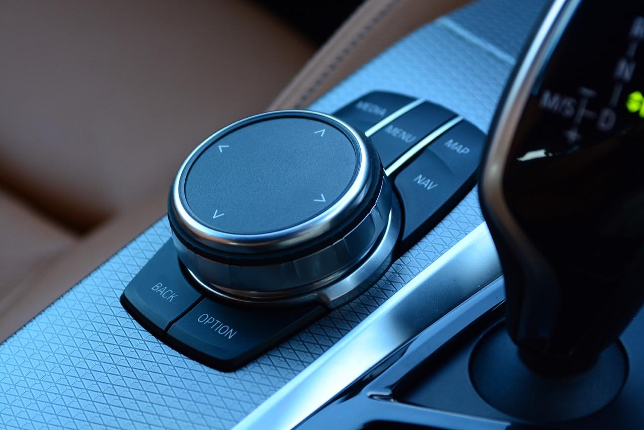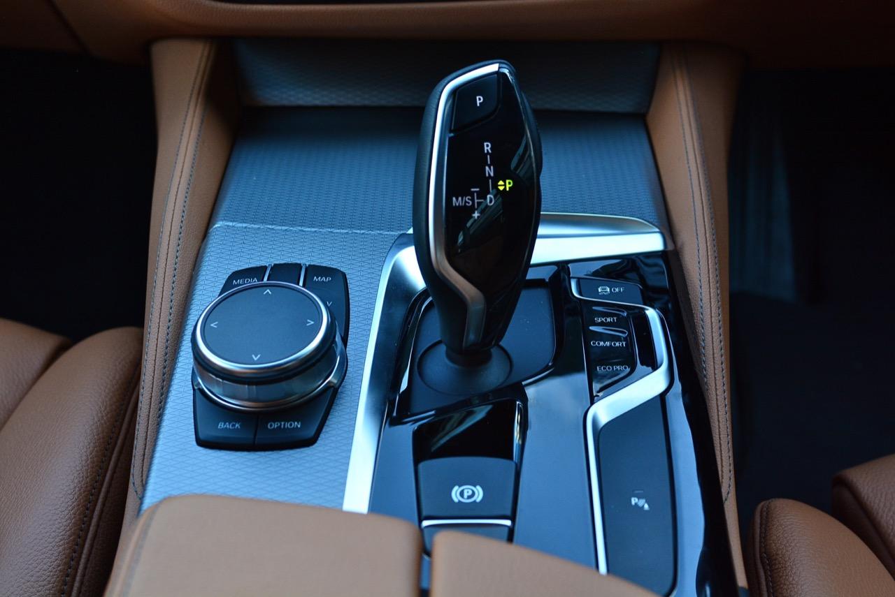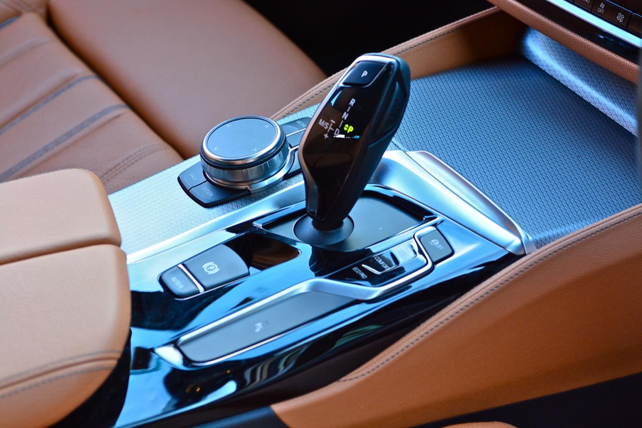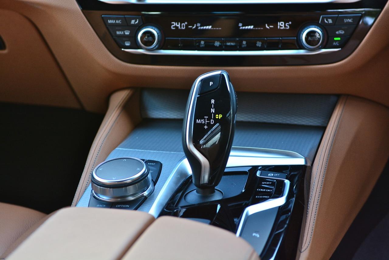 ซุ้มเกียร์เต็มไปด้วยงานตกแต่งจากวัสดุหรูหรามีระดับ สอดรับกับชิ้นงานอัลลอยสีเงินที่ใช้ในการตกแต่ง หัวเกียร์ยุคใหม่ของ BMW New Series-5 ใช้ทรงเดียวกันแทบจะทั้งหมดยกเว้น M5 หัวเกียร์ไซส์ใหญ่มีการออกแบบให้จับได้กระชับ กลไกแบบคันโยกเบามือด้วยการสั่งงานผ่านระบบควบคุมด้วยไฟฟ้า ค่าย BMW นับเป็นผู้ผลิตรถยนต์รายแรกของโลกที่นำเอาระบบเกียร์อัตโนมัติ 8 สปีด ของ ZF มาติดตั้งไว้ในรถยนต์สเตชั่นแวนกอนระดับพรีเมียมคันนี้ หลังจากนั้น Mercedes Benz E220d Estate จึงหันมาสวนกลับด้วยเกียร์ 9 สปีด! หากพิจารณาเปรียบเทียบในเรื่องของขนาดและน้ำหนักกับเกียร์อัตโนมัติ 9 สปีดของรถคู่แข่งอย่าง Mercedes Benz E220d Estate ที่มีอัตราทดมากกว่า 1 ตำแหน่งถือว่าไม่มีความแตกต่างกันมากนัก