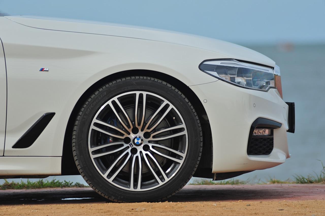 Dynamics บนแชสซีผสมผสานความสามารถของชุดบังคับเลี้ยวไฟฟ้า ช่วยให้การควบคุมพวงมาลัยมีความเบาสบายมือ น้ำหนักของพวงมาลัยในแวกอนคันนี้ขึ้นตรงกับโหมดของการขับเคลื่อนและความเร็วที่ใช้ ในย่านความเร็วต่ำ น้ำหนักของพวงมาลัยใน G31 ถูกปรับจูนให้เบามือ ระยะของการหมุนและการสื่อสารระหว่างผิวถนนกับคนขับไม่แตกต่างจากรุ่นซีดาน 4 ประตูมากนัก บนโหมดการขับขี่แบบประหยัดหรือ ECO-PRO Mode พวงมาลัยจะตอบสนองด้วยความรู้สึกที่เบาสบายมือ การหักเหทิศทางมีความแม่นยำ กริ้บของรอบวงจากพวงมาลัย M หุ้มฟองน้ำอย่างหนาแล้วห่อเย็บด้วยหนังแท้ซึ่งทำให้จับได้อย่างกระชับมือ พวงมาลัยไฟฟ้าแบบ Electro Hydraulic Servo Valve power steering ของ BMW กลายเป็นนวัตกรรมที่มีความโดดเด่นเมื่อมันทำงานร่วมแกนกับช่วงล่างอัลลอยที่หนึบแน่น 530i จะส่งถ่ายประสบการณ์ของการควบคุมที่ดีผ่านข้อมือของผู้ขับขี่ให้ได้รับรู้ตลอดเวลา น้ำหนักของระบบจะแปรผันไปตามความเร็วที่ใช้ สมองกลที่ควบคุมการแปรผันน้ำหนักจะคอยปรับน้ำหนักพวงมาลัยให้มีความสมดุลกับความเร็วอยู่ตลอดเวลา ล้อขอบ 19 นิ้วและยาง 245/40/R19 ที่ล้อหน้าไม่ใหญ่โตจนเกินไป และขับได้ง่ายกว่าล้อ M ขอบ 20 นิ้วที่แพงหูดับทั้งล้อและยาง ล้อวงโตทำให้คุณต้องคอยระวังหลุม ขอบฟุตปาท และความย่ำแย่ของผิวทางในบางช่วงบางตอนที่มีอยู่เยอะมากบนถนนของประเทศไทย
