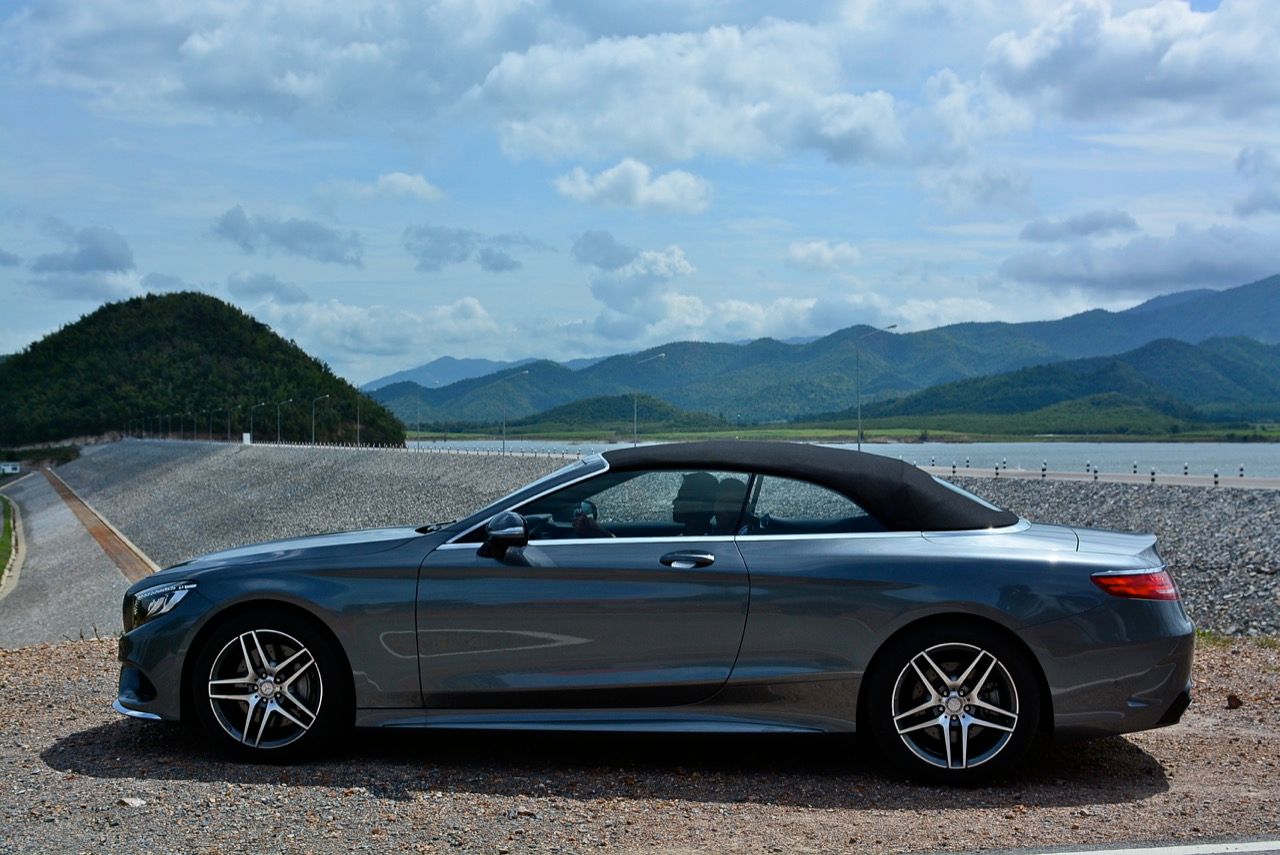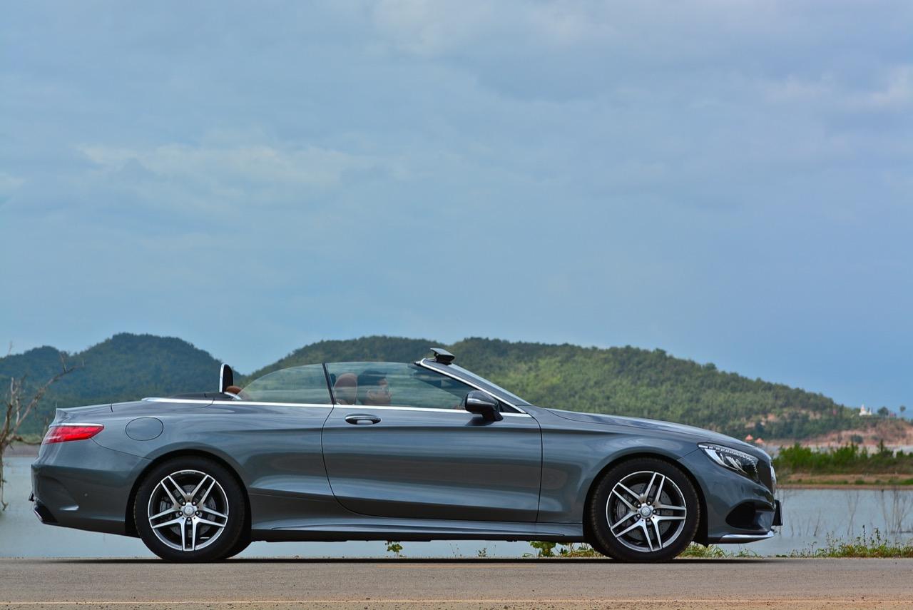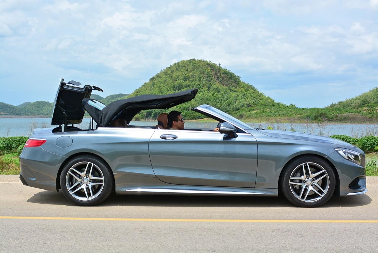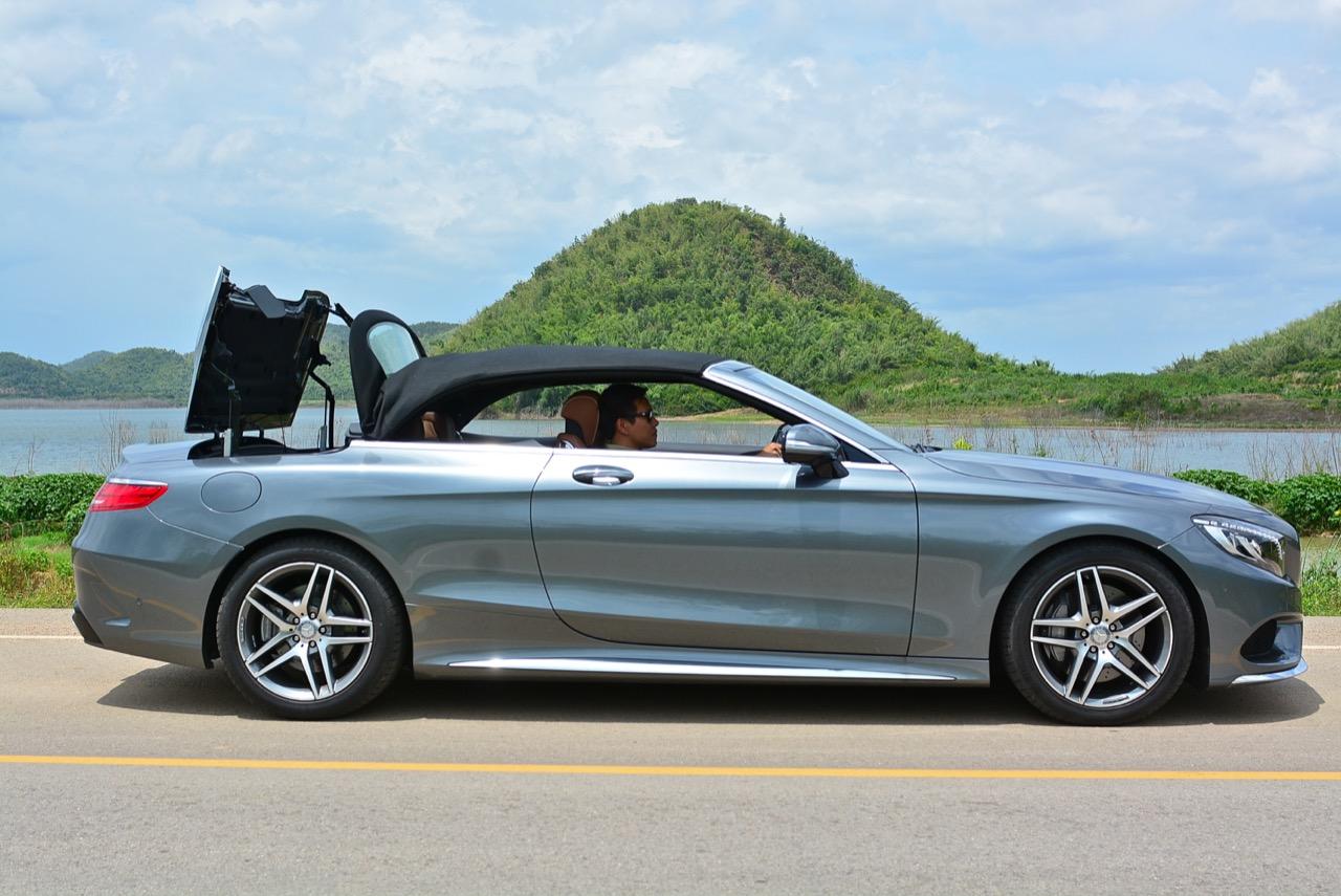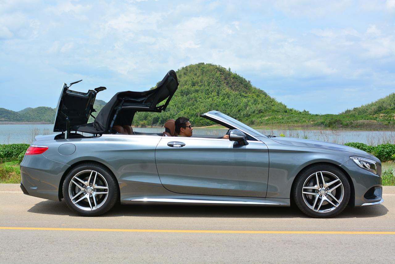 MERCEDES BENZ S500 CABRIOLET AMG PREMIUM ใช้หลังคาผ้าใบความหนาถึงสามชั้น เป็นหลังคาผ้าแบบแรกของโลกที่เก็บเสียงได้ดีสูสีกับรุ่นหลังคาแข็ง หลังคาผ้าใบยังคงความคลาสสิกจากมุมมองที่ย้อนไปในอดีตผสมกับเทคโนโลยีของระบบขับเคลื่อนที่ทันสมัยใหม่เอี่ยม ซึ่งดีพอๆ กับรถคู่แข่งที่มีราคาแพงกว่า ความสวยงามของการออกแบบจากส่วนหน้าที่ยาวและลาดเทมากกว่าเดิม