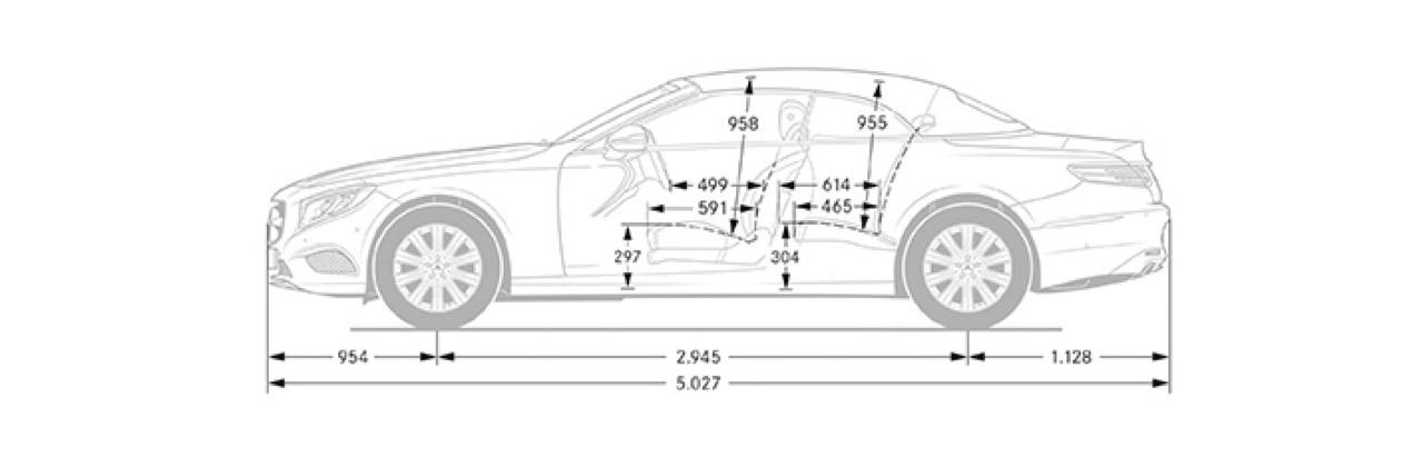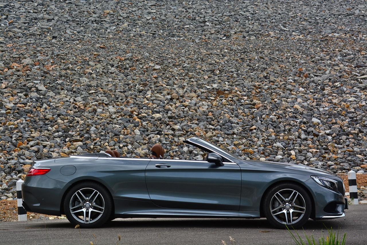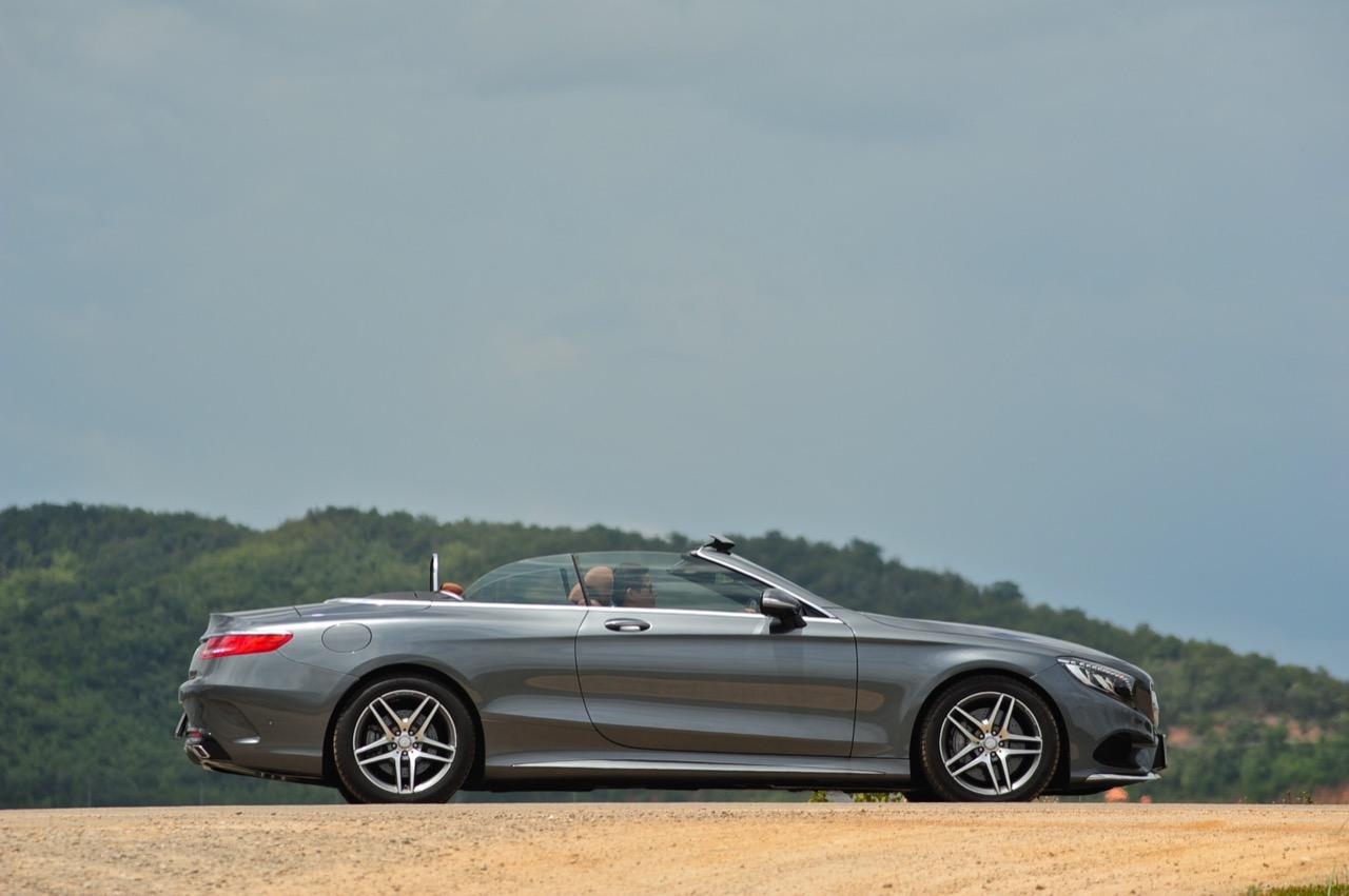 เป็น S500 CABRIOLET ที่ใช้ทรงส่วนหน้าของ S-CLASS COUPE C217 ทรงด้านข้างไหลลื่นมีเส้นข้างตัวถังที่แสดงออกถึงพลังจากขอบด้านข้างของไฟหน้าลากไปจนถึงบริเวณเหนือซุ้มล้อหลัง เสาหน้าลาดเอียงอย่างสมส่วน และสอดรับกับทรงของหลังคาผ้าใบเมื่อกางปิด บานประตูขึ้นรูปด้วยอะลูมิเนียมมีความยาวมากกว่ารุ่น 4 ประตู ไฟท้ายของเจ้า S500 CABRIOLET เป็นไฟแบบ LED ออกแบบให้เข้ากับบั้นท้ายและส่วนท้ายอย่างกลมกลืน มันใหญ่กว่า E-CLASS E300 CABRIOLET แค่นิดเดียว ทำให้ดูไม่เทอะทะใหญ่โตเกินไปจนน่าเกลียด