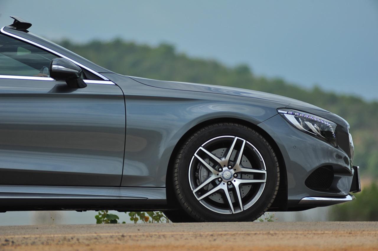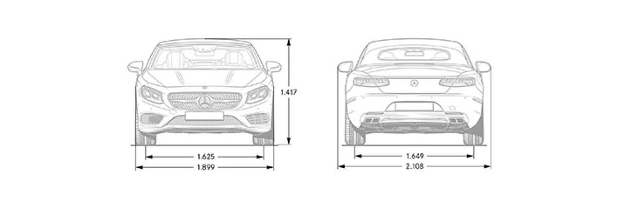 มิติตัวถังของป๋าเปิดหลังคามีความกว้าง 1,899 มิลลิเมตร นึกว่าจะกว้างกว่านี้ แต่พอขับแล้วก้รู้สึกพอดิบพอดี ไม่กว้างมากจนเข้าซอยแคบๆ ลำบาก ส่วนความยาว 5,027 มิลลิเมตร ยาวกว่า E-CLASS ECABRIOLET เล็กน้อย สำหรับสัดส่วนของความสูงอยู่ที่ตัวเลข 1,411 มิลลิเมตร สูงราวกับรุ่นซาลูนสี่ประตูเลยทีเดียว S500 CABRIOLET AMG PREMIUM ติดตั้งสปอยเลอร์หน้าและหลังของ AMG ท่อระบายไอเสีย AMG ดิฟฟูเซอร์หลังหรือแผ่นครีบรีดอากาศใต้สปอยเลอร์หลังของ AMG ล้ออัลลอย AMG ขอบ 19 นิ้ว ไม่เล็กเกินไปหรือใหญ่จนทำให้รู้สึกสะเทือน ล้อลายสวยห่อรัดด้วยยาง Goodyear Eagle Efficientgrip ยางหน้าไซส์ 245/45 R19 100Y ส่วนยางหลังซึ่งเป็นล้อขับเคลื่อนเล่นไซส์ใหญ่ขึ้นที่ 275/40 R19 101Y