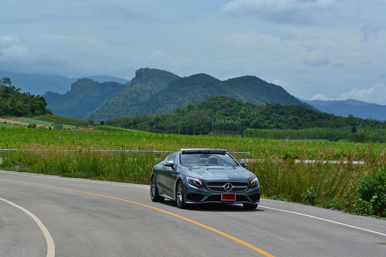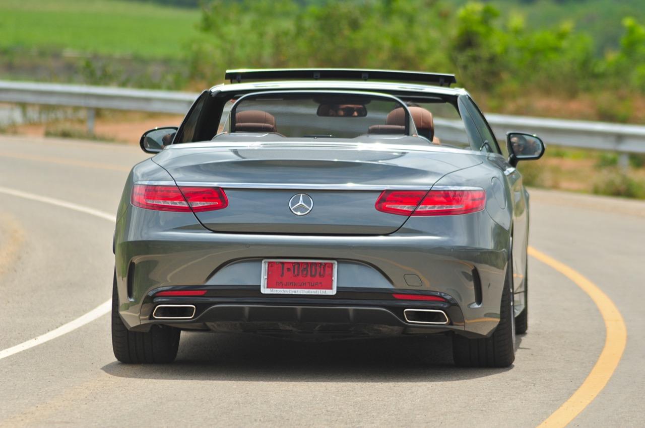 แม้ว่าเจ้าของรถจะไม่ได้ต้องการความประหยัดอะไรมากนัก แต่เกียร์ 9G-TRONIC ก็เข้ามาช่วยลดรอบเครื่องยนต์เมื่อวิ่งด้วยความเร็วคงที่ ในย่าน 120 กิโลเมตรต่อชั่วโมงเจ้า S500 เปิดประทุนมีรอบเครื่องยนต์แค่ 1,200 รอบต่อนาที ทำให้การใช้ความเร็วคงที่เดินทางมีความประหยัดเป็นของแถมให้ จะอยากได้หรือไม่ก็ตามถ้าวิ่งทางไกลไหลไปเรื่อยเครื่องไซส์โตกับเกียร์ 9 สปีดก็จะจัดให้จนพออกพอใจ เครื่องยนต์ V8 เทอร์โบคู่ กำลัง 455 แรงม้า แม้จะเปิดหลังคาวิ่งแล้วกดคันเร่งกันเต็มๆ เสียงเครื่องออกมานิ่มๆ ครางเบาๆ ในลักษณะสุภาพชน ไม่ใช่รถจิ๊กโก๋ที่ชอบแผดเสียงสนั่นจนทำให้ชาวบ้านร้านตลาดเกิดความรำคาญ เครื่อง V8 ในรอบสูงครางแต่พองามแบบผู้ดี แต่ที่ไม่เบาก็คือความเร็วที่เพิ่มขึ้นเรื่อยๆ เผลอแวบเดียวก็แตะย่าน 200 กิโลเมตรต่อชั่วโมงจนต้องเบรกกันตัวโก่งตัวงอ โหมด SPORT ลากรอบยาวได้สาแก่ใจดีแต่อยากให้ท่อมีเสียงที่เร้าใจมากกว่านี้อีกนิด ส่วนเกียร์ก็เตรียมความพร้อมสูงสุดสำหรับการขับซิ่งบนเจ้ายักษ์เปิดหลังคาคันนี้ มันจะคาอยู่ในเกียร์ที่มีแรงบิดเยอะนานกว่าปกติ ถ้าไม่ห่วงเรื่องกินน้ำมัน SPORT MODE ให้การตอบสนองที่ดีเกินไปจนบางครั้งถึงกับล้นเพราะแรงบิดที่ปล่อยลงล้อหลังนั้นไม่ธรรมดา