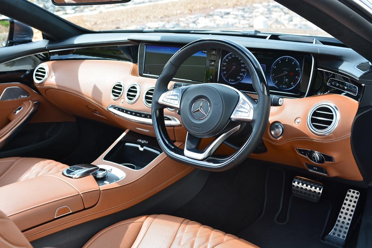 ความงดงามของห้องโดยสารใน S500 CABRIOLET เทียบได้กับงานวิจิตรศิลป์ ไล่เรียงจากแดชบอร์ดคอนโซลออกแนวขรึมแบบผู้ใหญ่ เบาะหนังสีน้ำตาล Designo ตัดเย็บอย่างประณีตบรรจง เป็นเบาะที่นั่งสบายหายห่วง แม้จะขับไกลเป็น 1,000 กิโลเมตรก็ช่วยลดอาการเมื่อยล้าได้ดี เบาะหลังมีพื้นที่พอสมควร ใช้นั่งได้จริงๆ ไม่ได้สร้างมาสำหรับหมาชิวาวาหรือหมาปั๊ก งานอัลลอยที่ประดับประดาเพิ่มความน่ามอง ไม่ว่าจะเป็นกรวยลำโพงเลอค่า ช่องแอร์ ชิ้นงานที่กรุรอบๆ ชุดควบคุมอุณหภูมิ แดชบอร์ดคล้ายกับ S-Class ซาลูนมาครบทั้งจอภาพมาตรวัดและจอภาพแสดงผลที่เชื่อมติดกันคล้ายเป็นจอผืนเดียวกัน แต่จริงๆ แล้วแยกออกเป็นสองจอ คอนโซลกลางกั้นพื้นที่ของเบาะผู้โดยสารทั้งตอนหน้าไปจนถึงเบาะหลังก็ยังแบ่งโซนชัดเจนคล้ายกับรถคูเป้ของ Rolls Royce แป้นเบรก แป้นคันเร่งและที่พักเท้าทำจากอะลูมิเนียมมีตุ่มยางกันลื่นสีดำ