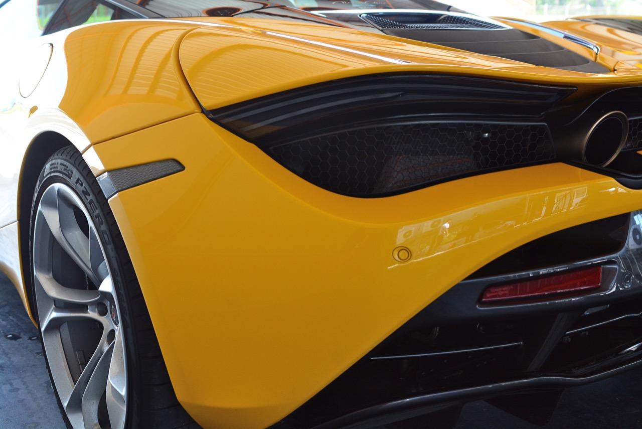 มองจากด้านข้าง ตามปกติ ซุปเปอร์คาร์จะต้องมีช่องรับอากาศด้านข้างโตๆ โดยเฉพาะพวกที่วางตำแหน่งเครื่องยนต์เอาไว้ที่กลางลำตัว แต่รูปทรงของ 720S กลับแบนติดดินและไหลลื่นจนมองไม่เห็นเครื่องยนต์ทั้งจากด้านหลังและด้านข้าง คุณจะต้องเดินเข้ามาใกล้ๆ รถ แล้วมองลงไปที่ประตู ถึงจะเห็นว่าไส้ในของประตูคาร์บอนมันกลวง ในความกลวงนี้ บอดี้ของรถในส่วนนี้จะทำหน้าที่ลำเลียงอากาศเข้าสู่รูรับอากาศที่ซ่อนเอาไว้อย่างแนบเนียน คุณต้องมองจากมุมหน้าเฉียงขึ้นด้านบนถึงจะเห็น นี่คือรายละเอียดที่มีความสลับซับซ้อนจากงานวิศวกรรมที่ McLAREN พยายามนำเสนอกับลูกค้าผู้แสนดีและมีเงินเยอะ (มาก)