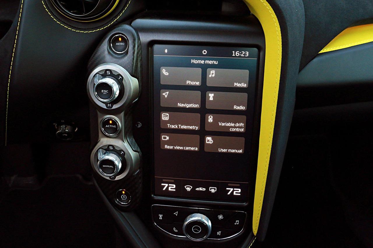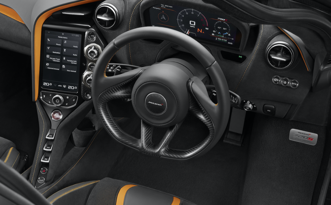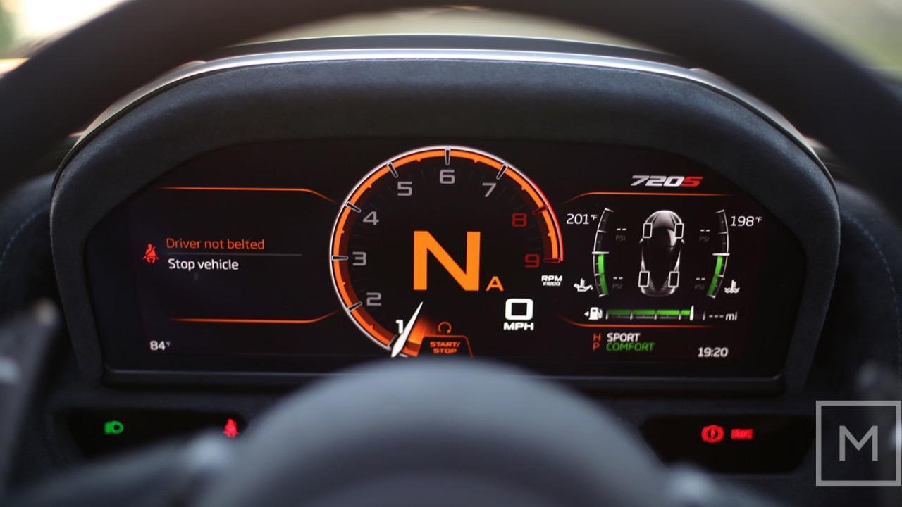 ระบบสวิตช์ควบคุมความบันเทิงของเดิมที่อยู่ใน MP4-12C กับ 650S คือระบบ IRIS ซึ่งใช้ยากและทำงานช้า แต่ระบบของ 720S เปลี่ยนมาใช้ McLAREN Driver Interface (MDI) ซึ่งใช้มือปัดจอไปมาแล้วตอบสนองไวมาก ใช้งานง่ายขึ้น บนจอกลางนั้นสามารถแสดงค่าการทำงานได้ 3 ฟังก์ชันพร้อมกัน ชอบให้อันไหนอยู่บนหรือล่างก็เอามือเลื่อนได้ และทีเด็ดที่เหนือกว่า IRIS มากคือ ถ้ามันมีอะไรบนจอกลางแล้วคุณอยากให้ข้อมูลนั้นไปอยู่บนหน้าปัดด้วย ก็แค่เอามือกดจอกลางตรงฟังก์ชันนั้นๆ ค้างไว้ แล้วจะมีคำสั่งโผล่มาให้เลือกกด Export แล้วไม่ว่าจะเป็นวิทยุ เพลงที่เล่น หรือระบบนำทางที่เลือก มันก็จะไปโชว์บนหน้าปัดด้วย