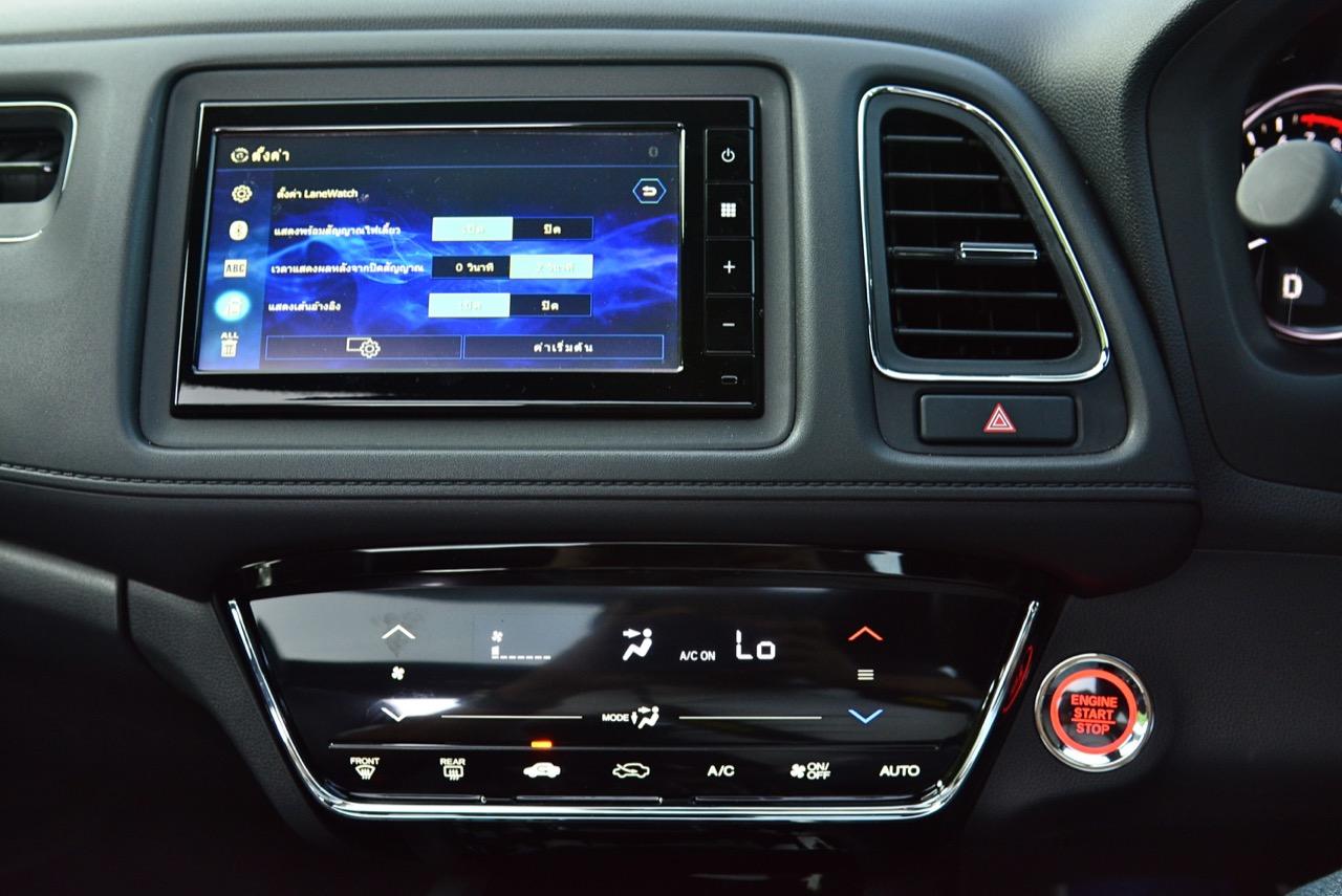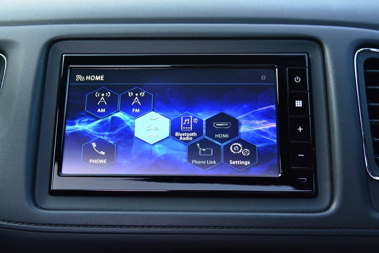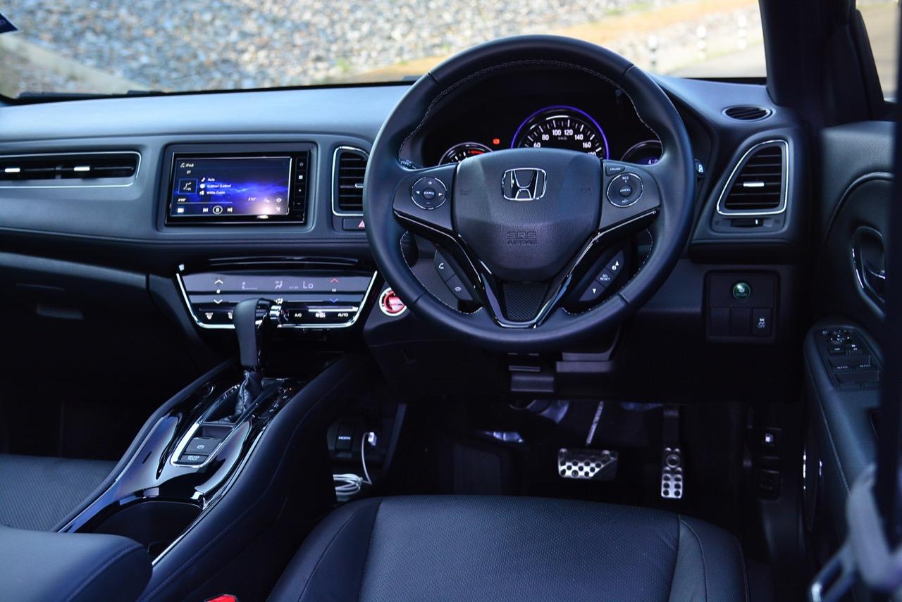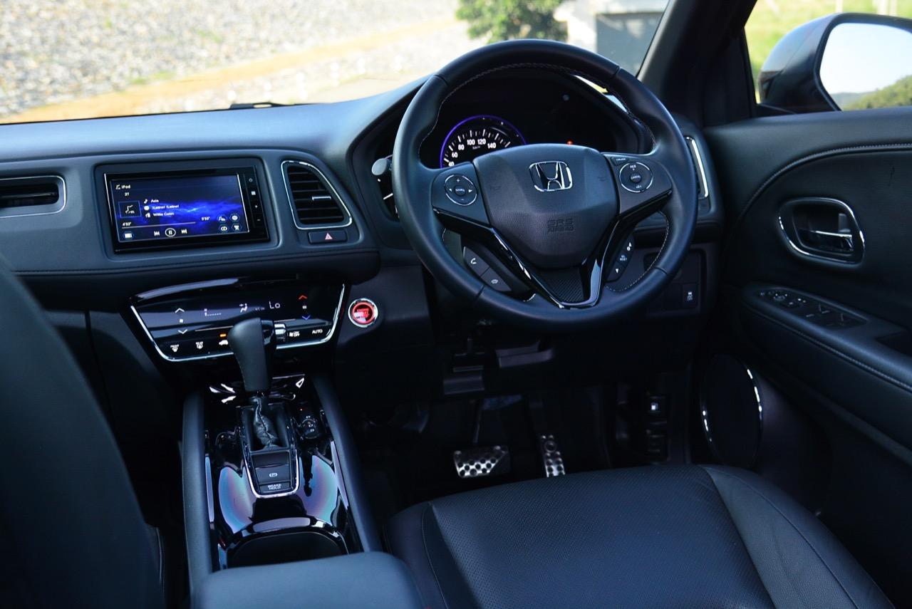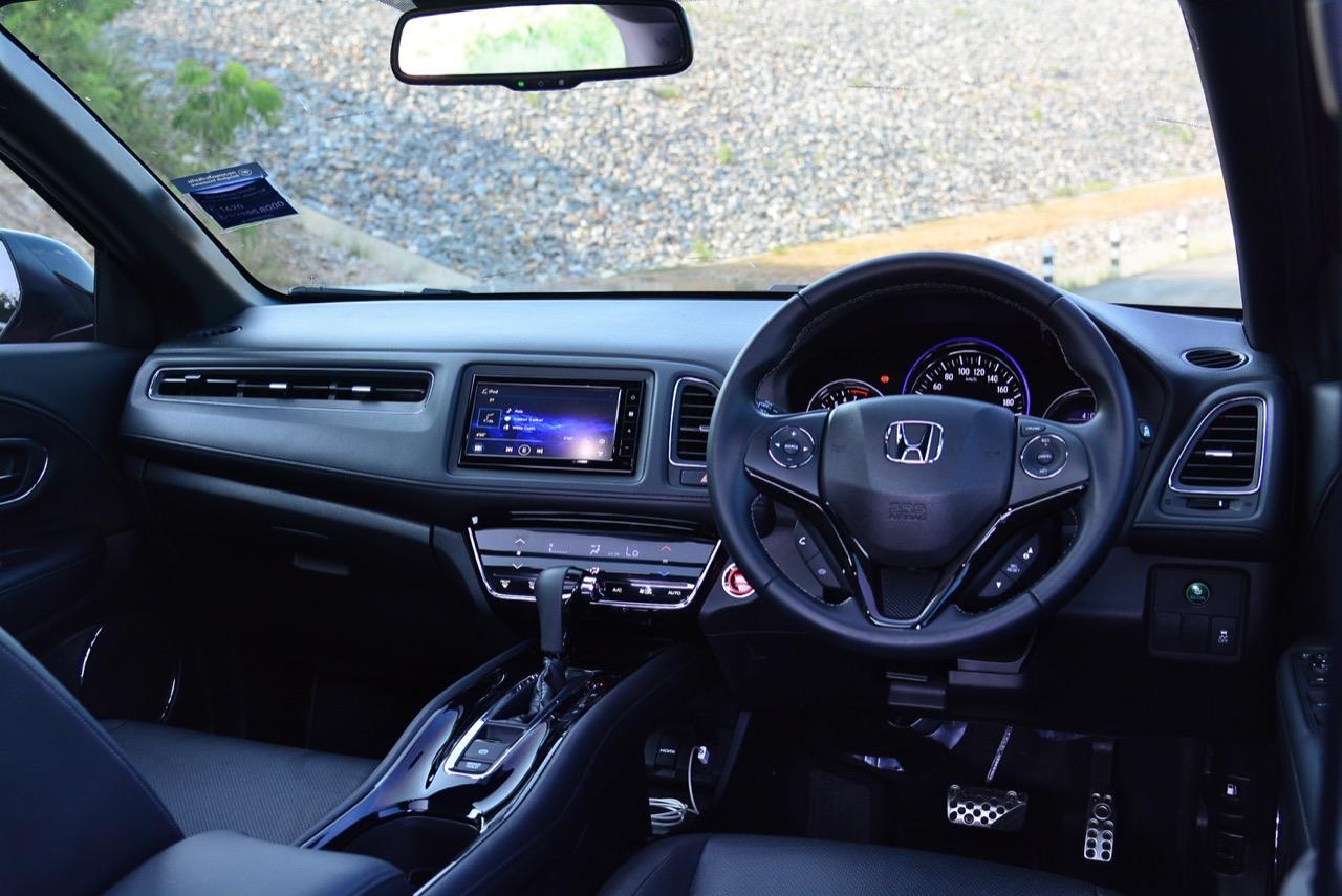 HR-V มีงานตกแต่งภายในแบบเรียบๆ ซึ่งเป็นสไตล์ของ Honda มาตรวัดทรงกลมสามวงมีทั้งวัดรอบ วัดความเร็วและจอภาพ MID พวงมาลัย 3 ก้านแบบสปอร์ตมีแป้น Paddle Shift เบาะนุ่มนั่งสบาย เบาะหลังที่กลายเป็นจุดเด่นมีพื้นที่มากกว่าคู่แข่ง จอภาพมอนิเตอร์หน้าตาบ้านๆ วางตำแหน่งอยู่ด้านบนของแผงควบคุมอุณหภูมิแบบระบบสัมผัสที่หน้าจอ คันเกียร์และซุ้มเกียร์ ออกแบบให้กั้นพื้นที่ระหว่างคนขับและผู้โดยสารเบาะหน้า