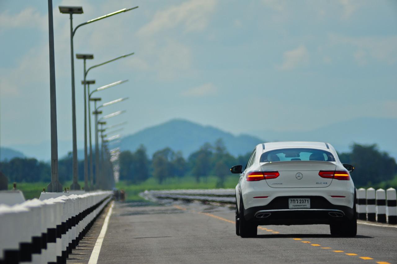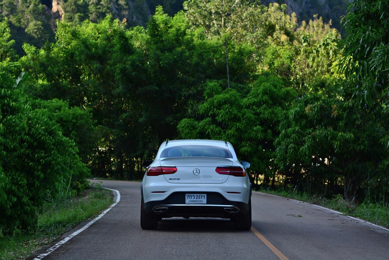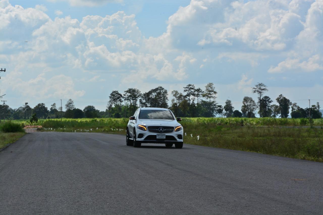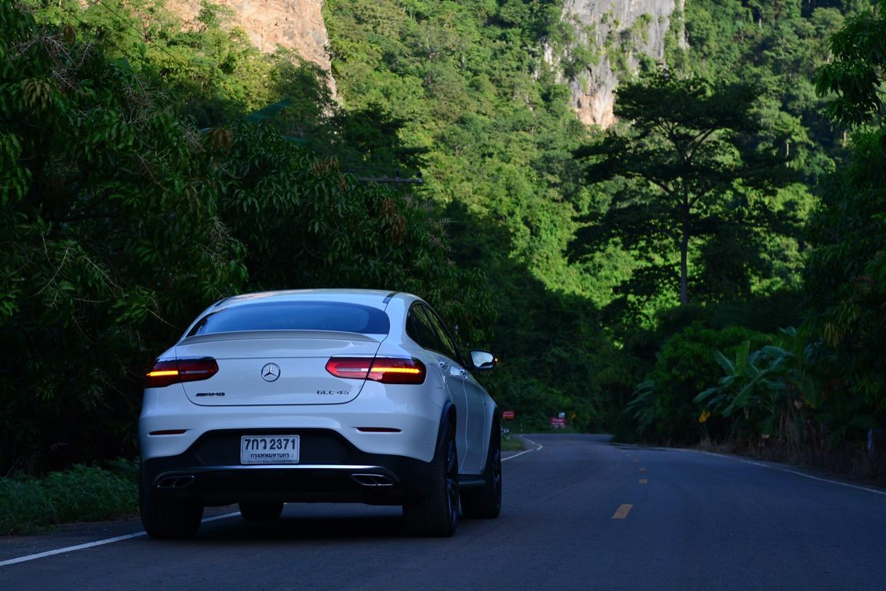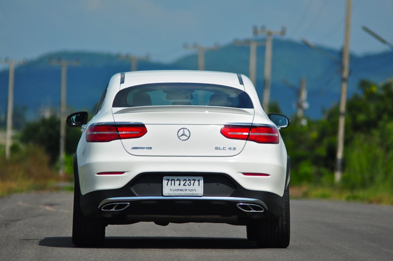 การขับที่ดีงามของมัน ทำให้ไปเหมือนกับรถแฮตช์แบ็กแรงๆ มากกว่าจะเป็น SUV ท้ายลาดแบบ Coupe ผมสามารถหักพวงมาลัยเข้าโค้งได้ค่อนข้างเร็วกว่ารถทั่วๆ ไปแต่ก็ไม่ควรจะประมาทกับจักรกลของ AMG ที่อาจแว้งได้ทุกเมื่อถ้าใส่มาแรงเกินไป GLC43 เป็นรถที่คล่องตัวมากกว่า Mercedes Benz GLE Coupe รุ่นพี่อย่างเห็นได้ชัด พวงมาลัยไฟฟ้าในโหมดสูงสุดให้สัมผัสที่หนักแน่นและมีความเป็นธรรมชาติ ทำให้เกิดความรู้สึกมั่นใจเมื่อใช้ความเร็ว เมื่อเข้าโค้งเร็วขึ้น ก็จะรู้สึกได้ถึงแรงบิดที่ส่งถ่ายไปยังล้อทั้งสี่ที่ขึ้นตรงกับการทำงานของเซนเซอร์เฉลี่ยแรงบิดที่มีส่วนช่วยดึงรถกลับเข้าเส้นทาง
