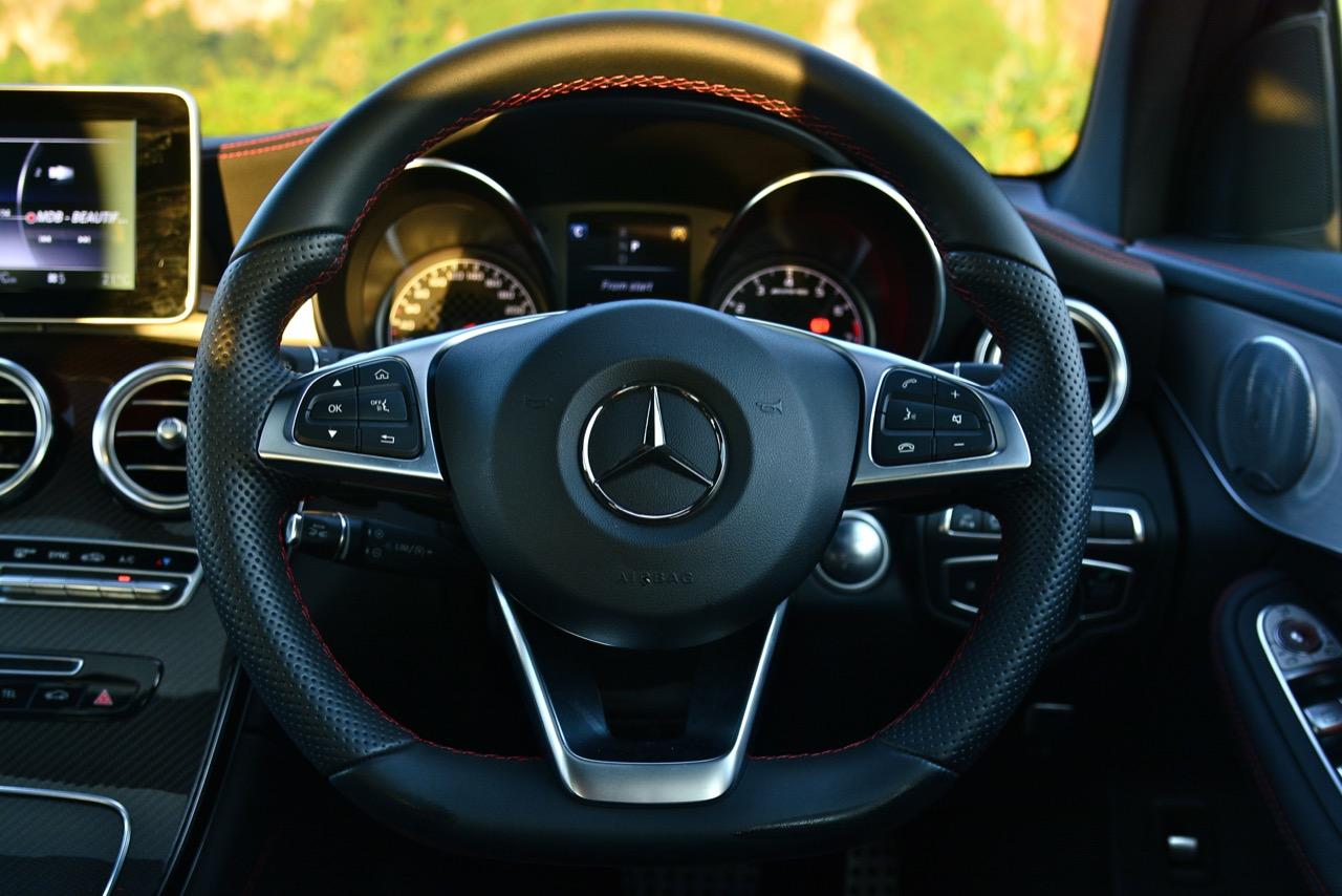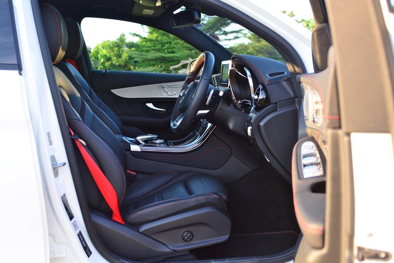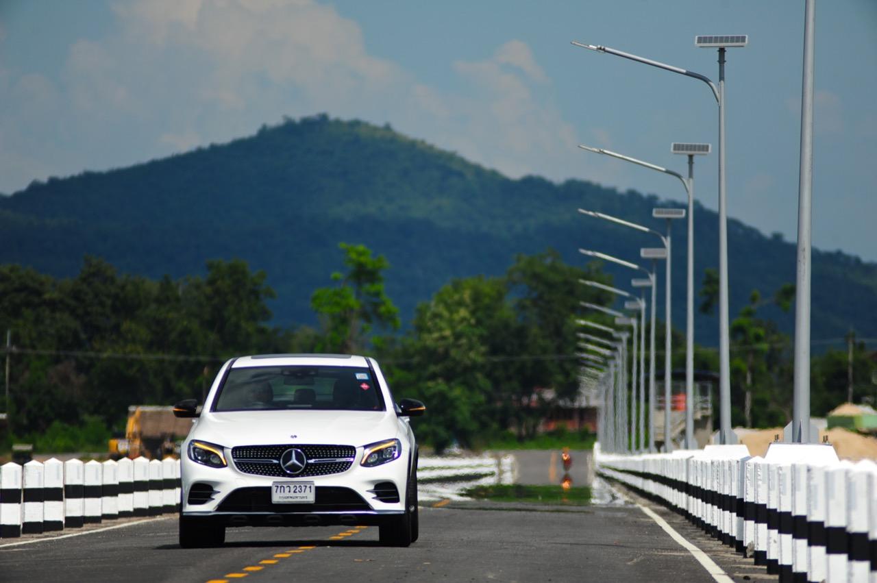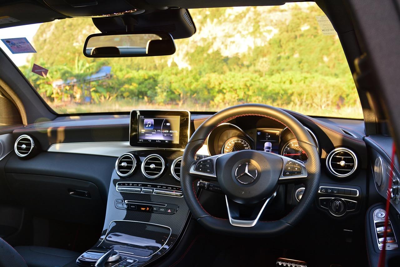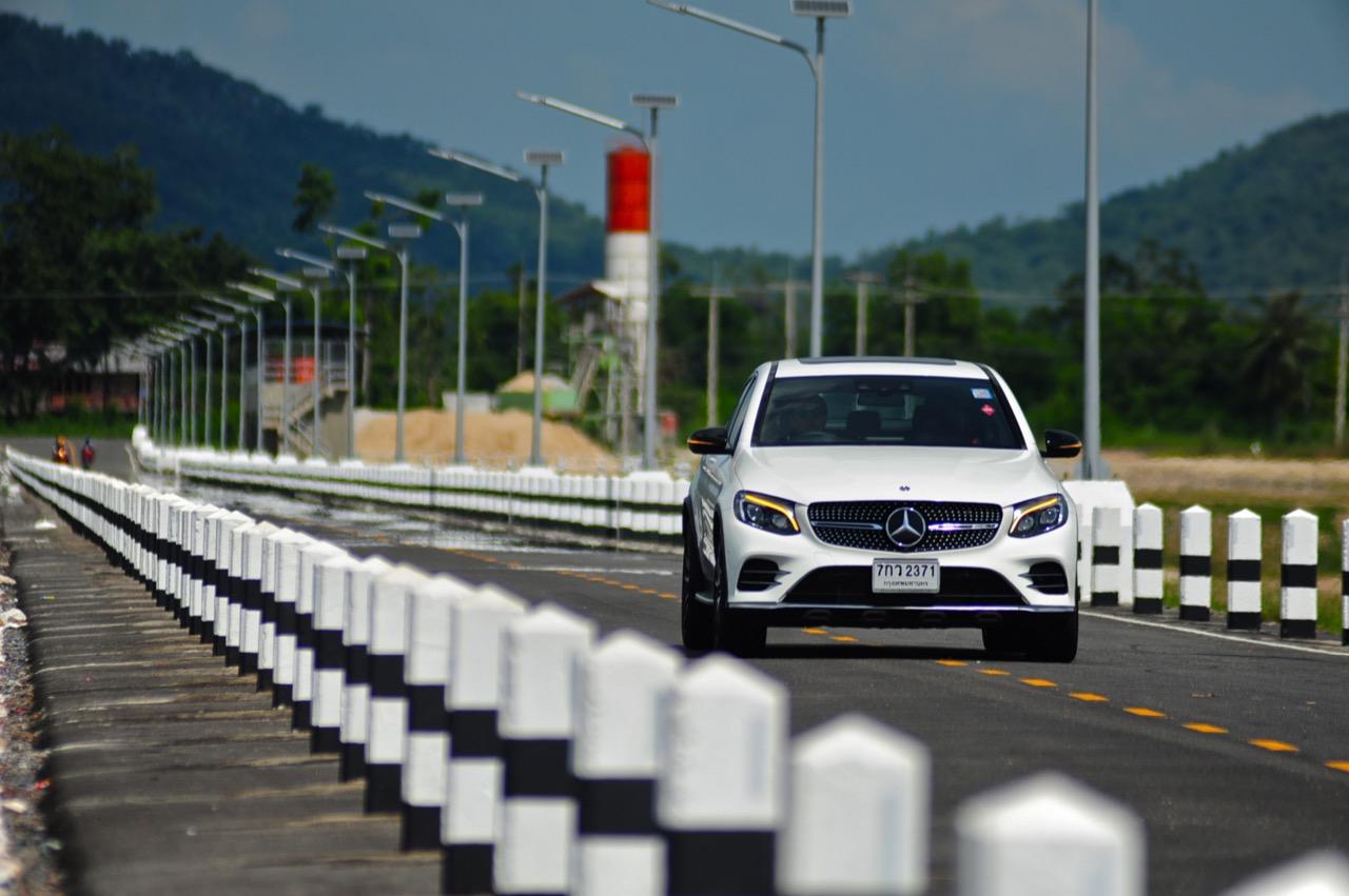 การขับที่ดีงามของมัน ทำให้ไปเหมือนกับรถแฮตช์แบ็กแรงๆ มากกว่าจะเป็น SUV ท้ายลาดแบบ Coupe ผมสามารถหักพวงมาลัยเข้าโค้งได้ค่อนข้างเร็วกว่ารถทั่วๆ ไปแต่ก็ไม่ควรจะประมาทกับจักรกลของ AMG ที่อาจแว้งได้ทุกเมื่อถ้าใส่มาแรงเกินไป GLC43 เป็นรถที่คล่องตัวมากกว่า Mercedes Benz GLE Coupe รุ่นพี่อย่างเห็นได้ชัด พวงมาลัยไฟฟ้าในโหมดสูงสุดให้สัมผัสที่หนักแน่นและมีความเป็นธรรมชาติ ทำให้เกิดความรู้สึกมั่นใจเมื่อใช้ความเร็ว เมื่อเข้าโค้งเร็วขึ้น ก็จะรู้สึกได้ถึงแรงบิดที่ส่งถ่ายไปยังล้อทั้งสี่ที่ขึ้นตรงกับการทำงานของเซนเซอร์เฉลี่ยแรงบิดที่มีส่วนช่วยดึงรถกลับเข้าเส้นทาง