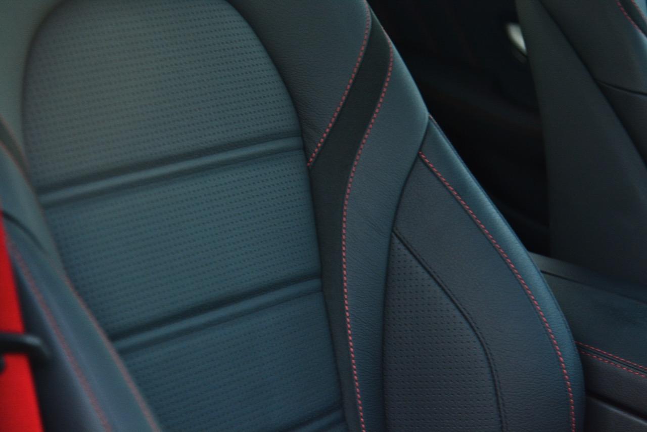 เบาะนั่งคู่หน้าปรับไฟฟ้าพร้อมหน่วยบันทึกความจำ 2 ตำแหน่ง แป้นเหยียบทั้งคันเร่ง และเบรกแบบสปอร์ตทำจากสเตนเลสมีปุ่มยางกันลื่น เบาะหนัง DINAMICA -ARTICO จัดพรมรองพื้น AMG สีดำที่มีขอบสีแดงและตัวอักษร "AMG" รวมทั้งการเย็บปักถักร้อยที่ตัดกันของด้ายสีแดงบนหนังสีเทาเข้ม
