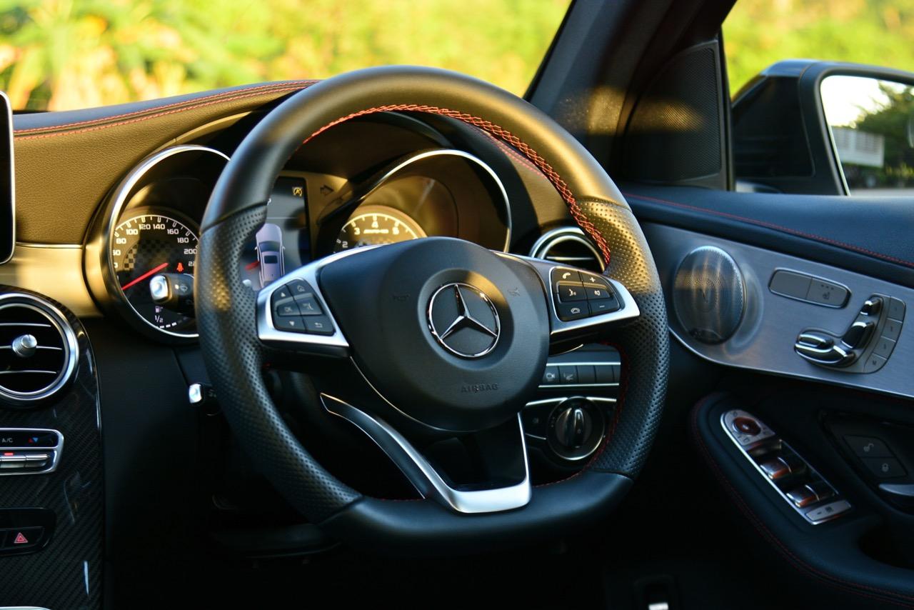 ห้องโดยสารแบบพรีเมียมของ Mercedes-AMG GLC 43 4MATIC Coupé มีอุปกรณ์มาตรฐานของ AMG ติดตั้งมาให้จากโรงงาน เช่น พวงมาลัยสปอร์ต 3 ก้านปรับสูง-ต่ำและไกล-ใกล้ได้ด้วยระบบไฟฟ้า เป็นพวงมาลัยมัลติฟังก์ชั่นหุ้มหนังแท้สีดำเย็บเดินตะเข็บด้วยด้ายสีแดงตามสไตล์ของ AMG หลังวงพวงมาลัยยังมีแป้นเปลี่ยนตำแหน่งเกียร์ Paddle Shift เพื่อความเมามันในการเปลี่ยนอัตราทดของเกียร์ 9-G Tronic