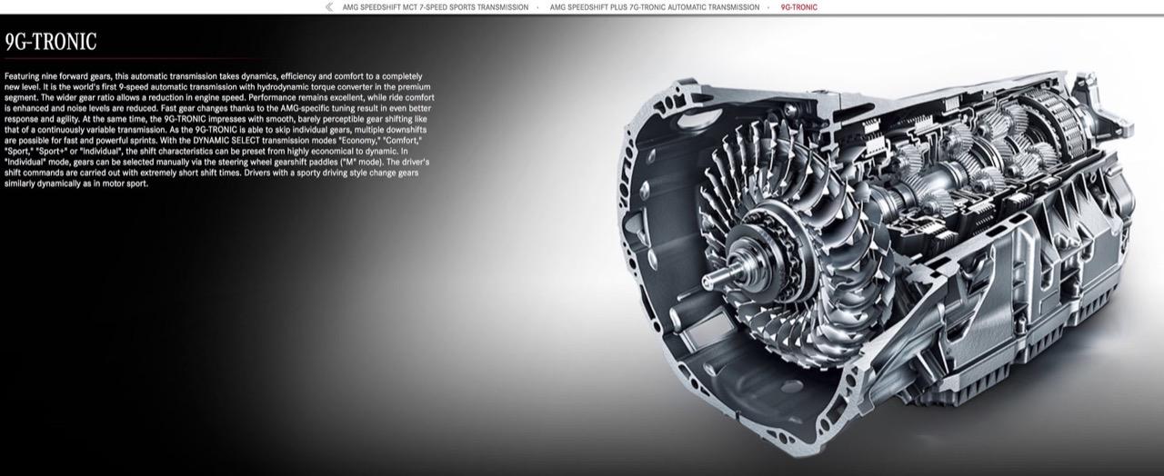 เกียร์ 9-G Tronic พ่วงกลไกขับเคลื่อน 4 ล้อ เข้ามาเปลี่ยนแปลงประสิทธิภาพและความสะดวกสบาย ถือเป็นเกียร์อัตโนมัติแบบ 9 สปีดตัวแรกของโลกที่มีตัวแปลงแรงบิด hydrodynamic torque converter ออกแบบให้มีอัตราทดของเกียร์ที่ครอบคลุมกับแรงบิดที่ถ่ายเทมาจากเครื่องยนต์ อัตราทดที่กว้างขึ้นของเกียร์ 9 หรือเกียร์โอเวอร์ไดรฟ์ช่วยลดรอบเครื่องยนต์ทำให้ประหยัดเชื้อเพลิงเมื่อวิ่งด้วยความเร็วคงที่บนทางไฮเวย์ 9-G Tronic เป็นชุดส่งกำลังที่มีประสิทธิภาพการทำงานดีเยี่ยม ไหลลื่นและไม่มีอาการกระตุกกระชาก เปลี่ยนเกียร์ในโหมด auto หรือเปลี่ยนเกียร์ผ่าน Paddle Shift ได้เร็วขึ้นจากการปรับแต่งของสำนัก AMG ช่วยทำให้ชุดส่งกำลังตอบสนองอย่างว่องไว เกียร์ AMG SPEEDSHIFT MCT 9-G Tronic ออกแบบให้ทำงานได้อย่างรวดเร็ว สามารถกระโดดข้ามเกียร์ จากเกียร์ 9 ลงมาที่เกียร์ 7 และเกียร์ 5 ได้จากกลไกภายในที่ออกแบบมาเป็นพิเศษ ทำงานได้หลายระดับสำหรับการวิ่งแบบสลับทั้งเร็วและช้าได้อย่างมีประสิทธิภาพ