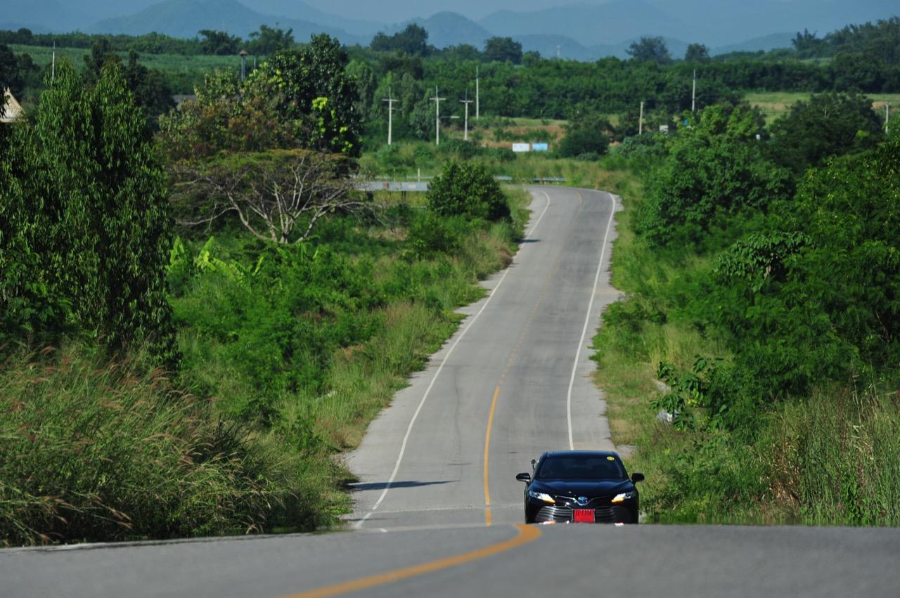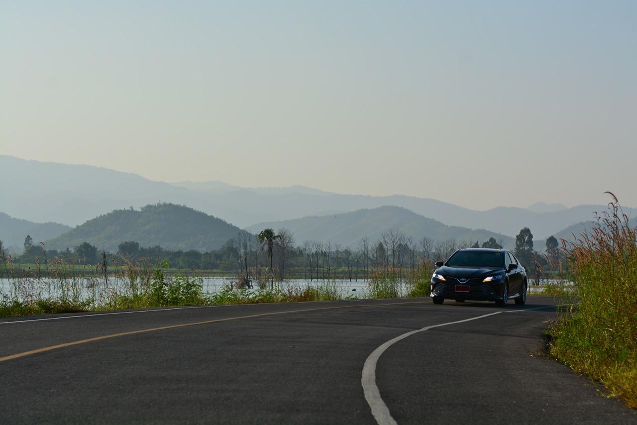 ท่ามกลางหุบเขาที่สงบและงดงามของจังหวัดกาญจนบุรี Camry รุ่นใหม่ 2.5 HV Premium ฟื้นคืนชีพด้วยแชสซีใหม่เอี่ยมอ่อง พร้อมการจูนระบบรองรับที่ลงตัวสุดๆ ทำให้มันสามารถรับมือได้กับทุกสถานการณ์ที่เกิดขึ้นตรงหน้า จากกรุงเทพมหานครใช้เวลาขับมายังอำเภอหนองปรือ เกือบๆ 3 ชั่วโมง เป็นห้วงเวลาที่ New Camry พยายามถ่ายทอดสัมผัสหลังพวงมาลัยออกมาให้ผมได้ซึมซับรับรู้ ช่วงล่างหนึบและนุ่มจนทำให้รู้สึกแปลกใจ เครื่องยนต์ที่มีระบบไฮบริดผสมผสานการทำงานระหว่างการจุดระเบิดเพื่อสันดาปเผาไหม้เชื้อเพลิงพร้อมๆ ไปกับการหมุนอย่างรวดเร็วของมอเตอร์ไฟฟ้า เมื่อทั้งสองระบบสอดประสานทำงานไปพร้อมๆ กัน มันทำให้ผมกระโจนไปข้างหน้าอย่างรวดเร็ว การจุ่มคันเร่งลงไปจนมิด เจ้า Camry 2.5 HV Premium ตอบสนองกลับอย่างว่องไวด้วยอัตราเร่งที่ดีและการถ่ายเทน้ำหนักขณะขับเข้าโค้งอย่างเสถียร Toyota น่าจะทำรถแบบ Fun to Drive ออกมาตั้งนานแล้ว ไม่ควรปล่อยให้ยอดขายหล่นแล้วค่อยมาคิดทำ!
