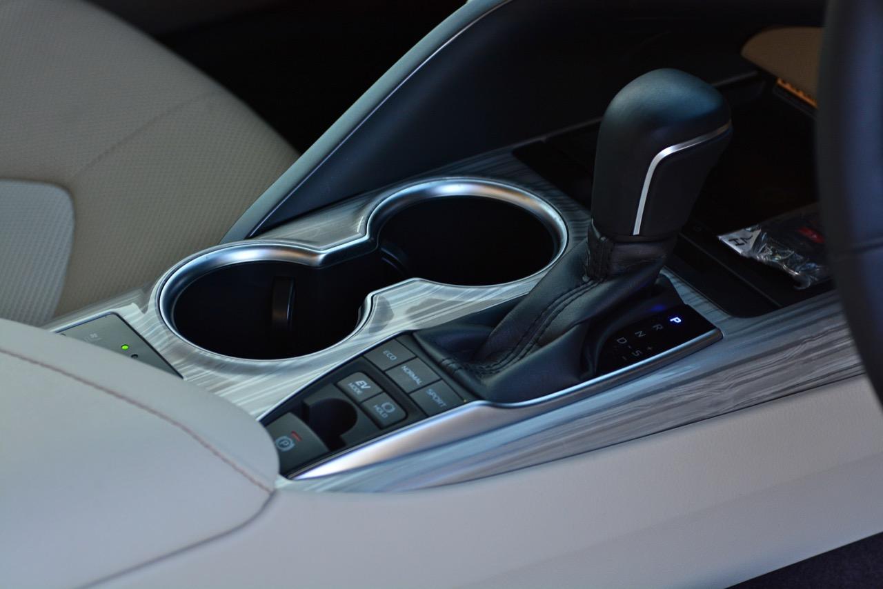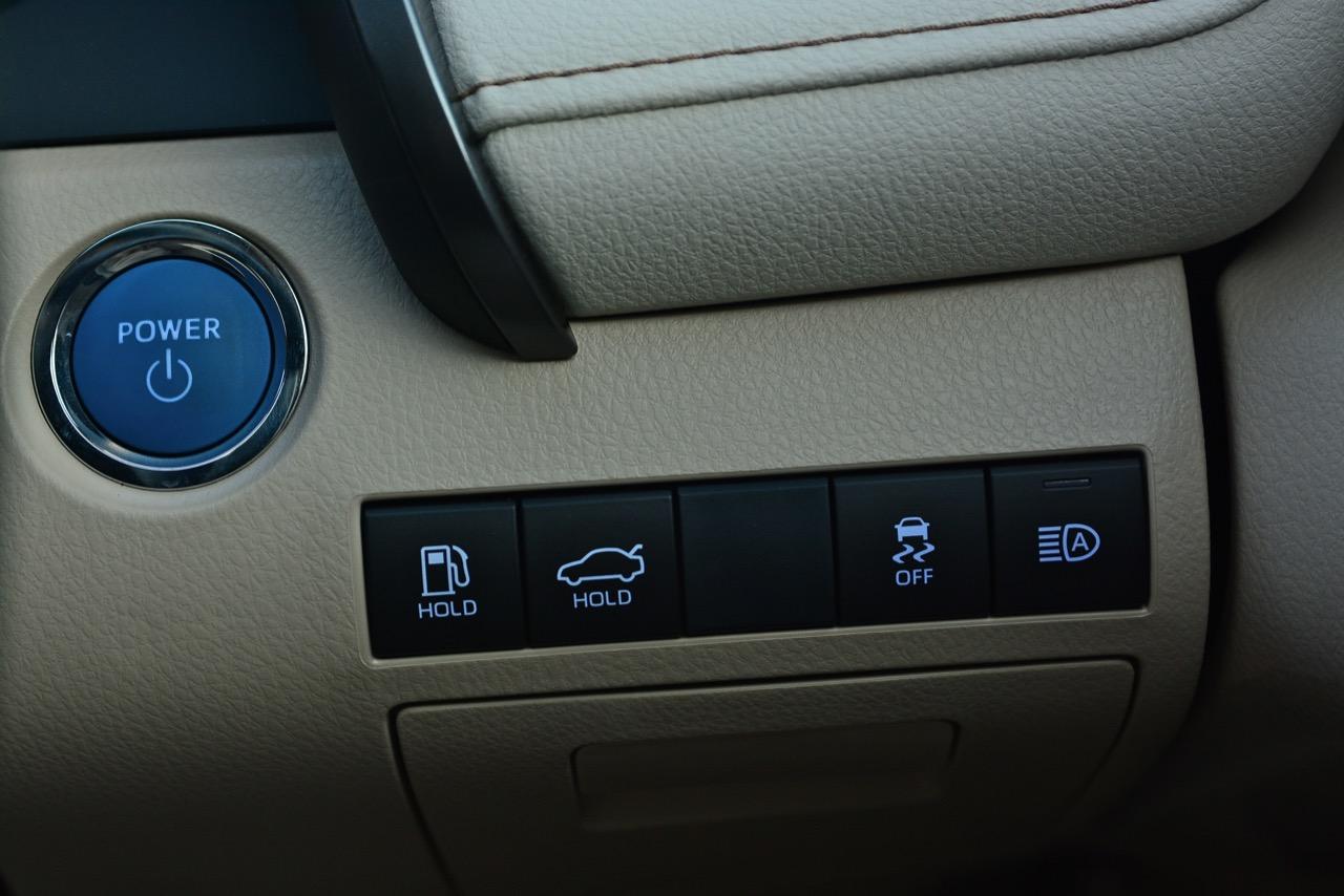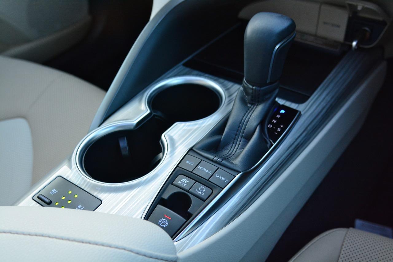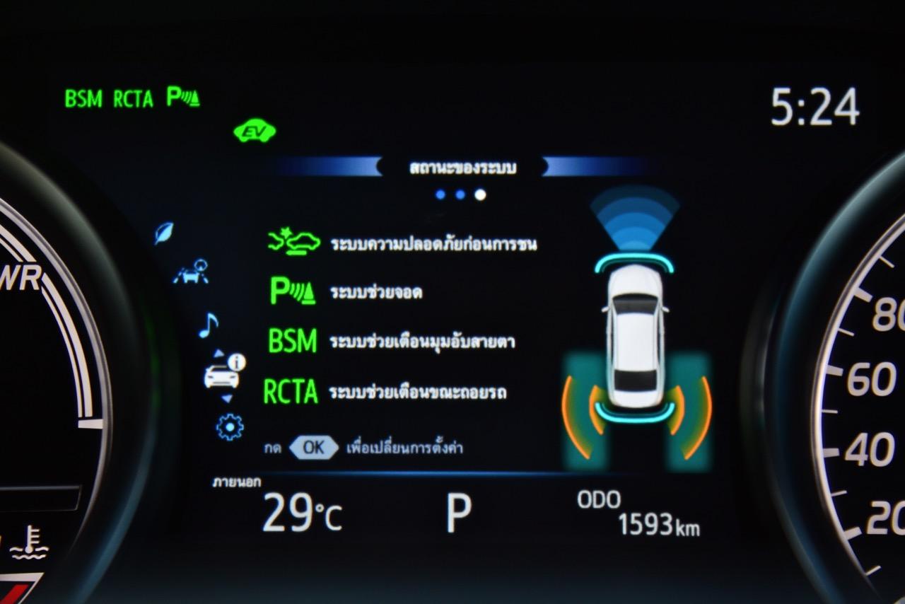 เกียร์อัตโนมัติ E-CVT นั้น วิศวกรของ Toyota ได้ทำการทดสอบและพิสูจน์แล้วว่าคู่ควรกับรถไฮบริดเป็นอย่างยิ่ง เกียร์สายพานของมันทำงานได้อย่างไหลลื่น ปราศจากอาการย้วยหรือกระตุกกระชาก โดยเฉพาะอาการย้วยแตกที่น่าเบื่อนั้นหายไปอย่างสิ้นเชิง! และตอบสนองต่อการเปลี่ยนเกียร์ผ่าน Paddle เร็วใช้ได้ ช่วยทำให้ประหยัดเชื้อเพลิงทั้งในและนอกเมือง เพื่อนๆ สื่อมวลชนที่รับรถไปทดสอบทำอัตราสิ้นเปลืองได้ถึง 20 กิโลเมตรต่อลิตร แต่ผมกลับทำได้แค่ 14.8 กิโลเมตรต่อลิตร เนื่องจากแช่และจุ่มคันเร่งอย่างต่อเนื่องตลอดเส้นทางทดสอบ ราวกับเอาหินก้อนโตมาทับคันเร่งไว้ รวมถึงใช้งานอยู่ในโหมดสปอร์ตตลอดการขับทั้ง 4 วัน โดยไม่สนใจอัตราสิ้นเปลืองที่มีบางคนบอกว่าทำได้ถึง 25 กิโลเมตรต่อลิตร เมื่อขับในย่านความเร็วต่ำสามารถสัมผัสได้ถึงความสบายและความเนียนนุ่ม การตอบสนองต่อการคิกดาวน์ของเกียร์ E-CVT ลูกนี้ไวขึ้นอย่างชัดเจน และเมื่อใช้โหมดสปอร์ต การทำงานของเกียร์ก็จะทำงานได้ดีขึ้นเห็นๆ!