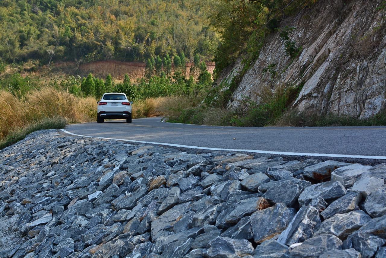 ในขณะที่ GLK รุ่นเก่านั้นมีทั้งอาการโคลงตัวกับแรงเหวี่ยงหนักๆ ในโค้ง แต่ใน New GLC 250 4MATIC ผมสามารถเข้าโค้งกว้างๆด้วยความเร็วสูงได้อย่างมั่นใจ พัฒนาการที่ก้าวกระโดดของแชสซีส์และระบบรองรับซึ่งเคยตกเป็นรองรถศัตรูตัวฉกาจอย่าง BMW X3 ในอดีต หนทางในการแก้ทางมวยที่ Mercedes Benz ทำการศึกษามาเป็นอย่างดีก็คือทำอย่างไรก็ได้เพื่อจะให้ GLC250d มีการขับขี่ที่เหนือกว่า BMW X3 หรือแม้แต่ Porsche Macan เจ้า GLC มีแชสซีที่ยอดเยี่ยม โครงสร้างของตัวรถแข็งแกร่งขึ้นมากแต่กลับมีน้ำหนักตัวที่เบาลง ฐานล้อของ GLC เมื่อเทียบกับ X3 แล้วยาวกว่าเล็กน้อยแต่ส่งผลไปถึงความรู้สึกของการนั่งและการขับที่เต็มไปด้วยความมั่นคง ช่วงล่างด้านหน้าแบบดับเบิลวิชโบนทำจากอัลลอยทั้งดุ้น แพหลังของเจ้านี่ก็ยังทำมาจากอัลลอยที่นอกจากจะเบาและแข็งแรงแล้ว ยังให้ความรู้สึกหนึบหนับราวกับทากาวไว้ที่ล้อขับเคลื่อนหลัก หากทำออกมาไม่ได้เรื่องได้ราวแบบขอไปที ระบบรองรับของรถยนต์แบบออฟโรดก็จะกลายเป็นตัวบั่นทอนสมรรถนะของตัวรถไปโดยปริยายเนื่องจากขนาดความสูง จุดที่สตรัทมีการขยับตัวอยู่บ้างและทำให้อาการของรถประเภทนี้ไม่ดีเท่ากับรถเก๋งเมื่อต้องหวดเข้าโค้งแรงๆ การปรับแต่งระบบรองรับทั้งด้านหน้าและด้านหลังให้เคลื่อนไหวได้เล็กน้อยตามต้องการ รถจึงขยับไปในทิศทางเดียวกันทั่วทั้งคันขณะเข้าโค้ง ช่วงล่างของ GLC ช่วยขจัดอาการดึงที่พวงมาลัยไม่ว่าจะเป็นตอนที่คนขับเร่งเครื่องยนต์หรือขับเข้าโค้งด้วยความเร็วสูง เป็นวิธีที่ให้ความยืดหยุ่นกับตัวรถที่ส่งผลดีต่อการควบคุมตั้งแต่ย่านความเร็วต่ำไปจนถึงความเร็วสูง