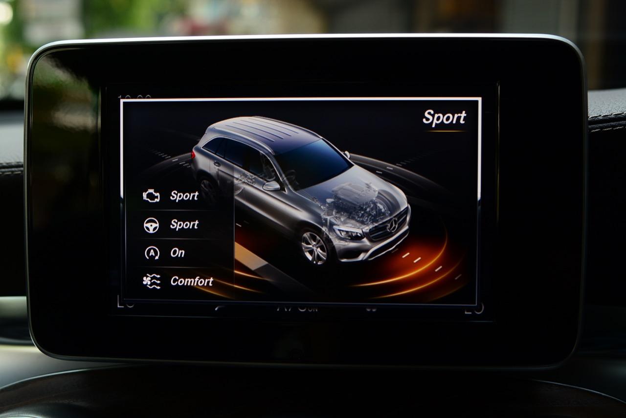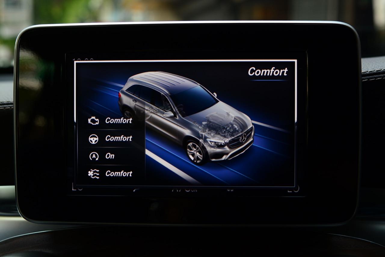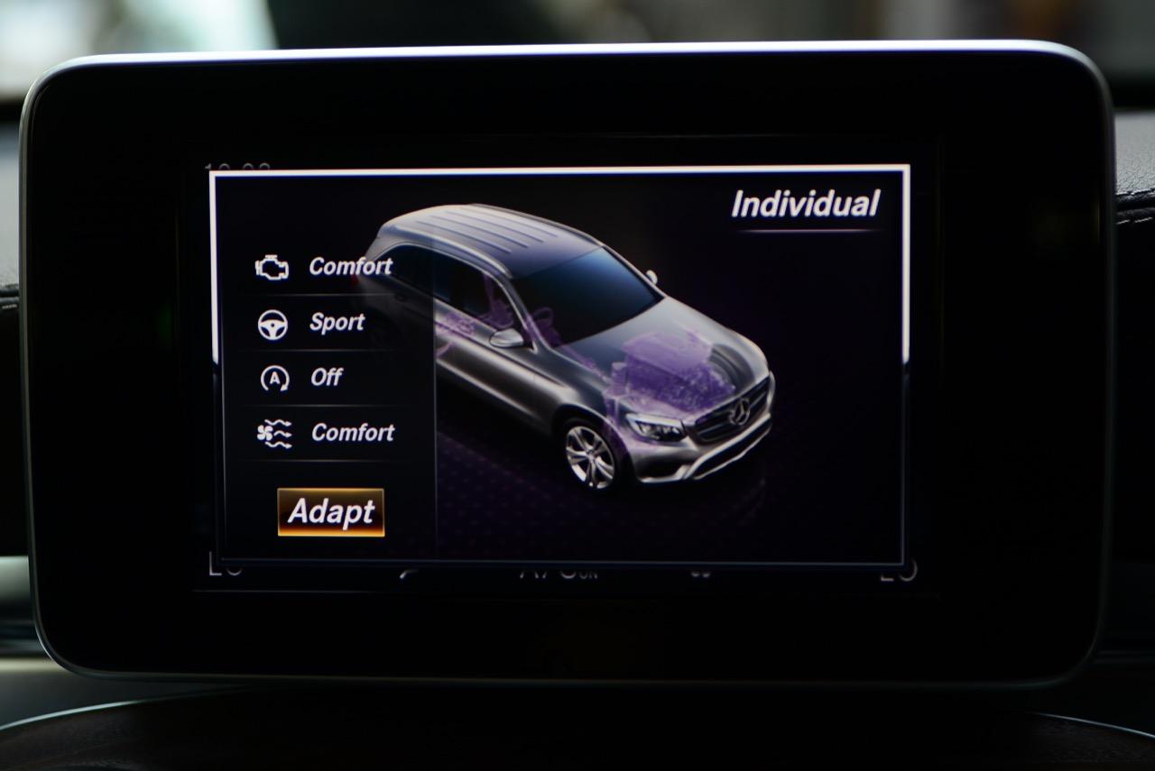 โหมดการขับเคลื่อน 5 รูปแบบปรับผ่านสวิตช์ DYNAMIC SELECT กับโปรแกรมการขับที่เป็นมาตรฐานที่ติดตั้งมาให้จากโรงงานเช่นเดียวกับ BMW X3 ที่ใช้เกียร์ ZF 8 สปีด ใน GLC250d โหมดการขับเคลื่อนเริ่มจาก ECO ที่เน้นการขับไปเรื่อยๆ เพื่อประหยัดเชื้อเพลิงด้วยคันเร่งไฟฟ้าที่ตอบสนองอย่างค่อยเป็นค่อยไปเพื่อลดอัตราสิ้นเปลือง โหมด COMFORT เป็นโหมดมาตรฐานเมื่อทำการสตาร์ตเครื่องยนต์ ใช้งานสำหรับการขับทั้งในและนอกเมืองโดยให้การตอบสนองแบบกลางๆ โหมด SPORT คันเร่งไฟฟ้าไวขึ้นและเกียร์เปลี่ยนช้าลงเพื่อคาอยู่ในตำแหน่งเกียร์ที่มีแรงบิดสูงสุด โดยเฉพาะ เกียร์ 4-5 ส่วนโหมด SPORT + ทุกสิ่งทุกอย่างของ GLC250d จะว่องไวและตอบสนองอย่างรวดเร็วสำหรับการขับที่รีบเร่งและไม่สนใจกับอัตราสิ้นเปลืองเชื้อเพลิง ส่วนโหมดสุดท้าย Individual สามารถล้วงลึกเข้าไปปรับตั้งการตอบสนองของ เครื่องยนต์ พวงมาลัย และระบบควบคุมอุณหภูมิ
