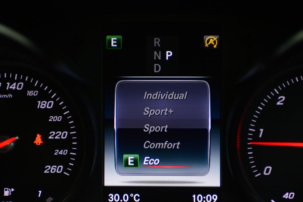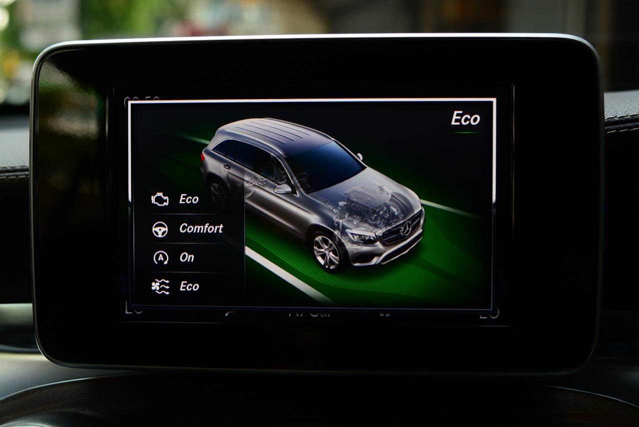 โหมด ECO ซึ่งเป็นโหมดประหยัดพลังงานสำหรับการวิ่งบนทางสายรองก่อนที่จะไปโผล่บนไฮเวย์ โหมดประหยัดใน GLC250d ให้ความรู้สึกนิ่มนวลชวนฝันแบบลอยไปเรื่อยๆบนผิวถนนเมื่อพบเจอกับทางเรียบ ในโหมดประหยัดนั้นการวิ่งแบบเรื่อยๆมาเรียงๆบน GLC คล้ายกับการทำตัวเป็นรถที่ขับได้สองแบบสองบุคลิก ขับช้าก็จะได้ความประหยัดพอขับเร็วๆ ก็จะได้ความสนุก กำลัง 204 แรงม้ากับแรงบิด 500 นิวตันเมตร มากพอที่จะกดคันเร่งแซงรถช้าแม้จะคาอยู่ในโหมดต่ำสุด การตอบสนองของพวงมาลัยนั้นแม้จะเบาสบายมือ แต่ยังมีความมั่นคงและแม่นยำจากการปรับเซตน้ำหนักของพวงมาลัยผ่าน ECU ชุดส่งกำลังแบบใหม่ 9G Tronic ที่มีอัตราทดมากถึง 9 ตำแหน่งจะปรับตัวเองไหลขึ้นไปยังเกียร์สูงหรือเกียร์ 9 อย่างรวดเร็วเพื่อลดรอบเครื่องยนต์ ระบบ Auto Start/Stop ทำงานทันทีที่ตัวรถหยุดนิ่งเมื่อขับมาจอดรอสัญญาณไฟจราจร เมื่อเครื่องยนต์ดับตัวเองลงในระหว่างที่จอดรอสัญญาณไฟเขียว ระบบปรับอากาศยังคงทำงานอย่างต่อเนื่องแต่คอมเพรสเซอร์แอร์นั้นหยุดทำงานตามเครื่องยนต์ไปด้วย หากติดไฟแดงนานๆ แล้วเซ็นเซอร์ตรวจพบว่าอุณหภูมิภายในห้องโดยสารกำลังสูงขึ้น ระบบจะสั่งให้เครื่องยนต์ติดเองแบบอัตโนมัติเพื่อทำให้คอมแอร์กลับมาทำงานอีกครั้งแล้วส่งไอเย็นกลับมาหมุนเวียนเป็นวงจรการทำงานที่มีความต่อเนื่องและราบรื่นของ GLC250d ในโหมด ECO